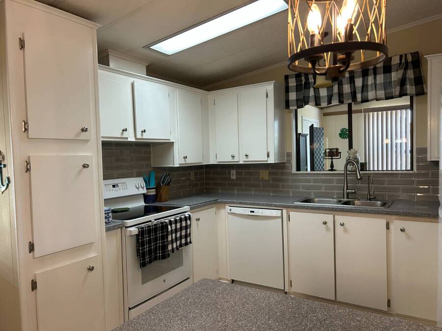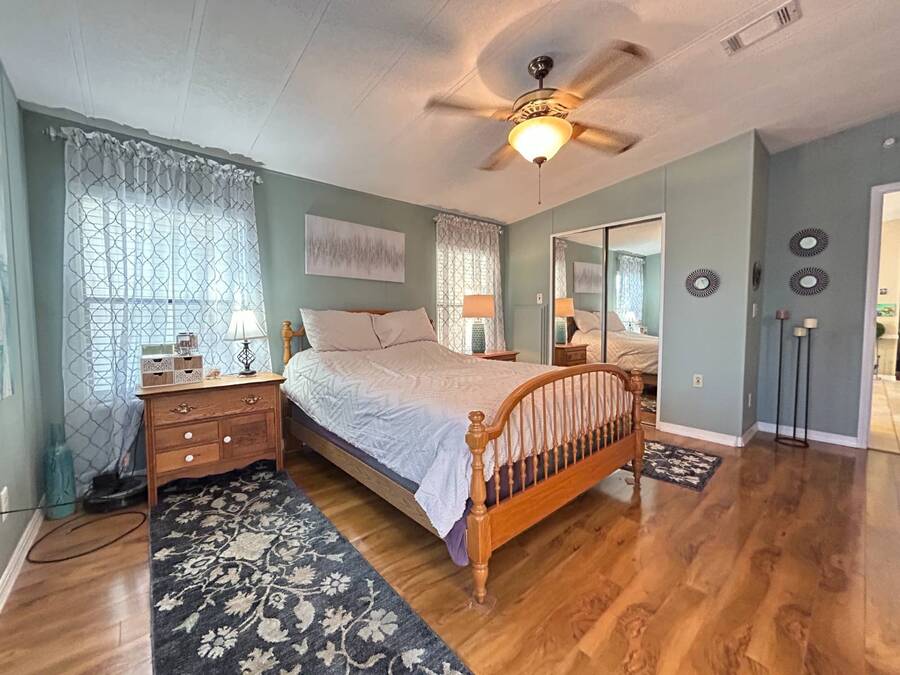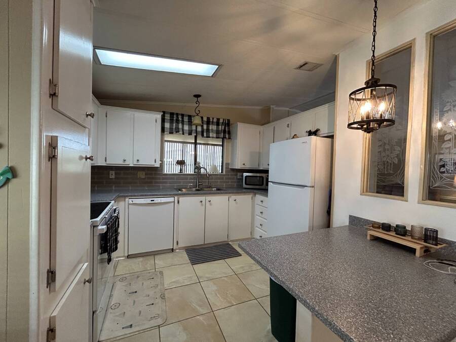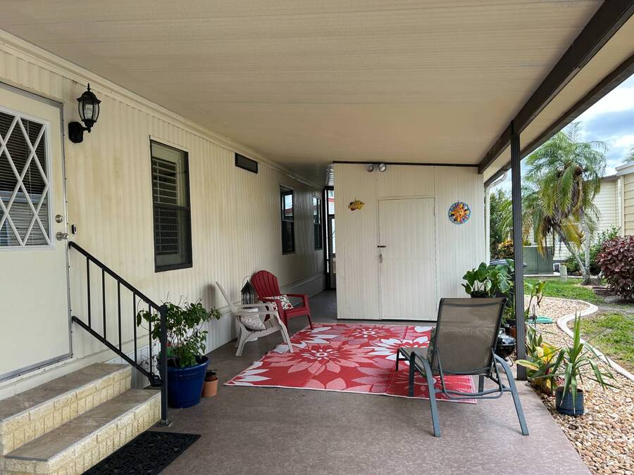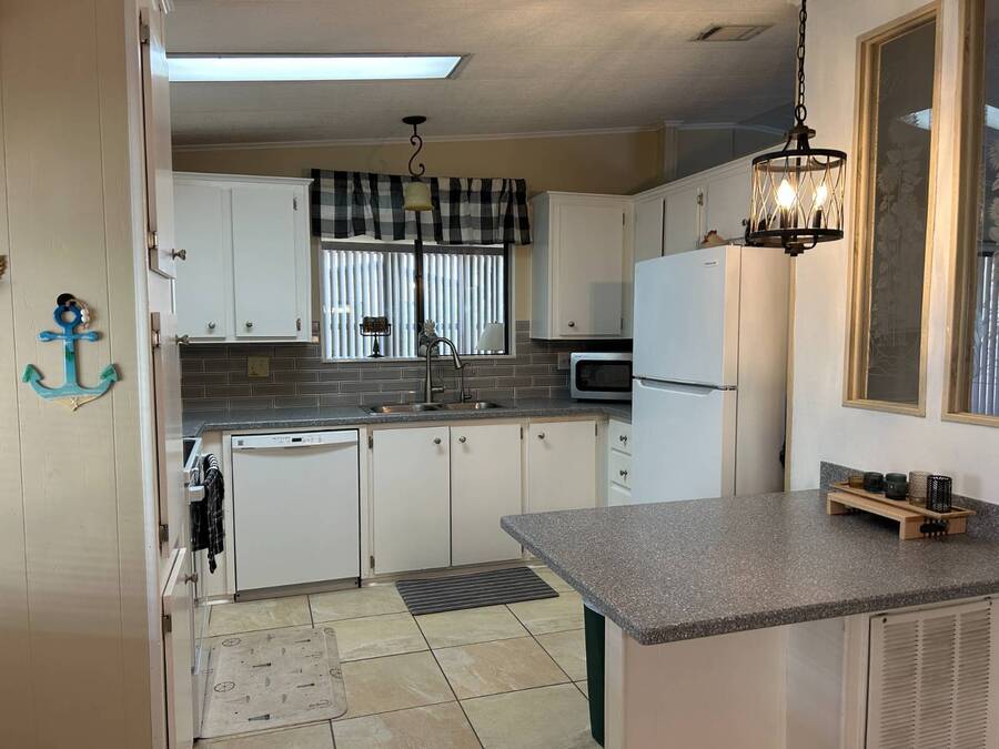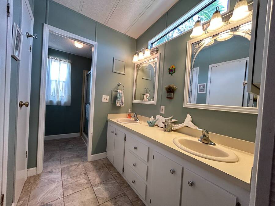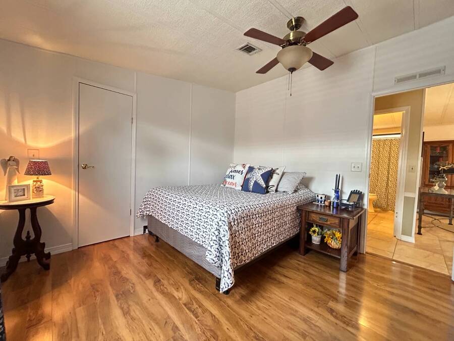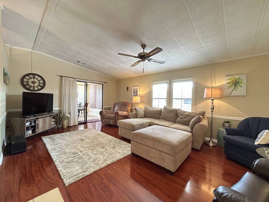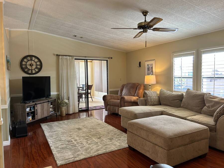 Charming 2-Bedroom, 2-Bath Home in Active Lifestyle Community Welcome to this beautifully maintained 1986 home offering 1344 sq. ft. of comfortable living space in a vibrant community filled with planned activities and opportunities to enjoy an active lifestyle. As you step inside, you'll be greeted by elegant tiled flooring in the kitchen and dining area, complemented by stunning flooring throughout the rest of the home. The kitchen has been recently upgraded with gorgeous stone countertops and stylish subway tile backsplash, making it both functional and eye-catching. The spacious living room is perfect for gathering with family and friends, while the front bonus room under air provides extra seating or a cozy space for guests to relax. The first bedroom offers a generous size with a convenient walk-in closet, and just across the hall, you'll find a full bathroom with a tub and shower enclosure. The primary suite is a true retreat, featuring a sliding closet, a walk-in closet, and a private en suite bath with dual vanities, a walk-in shower, and a charming transom window that fills the space with natural light. Additional highlights include plantation shutters, an outdoor shed with laundry (washer and dryer included), and a long carport with space for outdoor seating. This lovely home offers the perfect blend of comfort, style, and community living. Don't miss the chance to make it yours!