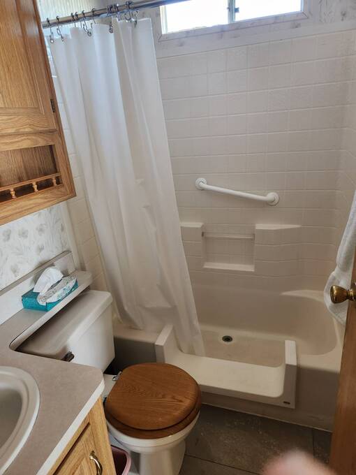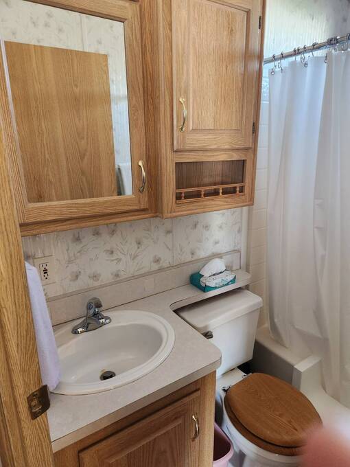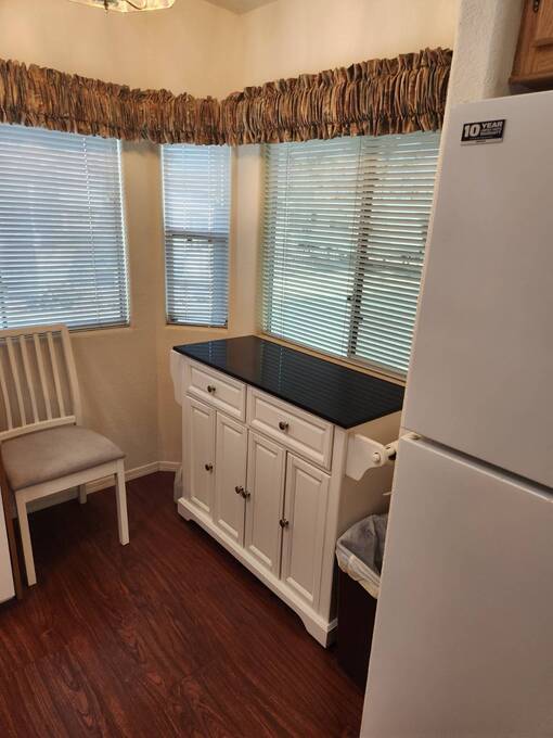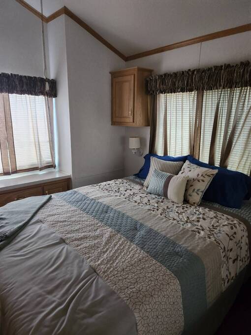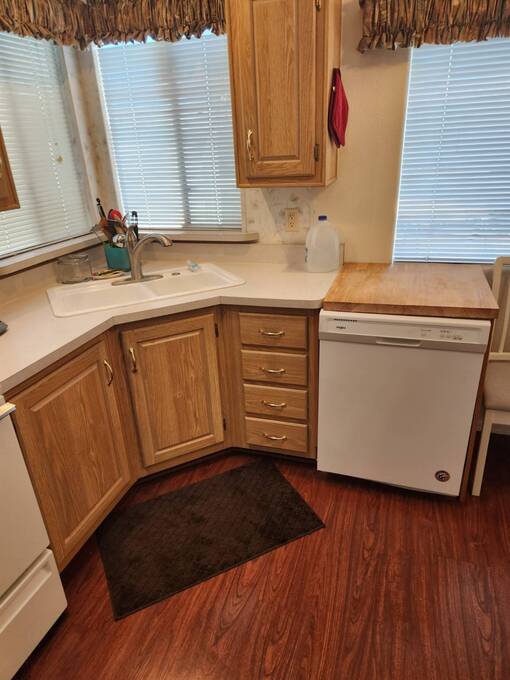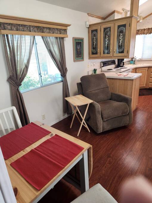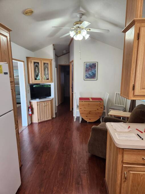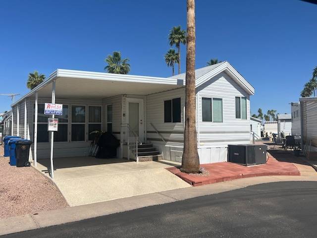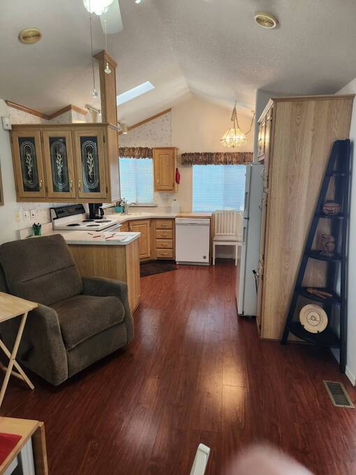 Raised AZ Room! Next to Common Area! Vaulted Ceilings, Front Kitchen, Dishwasher, Laminate Floors, China Hutch, Skylight, Blinds, Recliners, Sofa, Queen Bed, Built in Drawers, Ceiling Fans, Flat Screen TV's, Extra Half Bath, Full Size W/D, Step in Shower, Central A/C & Heat. Lot Rent Paid Until Oct 2026!