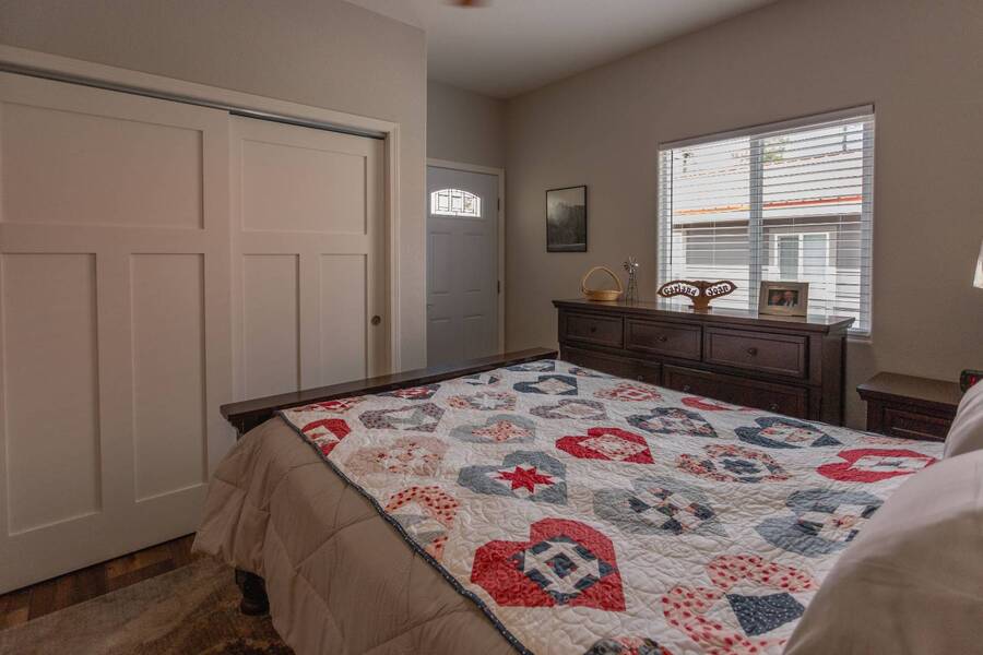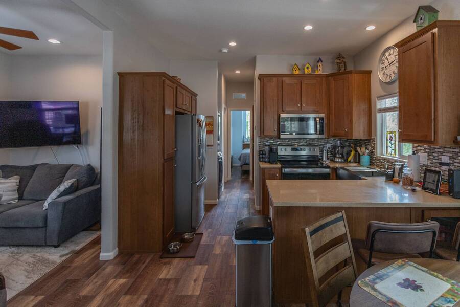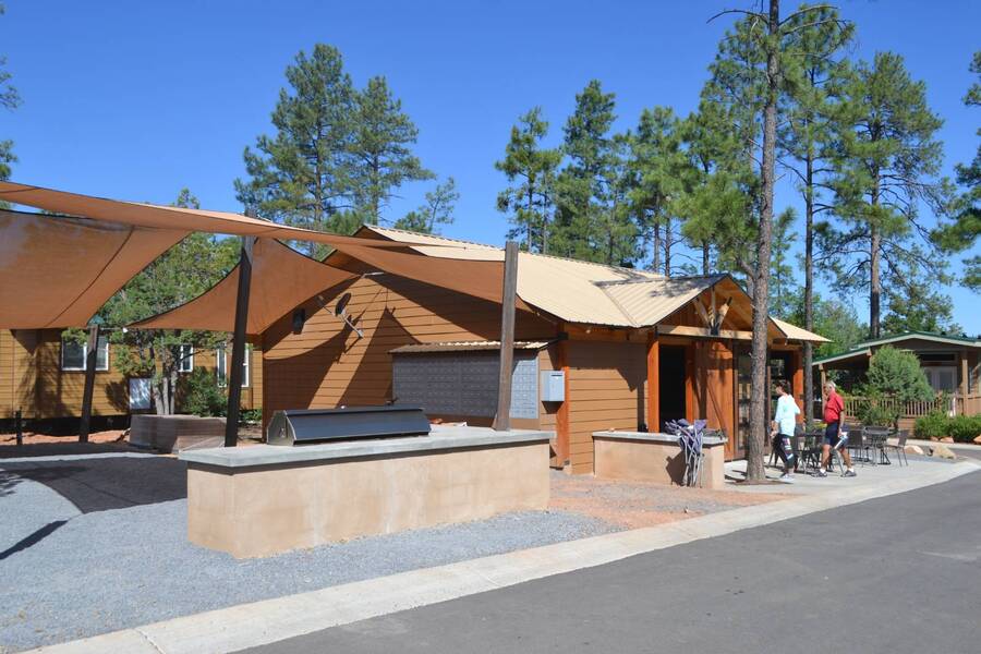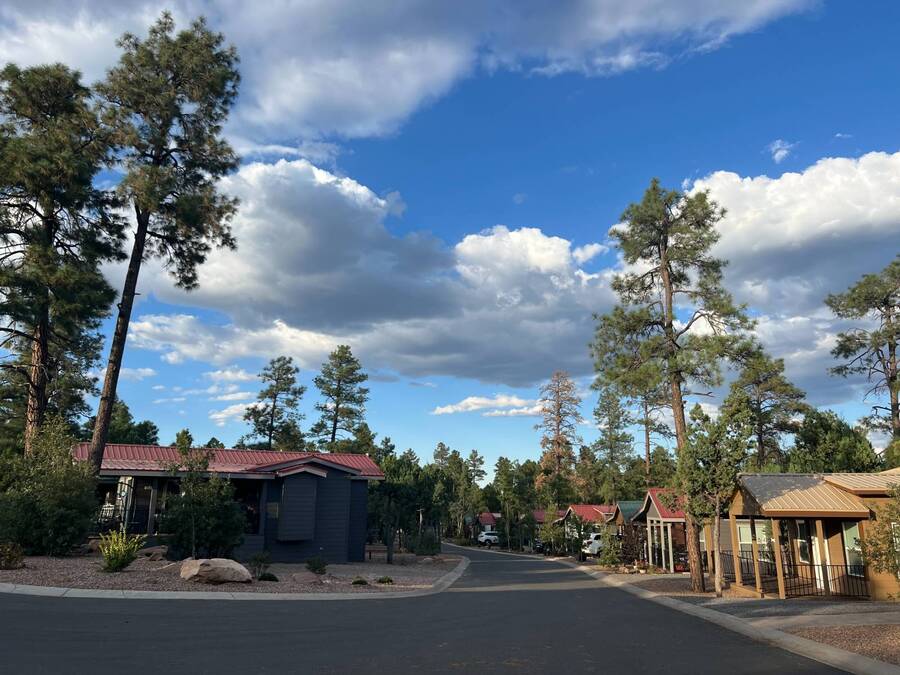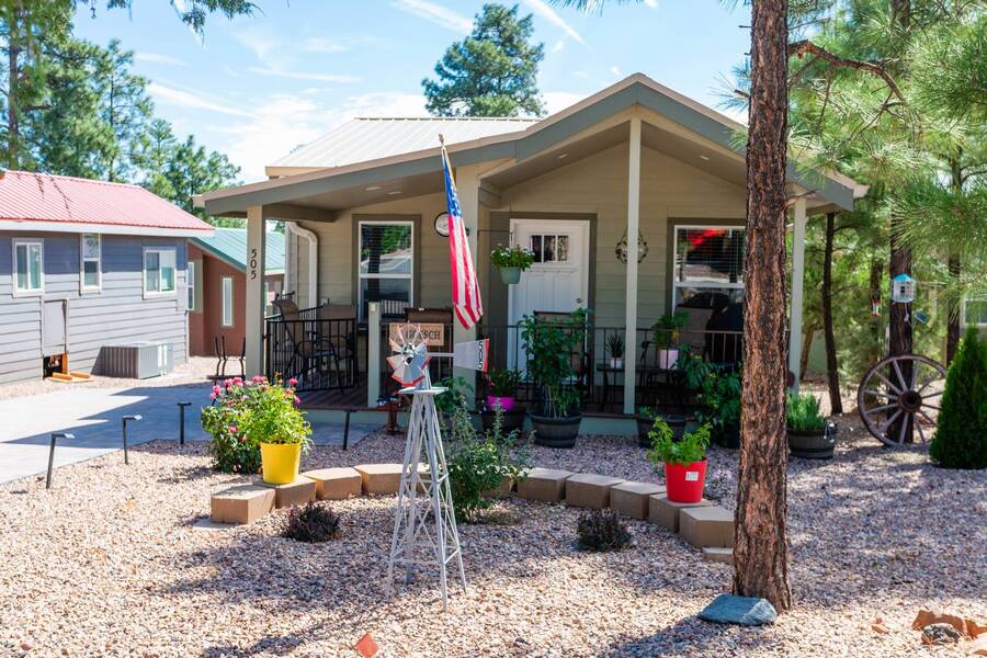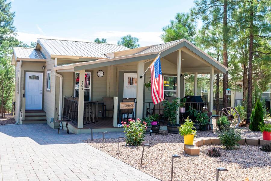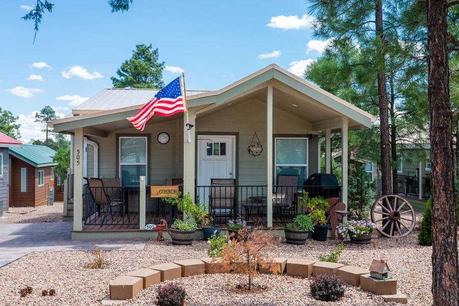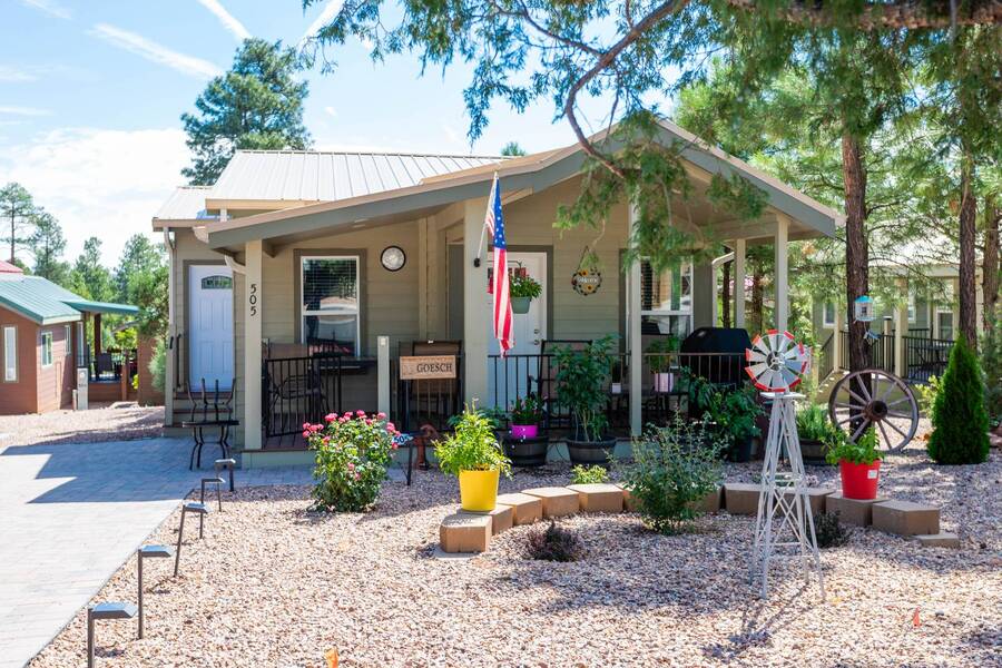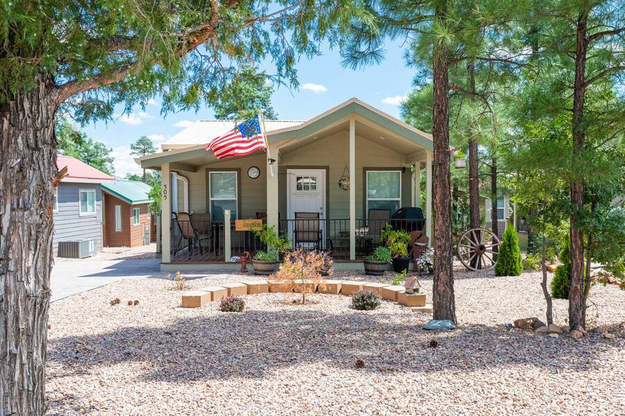 All electric furnished home ready to move in to. This park model is 2 bedroom and 2 bathroom cottage model with upgraded stainless steel appliances, a living room addition, eat-in kitchen with table and chairs, Corian kitchen countertops with barstools, side back door off master bedroom, 4 ceiling fans, on-demand tankless electric hot water heater, stainless steel farmhouse kitchen sink, pull out pantry drawers for easy access, electric fireplace, flat screen TV, oversize closets, granite master bathroom vanity, walk-in master bath shower with grab bars, hall bath shower with grab bars, roof gutters with leaf guards, exterior EV electric outlet, insulated shed with electric and shelving, sprinkler system, potted flowers including roses, paver walkway and driveway, solar pathway lights, wireless door bell, Ring exterior security camera, one step entry, large covered porch with gate, large landscaped lot. This home is located in the most highly sought after 55+ community in Show Low. The site is a comprehensive lease. Annual site fee covers the homesite as well as water, sewer, trash service & basic internet. This saves on the cost of real estate taxes, HOA fees and year-round utility costs. The community is a 55+ Park Model community located in the tall pines of Show Low, Arizona. As a year-round community you can enjoy all four seasons of the White Mountains, imagine yourself enjoying the cool mountain air, shaded by the tall pines and watching the deer stroll through the forest, all while only one mile from major shopping, dining and state of the art medical facilities. An array of outdoor activities can be found nearby too. The community's Rules & Regulations prohibit the use of the home as a rental.
