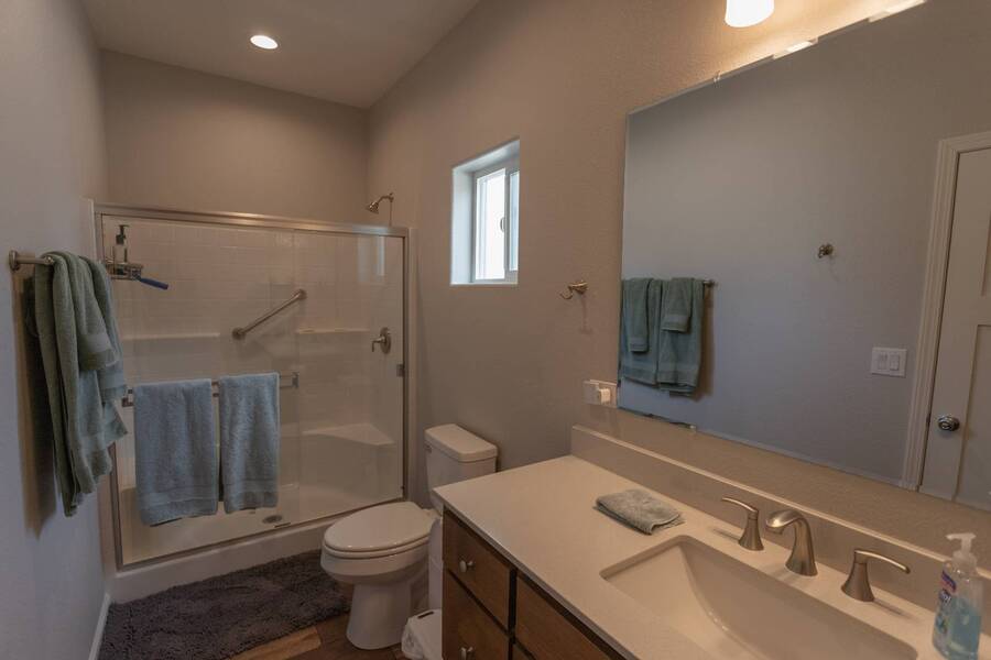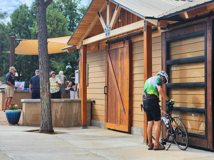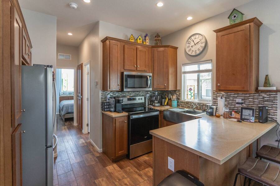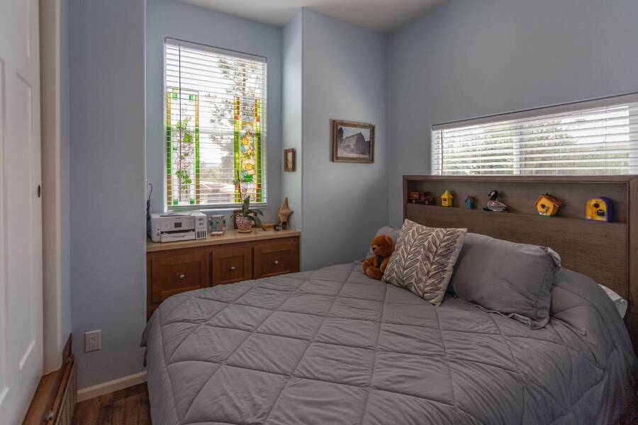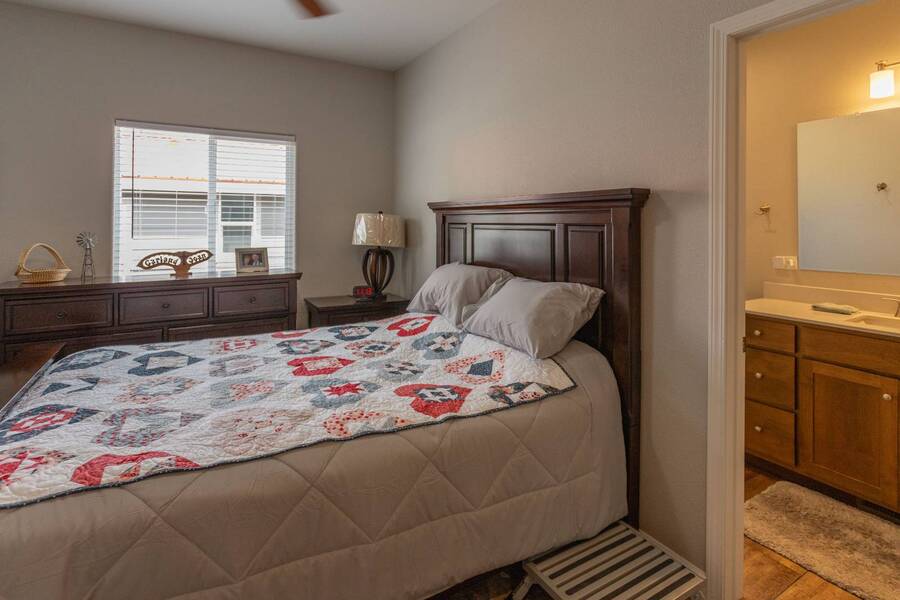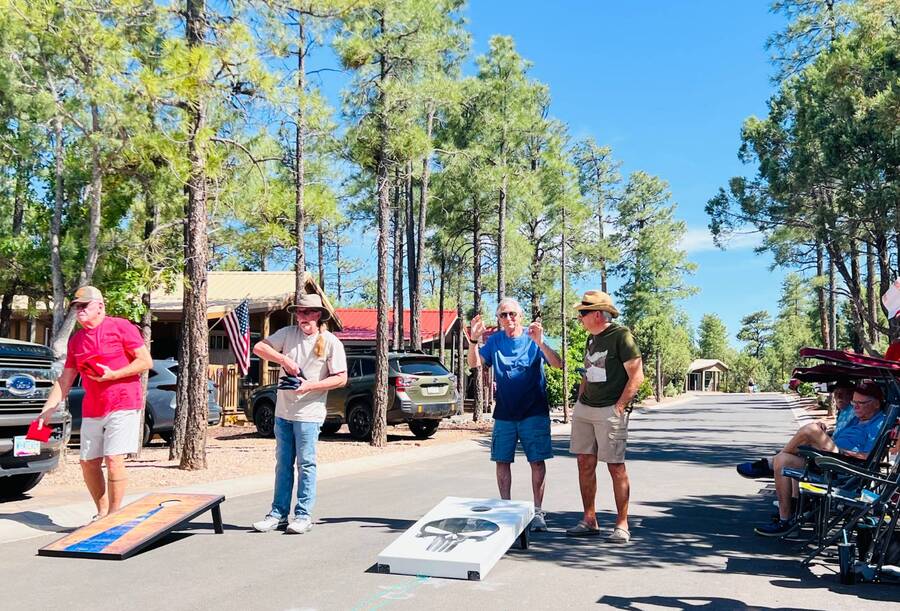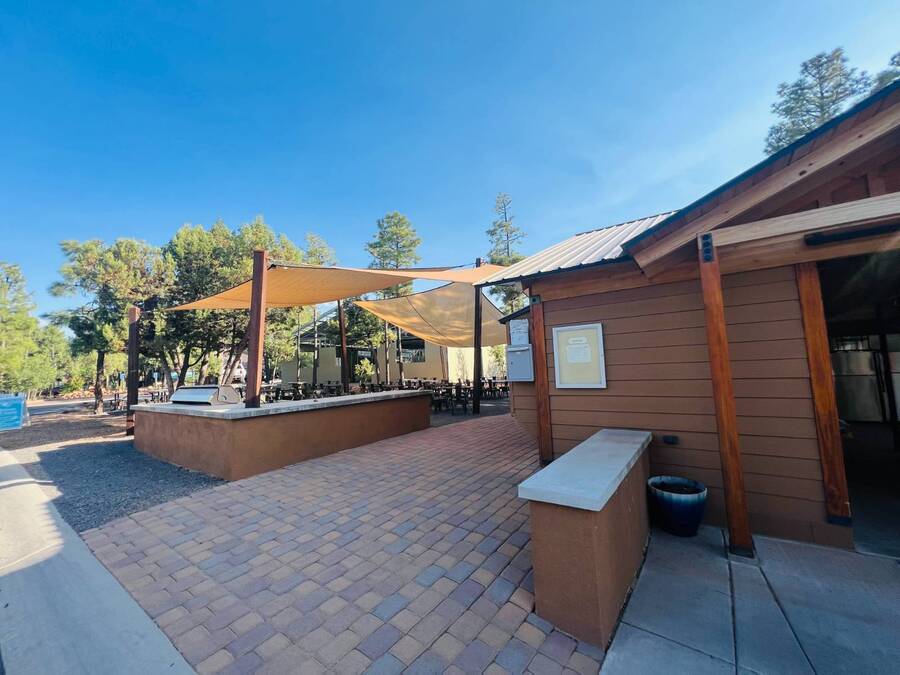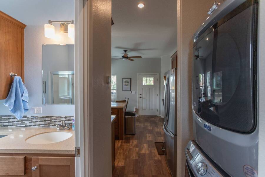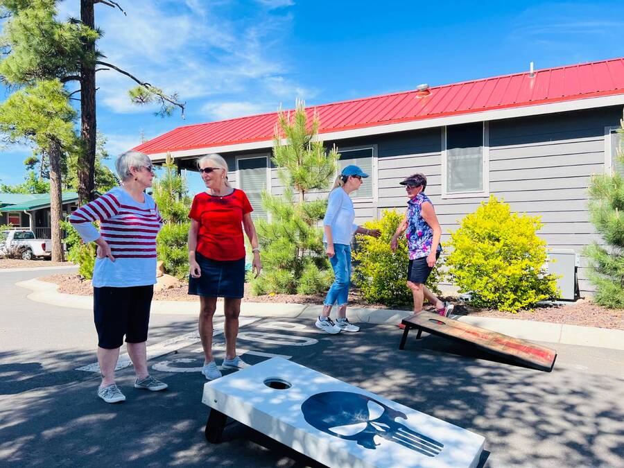 All electric furnished home ready to move in to. This park model is 2 bedroom and 2 bathroom cottage model with upgraded stainless steel appliances, a living room addition, eat-in kitchen with table and chairs, Corian kitchen countertops with barstools, side back door off master bedroom, 4 ceiling fans, on-demand tankless electric hot water heater, stainless steel farmhouse kitchen sink, pull out pantry drawers for easy access, electric fireplace, flat screen TV, oversize closets, granite master bathroom vanity, walk-in master bath shower with grab bars, hall bath shower with grab bars, roof gutters with leaf guards, exterior EV electric outlet, insulated shed with electric and shelving, sprinkler system, potted flowers including roses, paver walkway and driveway, solar pathway lights, wireless door bell, Ring exterior security camera, one step entry, large covered porch with gate, large landscaped lot. This home is located in the most highly sought after 55+ community in Show Low. The site is a comprehensive lease. Annual site fee covers the homesite as well as water, sewer, trash service & basic internet. This saves on the cost of real estate taxes, HOA fees and year-round utility costs. The community is a 55+ Park Model community located in the tall pines of Show Low, Arizona. As a year-round community you can enjoy all four seasons of the White Mountains, imagine yourself enjoying the cool mountain air, shaded by the tall pines and watching the deer stroll through the forest, all while only one mile from major shopping, dining and state of the art medical facilities. An array of outdoor activities can be found nearby too. The community's Rules & Regulations prohibit the use of the home as a rental.