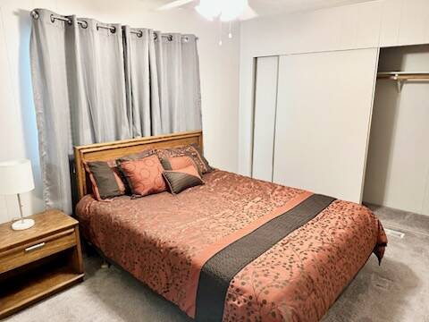 The living room offers built-in shelving and a ceiling fan, while both bedrooms include full-length closets and new ceiling fans. The home is secured with an ADT video system and interconnected smoke alarms for peace of mind.