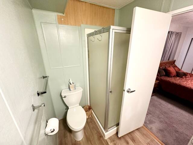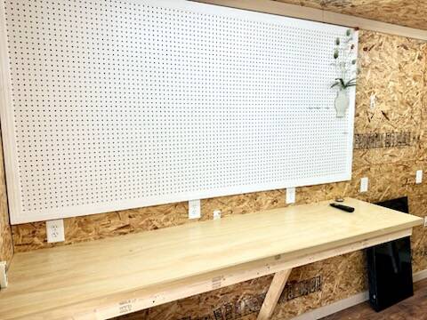 The extra-large insulated shop (approx. 10x16) is a standout feature — complete with heat pump A/C, ceiling fan, TV, laminate flooring, workbench, pegboard, wall-mounted shelving, and a 220 outlet. Perfect for hobbies, projects, or storage.