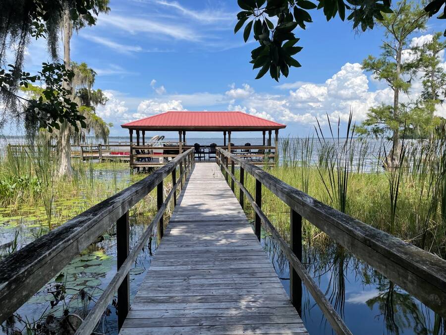 Welcome to a pristine, 2012 built home nestled within a highly sought after gated community of just 46 homes in Leesburg, FL. Perfectly situated on the shores of Lake Harris, this home offers direct access to your private boat slip, $50 slip rental, making it an ideal retreat for boating enthusiasts. The open concept living area welcomes you with a spacious entryway that flows seamlessly into the gorgeous dining, kitchen, and living rooms. Large windows overlook the covered deck, where you can entertain guests while enjoying serene views. The kitchen is a chef's dream, featuring modern white cabinetry, granite countertops, and stainless steel appliances. The expansive island is perfect for gathering friends and family while you prepare gourmet meals. With an abundance of cabinetry, there is ample storage for all your culinary tools and gadgets. Outside, the community is designed to enhance your lakefront lifestyle. Take a leisurely stroll along the boardwalk to a charming covered deck, where you can unwind while watching the birds and boats pass by. Prefer to be on the water? Hop in your boat and explore the lake, or cruise to one of the many lakeside restaurants for relaxing lunch or dinner. Located just minutes from Leesburg and The Villages, with easy access to nearby amenities, this home offers the perfect blend of tranquility and convenience.