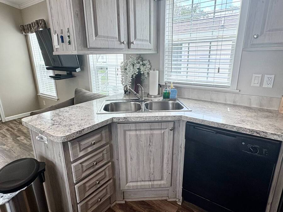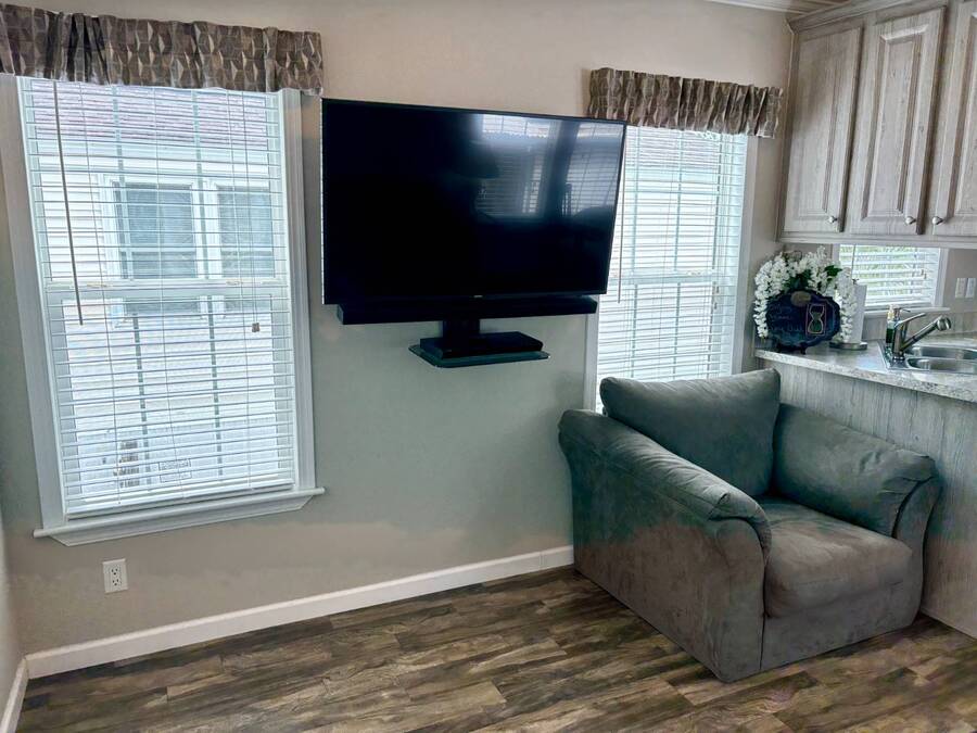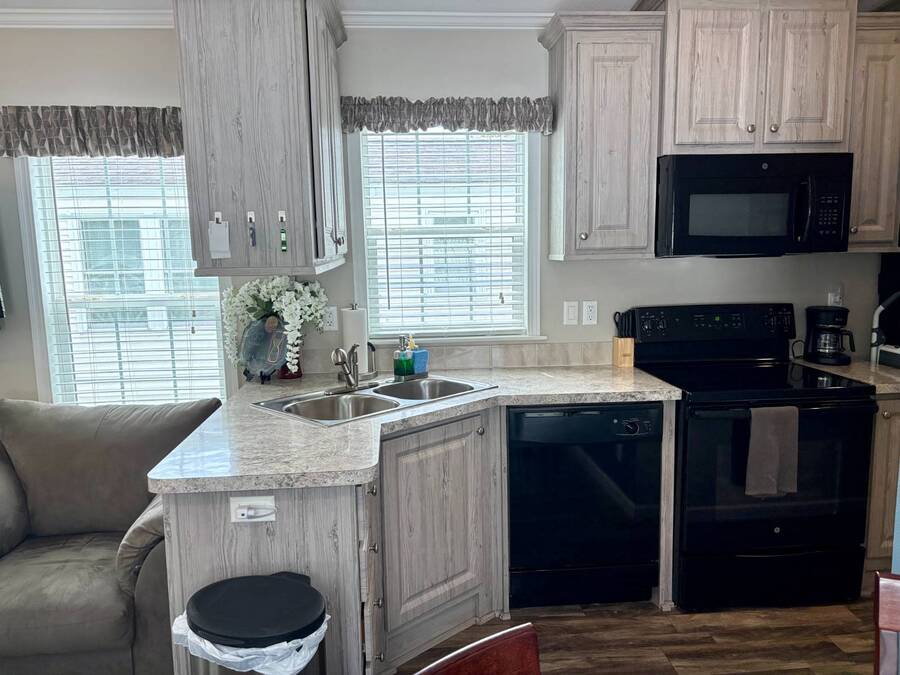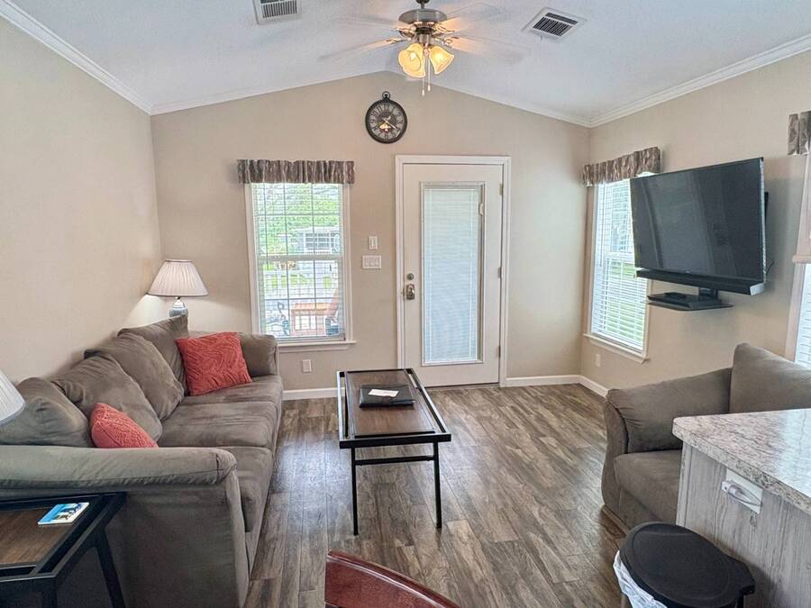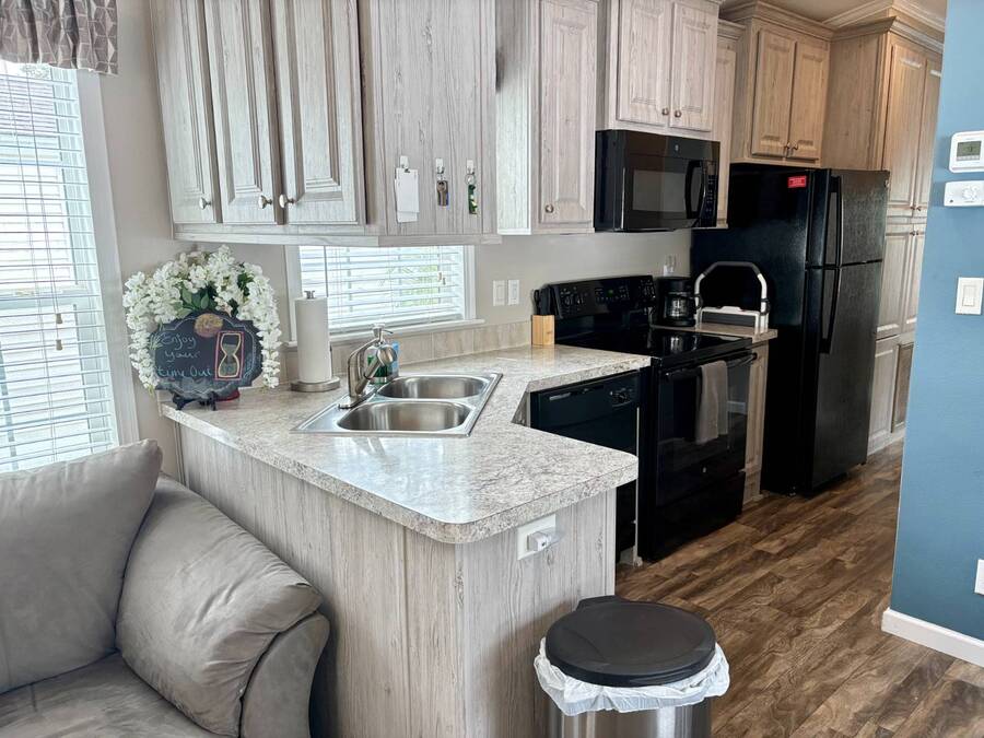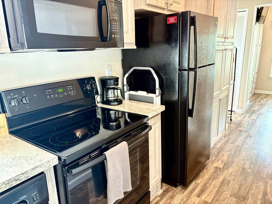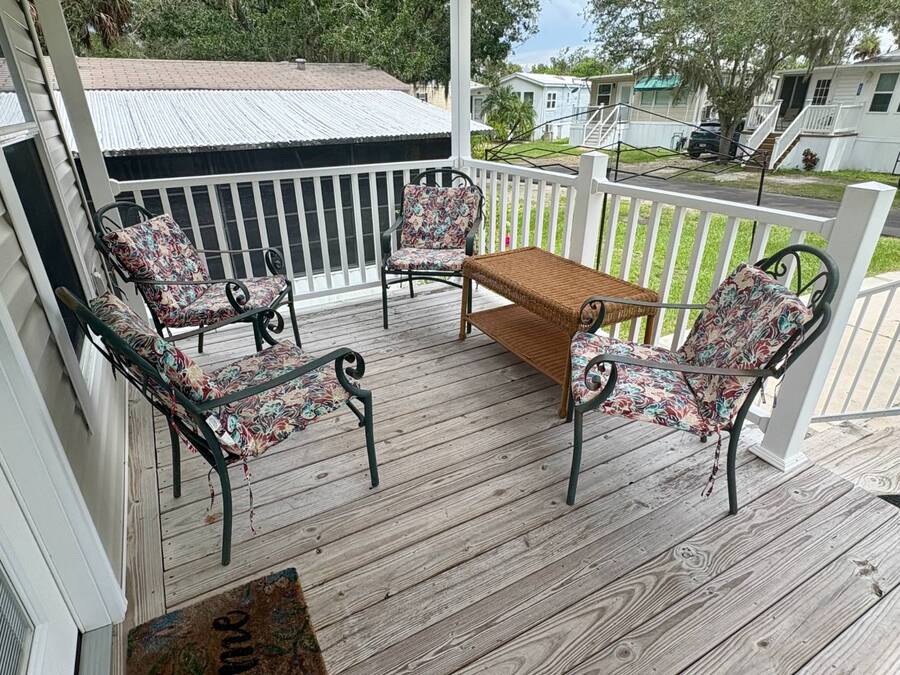 This gorgeous 2018 park model is truly like new and offers everything you need for your Florida dream lifestyle. Featuring two bedrooms, this turnkey home comes fully furnished and stocked with linens, dishes, pots, pans, utensils, and even an in-house stacked washer and dryer. Just drop your suitcase and start living the good life. Outside, a wide paved driveway provides plenty of parking space, while the charming raised covered front porch with white railing invites you to relax and enjoy the Florida weather. The porch includes chairs, a table, and a ceiling fan for added comfort. Inside, you'll find a spacious open floor concept that begins with a cozy living area featuring a sofa, armchair, and wall-mounted TV. This space flows seamlessly into the dining area with a table for four and a curved kitchen equipped with all original appliances, including a dishwasher, microwave, stove, and beautiful white-washed cabinets, counters, and pantry-all still like new. The open area is filled with windows, making it light and bright throughout. The bathroom includes a tub/shower combo, a lovely vanity, and a bonus stacked washer and dryer tucked into an alcove near the side exit, complete with a laundry cart. The guest bedroom offers a double bed, built-in nightstand, and a cabinet for hanging clothes with drawers. The master bedroom features a queen bed, built-in nightstands, built-in closets, and a mounted TV. Both bedrooms and the bathroom are fitted with space-saving pocket doors. This home also includes a full-house A/C unit and a furnace for heat when needed, ensuring year-round comfort. If you're looking for a beautiful Florida home that doesn't need a single thing, you've found it here. Discover the joys of residing in an active, family-friendly park conveniently located in South Venice, just minutes away from the Gulf of Mexico and its sandy beaches. Enjoy the mini golf course and designated play area for kids. Unwind by participating in a game of chess on a large outdoor board. Relax and rejuvenate in the large pool and spa, offering a perfect oasis for warm, sunny days. Explore the serene waters of the Myakka River with convenient on-site kayak storage and launch facilities. Stay active and take advantage of fishing opportunities or visit the fitness center for a workout. All this is onsite to make this property an ideal retreat for a vibrant Florida lifestyle. Venture beyond the community to explore nearby attractions to downtown Wellen Park or historic Venice offering an array of dining options, shopping and cultural events. Visit the beautiful beaches where one can find shark teeth galore! And, Tiger Woods pop stroke with two courses in Sarasota and a casino in Tampa are a must. All listing information given to our company is considered appropriate and reliable but should be independently verified through personal inspection by appropriate professionals. The lot rent is very reasonable and covers all amenities offered and other expenses including lawn maintenance, trash, water and sewer.