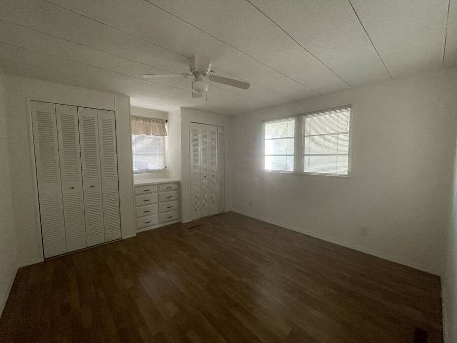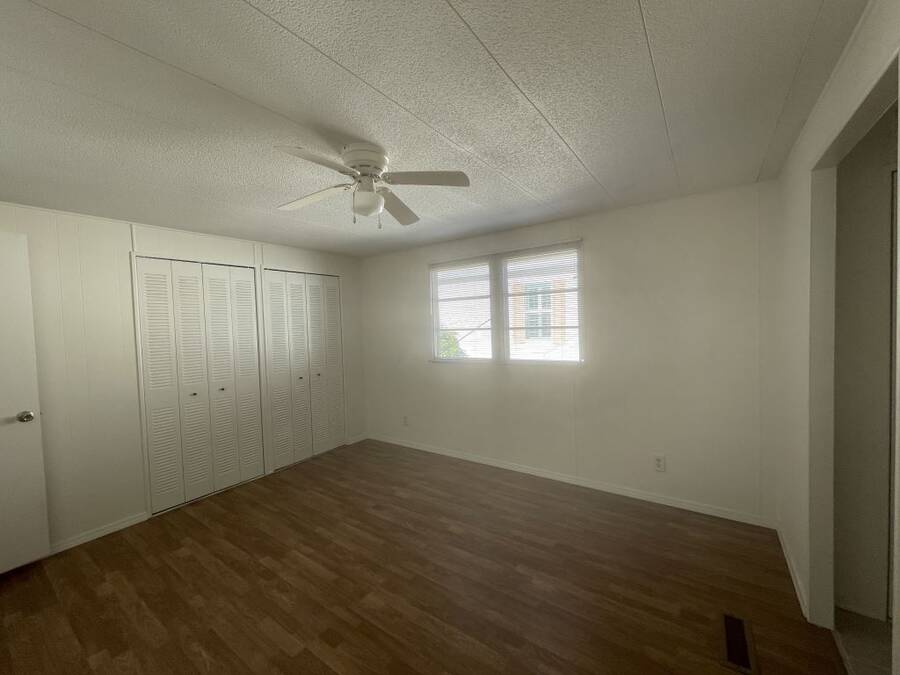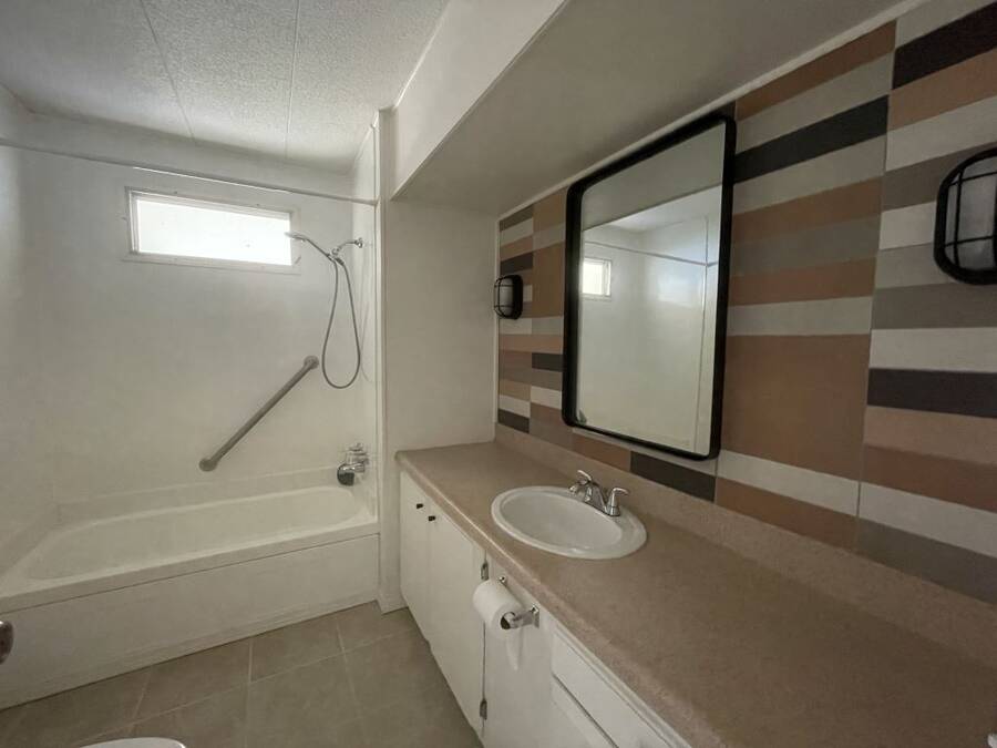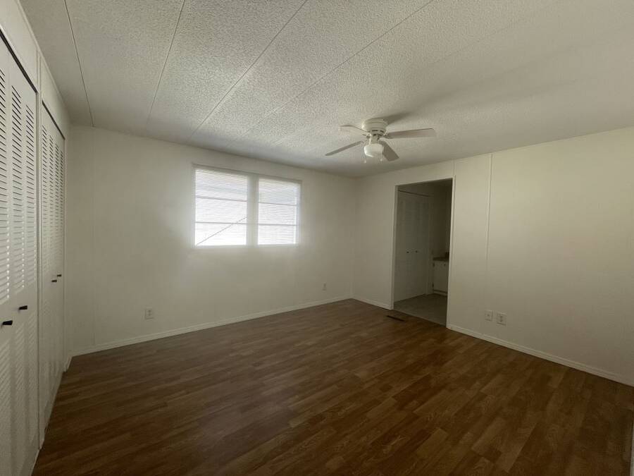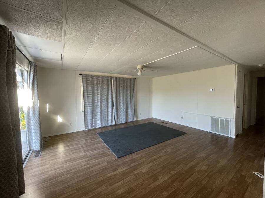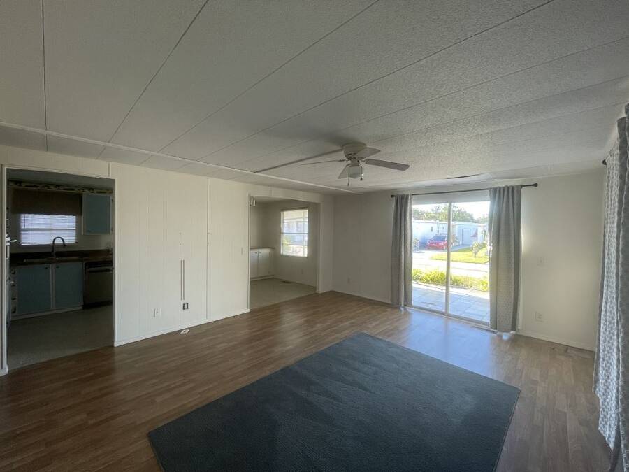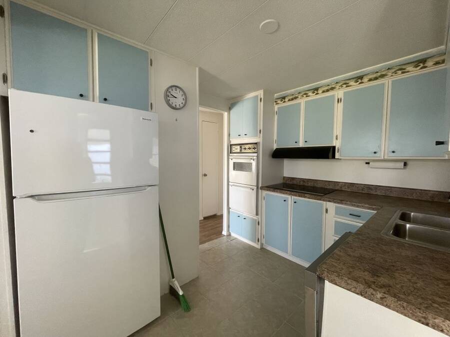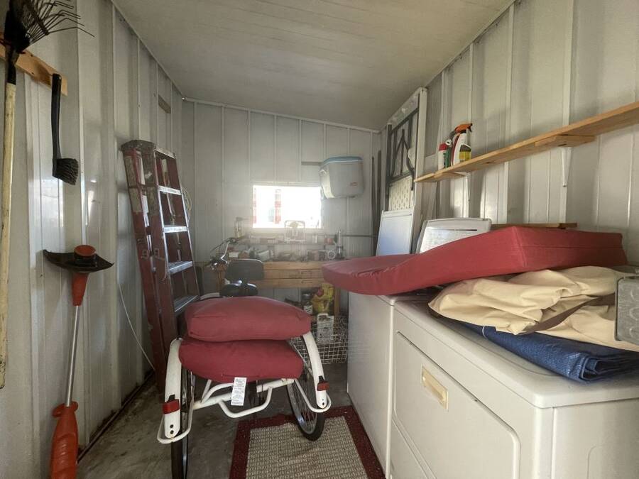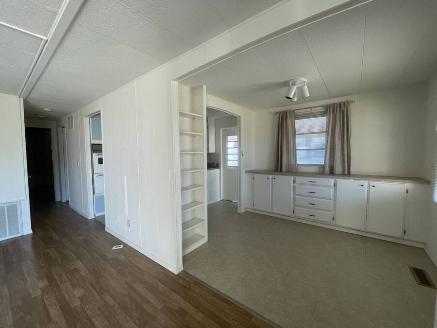 Step into the potential of this 1973 2-bedroom, 2-bath home, offering a spacious 24' x 40' layout and plenty of character. The bright kitchen features eye-catching coastal blue cabinets, a gooseneck faucet, and all included appliances—refrigerator, in-wall oven, flat top stove, and dishwasher—making it a functional space with a splash of charm. The open dining area connects easily to both the kitchen and living room, creating a comfortable flow for everyday living. Ceiling fans in the living area and both bedrooms help keep things cool year-round. The primary bedroom includes its own en suite bath with a convenient walk-in shower. Outside, enjoy two-car covered parking under the carport and a separate storage shed with washer and dryer included.