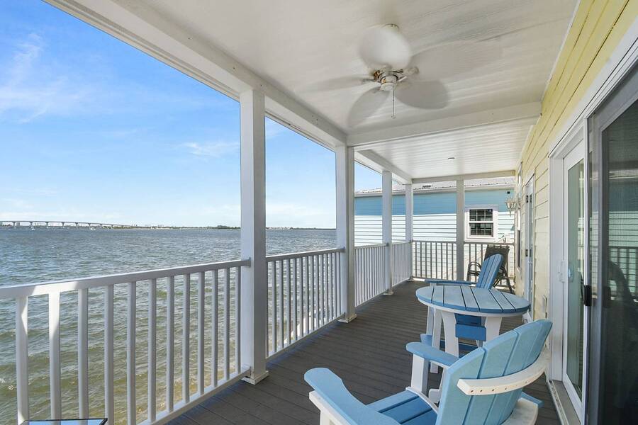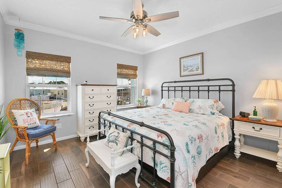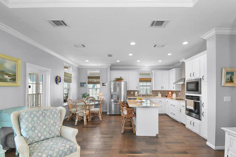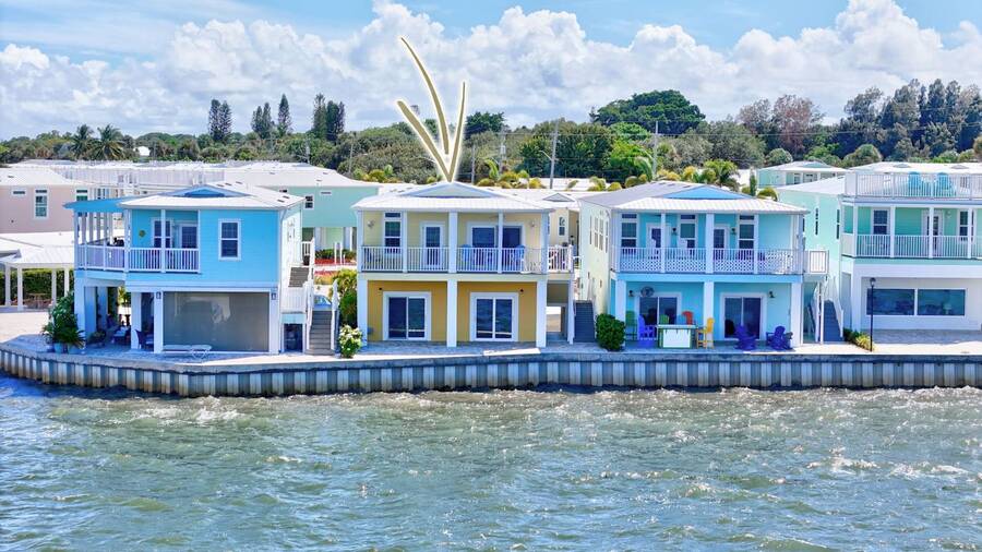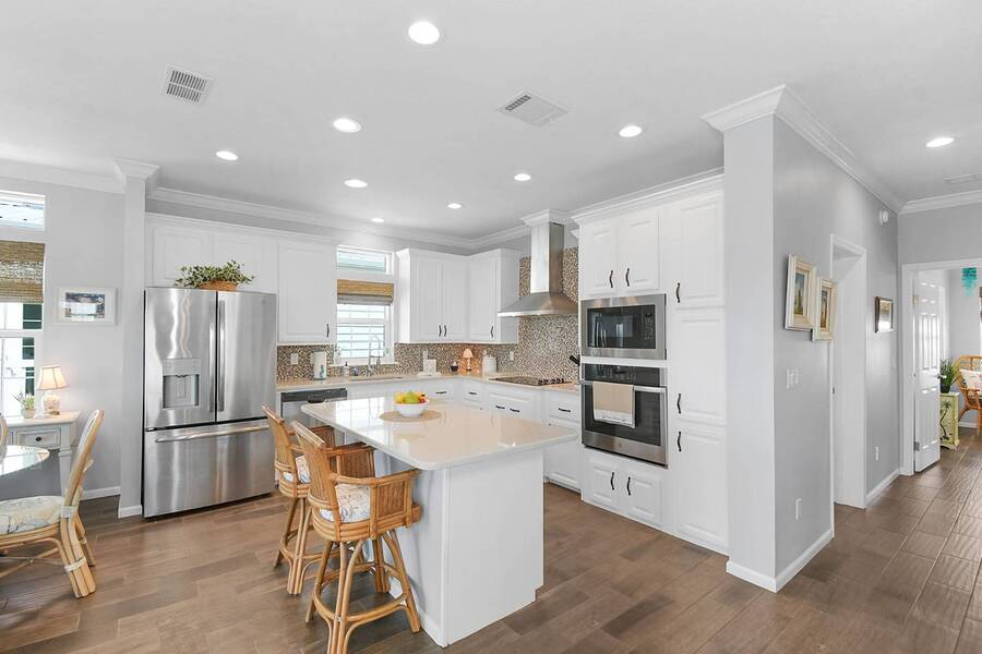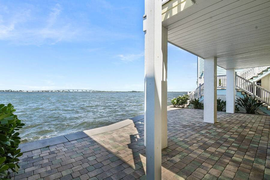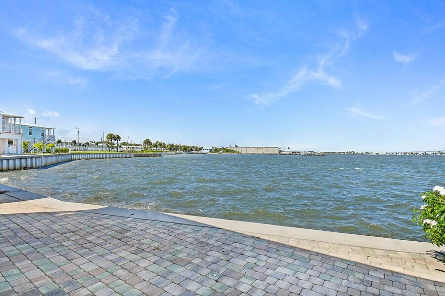 6 months of land lease fees and furniture to be included with the list price. Live minutes to the beach from this beautiful newer (2020) home and enjoy wide water views of the Indian River. The living room offers loads of windows which maximize the waterfront views, sunrises, sunsets, and opens to the oversized balcony. Kitchen boasts attractive backsplash, LG appliances such as a flat cooktop, wall oven & microwave, French door style refrigerator, white cabinets, center island and large sink. Main bedroom suite has a walk-in closet w/ organizers, accommodates a king size bed, has dual sinks and a spacious step-in shower. This house is constructed with the current 140-mile-an hour Miami-Dade building code requirements featuring impact glass windows & doors, and metal roof. Huge 4 - 5 car climate-controlled garage with an epoxy floor has endless possibilities; slider doors off the back places you steps away from fishing and sea life. Neighboring homes have docks, so buyers can investigate private dock permit for the boat. Ocean Breeze Resort is golf cart friendly, an age 55 plus community and lends itself to a modern active lifestyle featuring state-of-the-art fitness center, resort pool, café, dog park and pickleball. Trucks, trailers, motorcycles and pets are welcome.