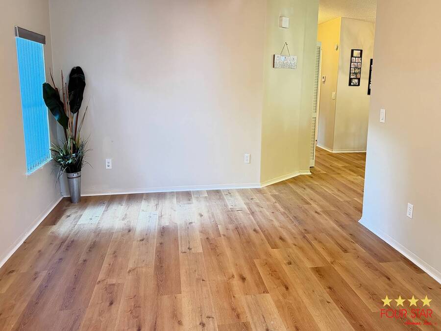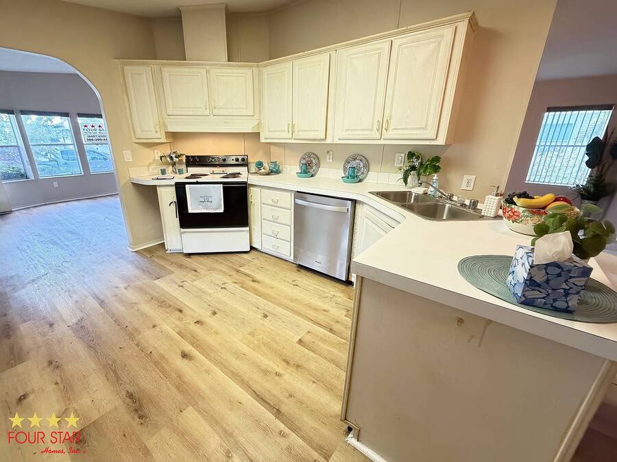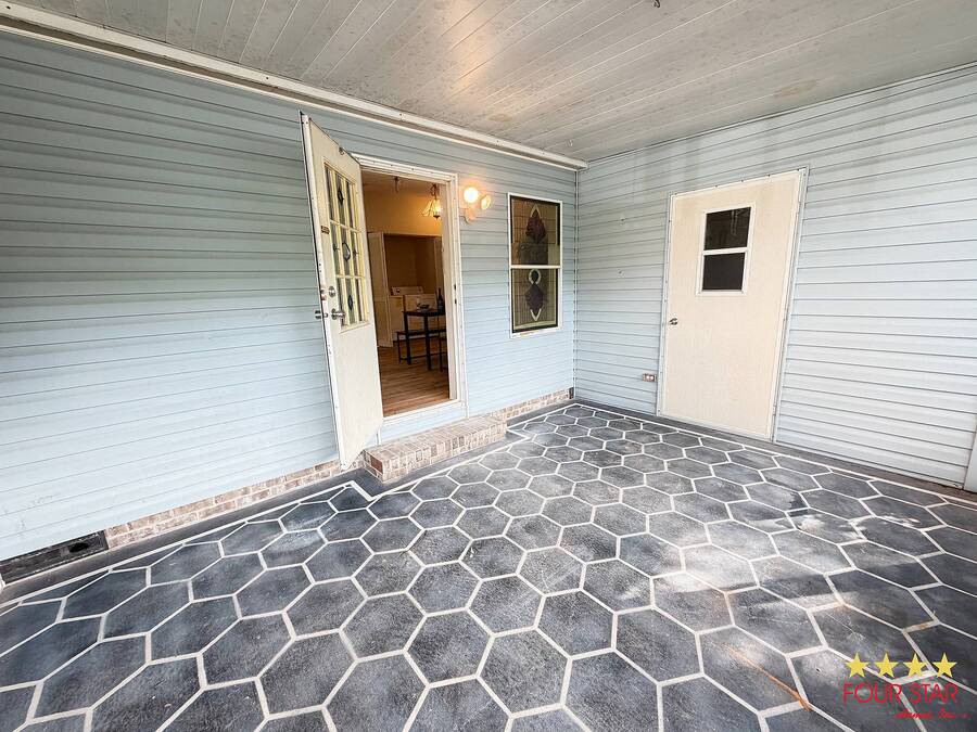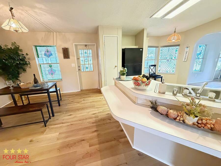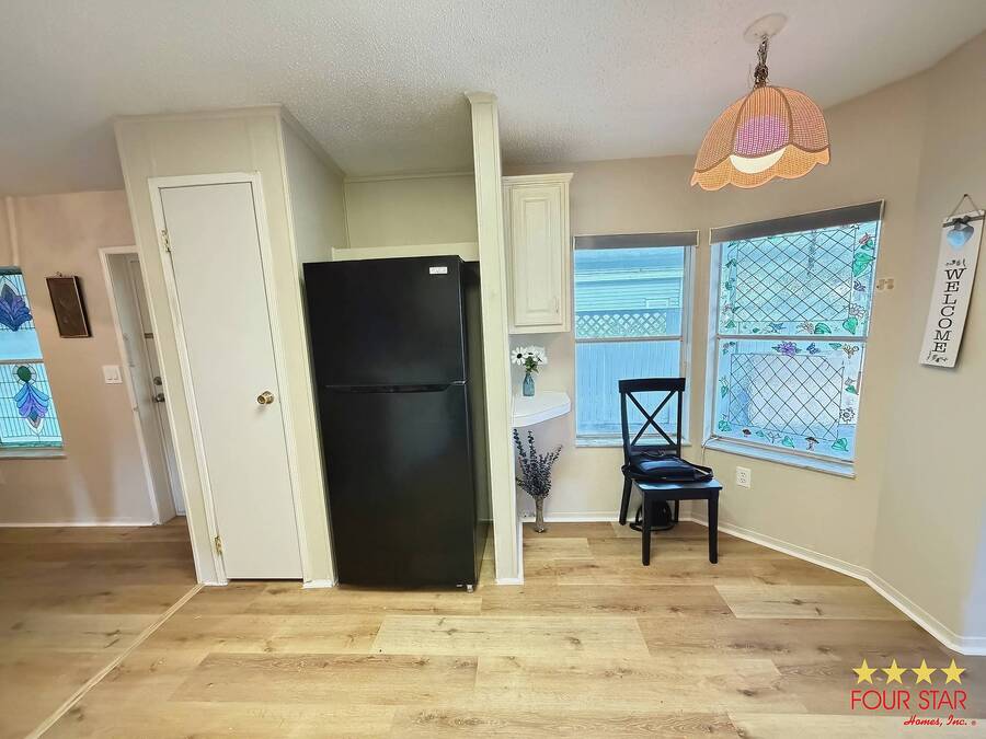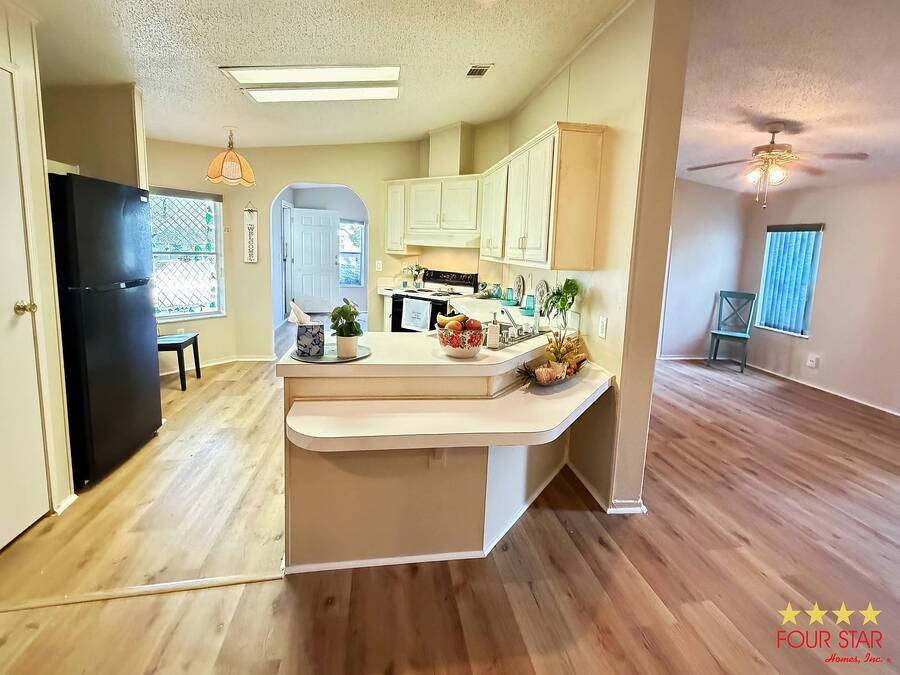 This delightful 2 bedroom 2 bath home offers nearly 1500 square feet of comfortable living space, perfect for those seeking a blend of style and functionality! Step into a bright and airy living room adorned with ample windows. allowing natural light to flood the space. The open layout seamlessly connects the living area to the dining space, creating an inviting atmosphere for family gatherings or entertaining friends. Features a new fridge and dishwasher, making meal prep a breeze. Both bedrooms come equipped with generous walk in closets, providing ample storage for your wardrobe and personal items. The entire home boasts beautiful viny1flooring, offering durability and easily maintained. Screen room. perfect for enjoying morning coffee or evening relaxation. The additional shed provides extra storage for gardening tools or outdoor equipment. Situated in a desirable neighborhood, you will have easy access 10 local amenities, parks, and shopping, making daily life a breeze. Do not miss out on this incredible opportunity to own a charming home that perfectly balances comfort and style. Schedule a viewing today and envision your new life in this lovely retreat! All of this and a year home warranty to boot!