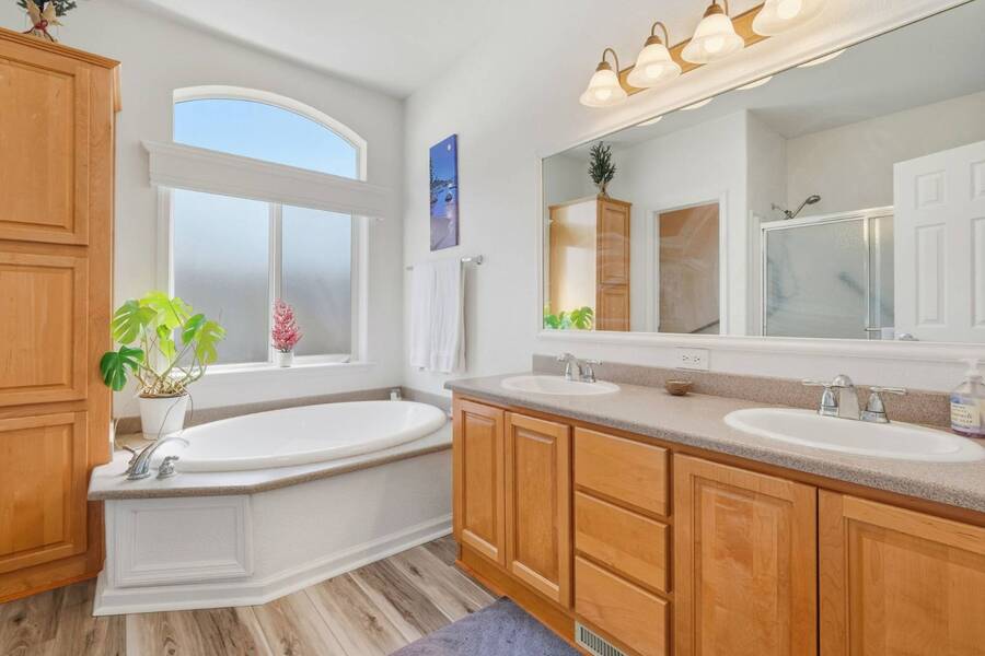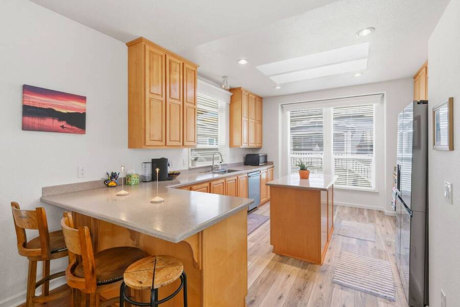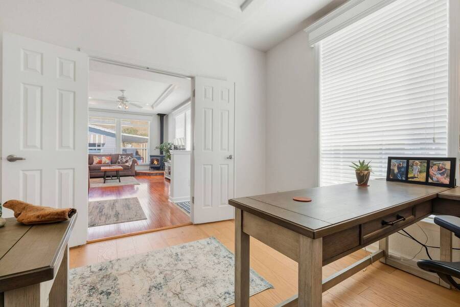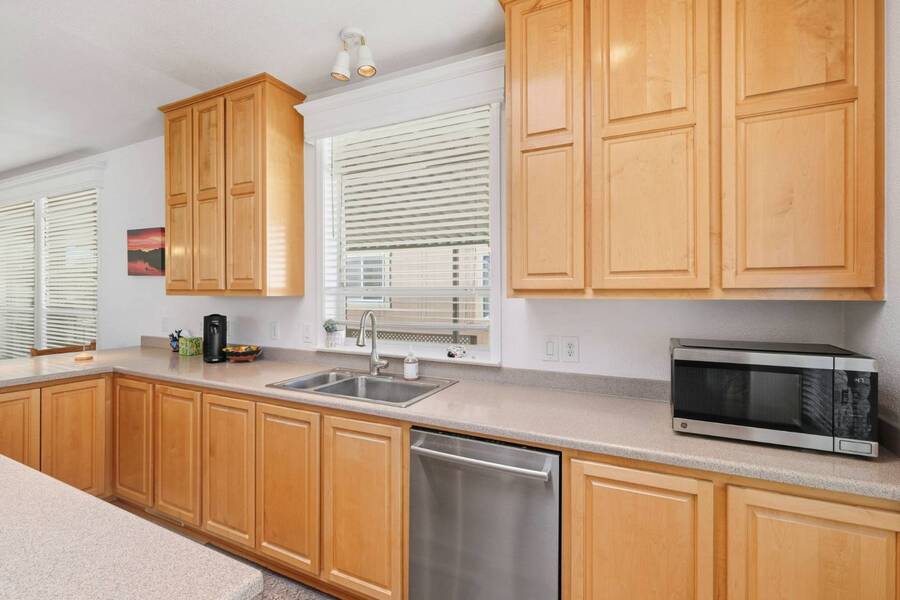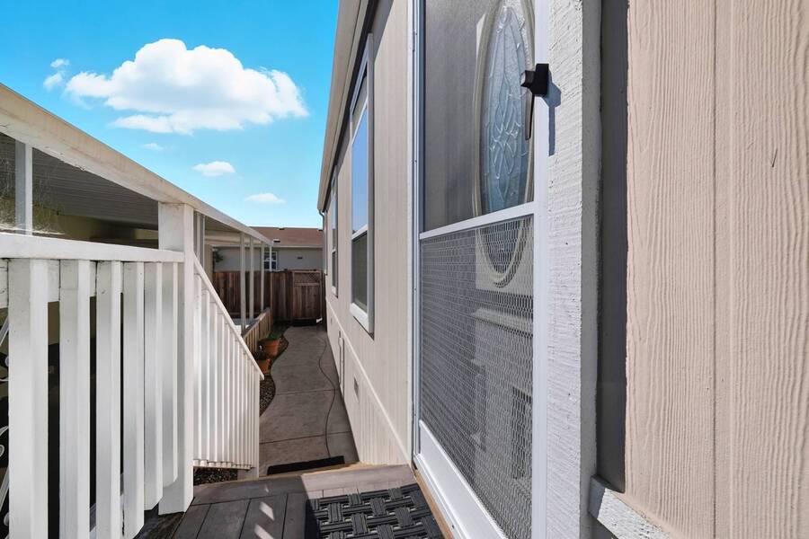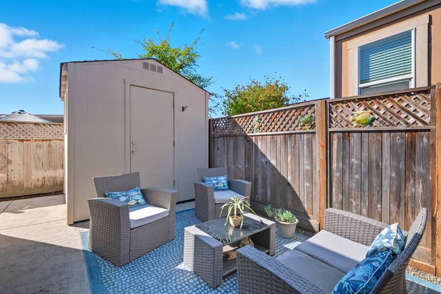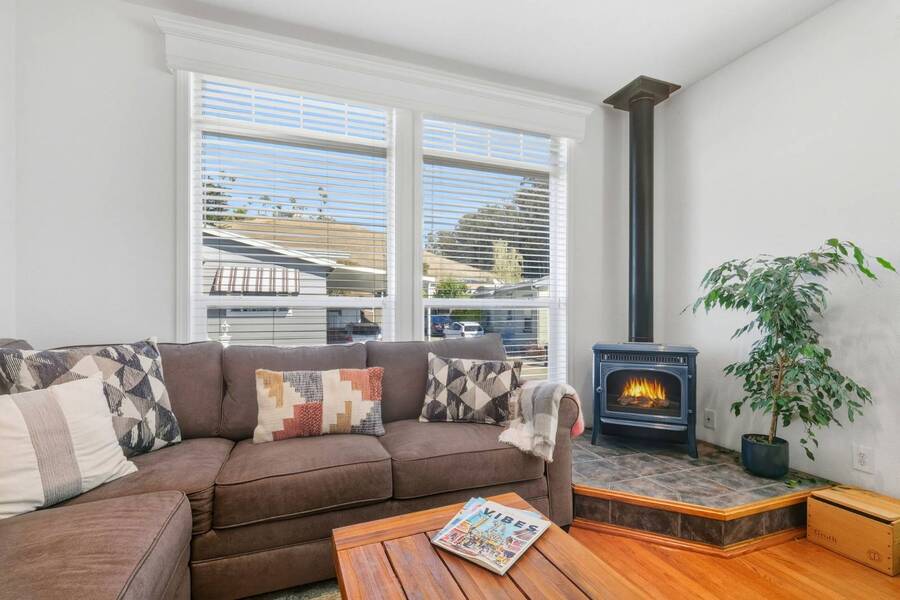 Very rare 1602SFbeauty - with fully furnished option. This home is among the largest homes in any manufactured home community and is situated in a pretty spot with a view of the Soquel Mountain! Sip your morning coffee at the kitchen window or cozy up in front of the fireplace while watching the animals graze in the pasture. Your home is Rodeo Estates, one of the most wonderful adult communities in Santa Cruz. Enjoy the large, spacious kitchen, dining, living rooms and separate den with double doors. An extra wide hallway leads to a beautiful primary suite and glamour bath with 2 sinks, step in shower and soaking tub. Tall 9' flat ceilings, coffered ceilings, crown moldings, wood window sills and gorgeous hardwood floors exude "Quality and Luxury". Extra tall windows, skylights and solar tubes flood the house with light. The side yard has a lovely seating and BBQ area, a large shed and the rear yard is spacious for more outdoor privacy and gardening. Serial # 32760CAA/B