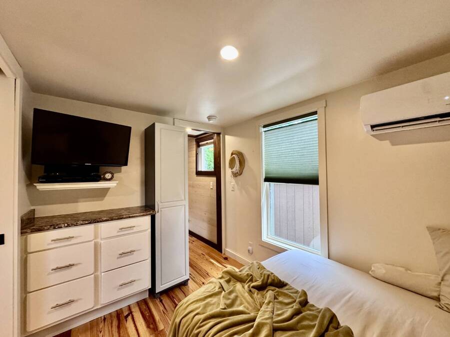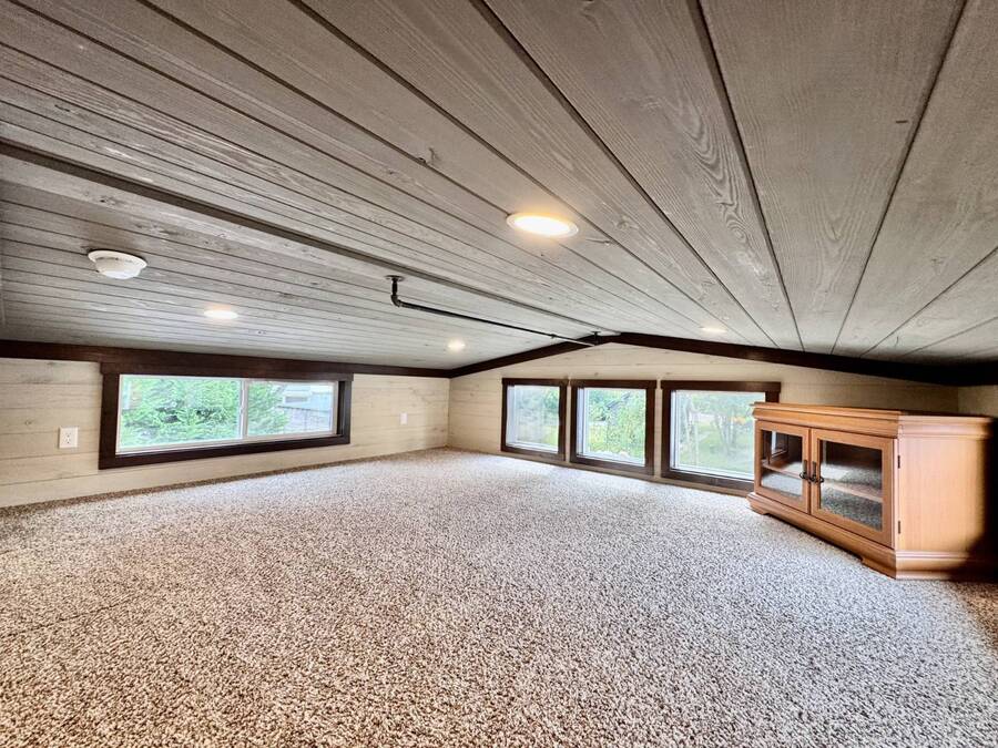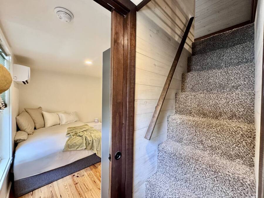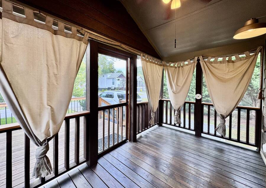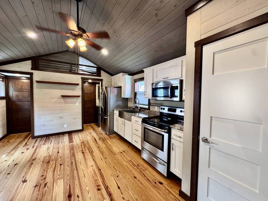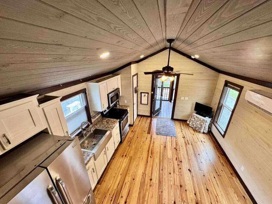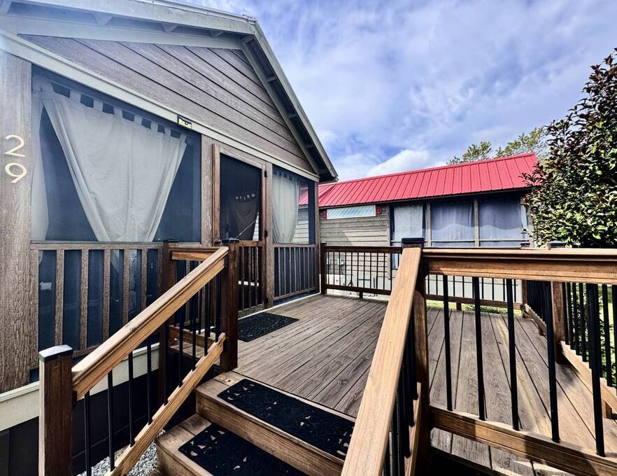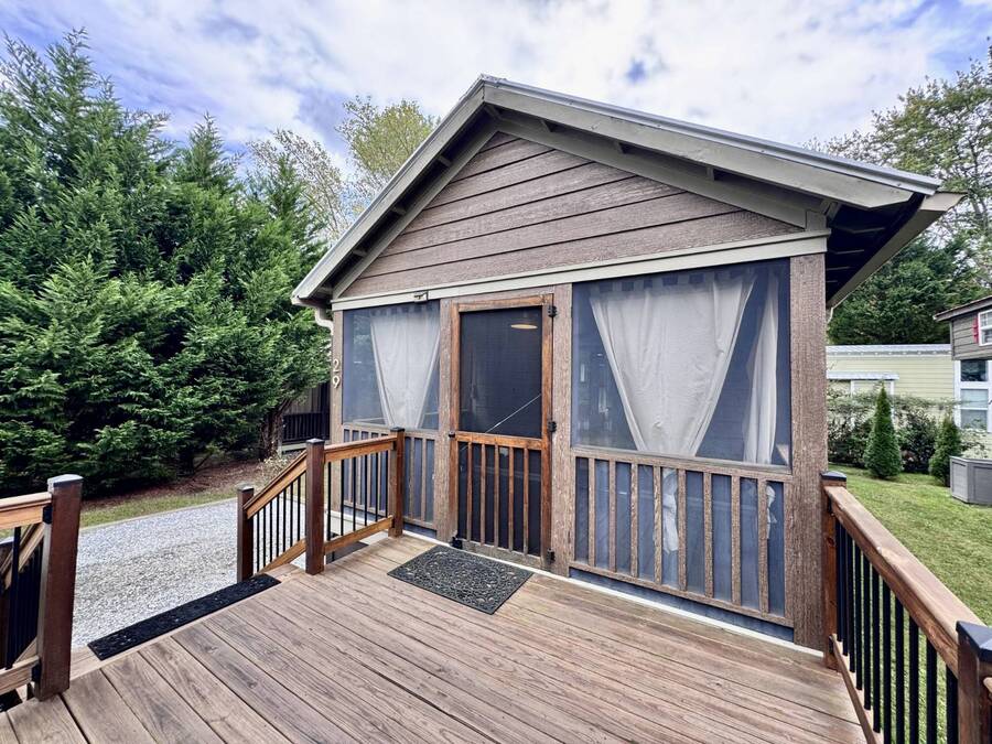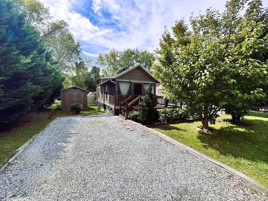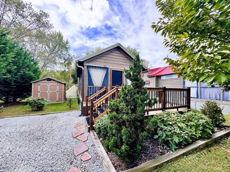 Discover efficient affordable living without compromise in this beautifully designed 398 sq. ft. Cozy Cottage located in The Villages by Simple Life- A gated, resort-style community offering an unmatched lifestyle experience without the cost and responsibility of land ownership. This is 1-bedroom, 1-bath with a full loft cottage. The home features a smart open-concept layout with a galley kitchen complete with full-size stainless steel electric appliances and a charming farmhouse sink. Hidden stairs lead to a carpeted loft that's perfect for guests or extra storage. The primary bedroom is conveniently located on the main level and offers a private ensuite bath entrance with a spacious step-in shower. Worthy mentions include pine hardwood flooring throughout the main level, plush carpeting in the loft and stairs, and a propane hot water heater. Outdoor living is easy with an attached screened-in front porch, an additional open deck, and a detached 12x12 shed for extra storage. This home is just a stones throw away from the community pond. Simple Life lets you enjoy all-inclusive living with water, sewer, trash, mowing, basic cable, and road maintenance covered in your lot rent along with the lifestyle amenities. This includes two clubhouses, two pools, two fitness centers with weekly classes, community and tranquility gardens, dog parks, bocce ball court, fishing ponds, fire pits, and more. From a vibrant social calendar, live music events, food trucks and seasonal festivities you are sure to find a place and way of living that suits you. Embrace the Simple Life where luxury, comfort, and convenience come together in a beautifully maintained retreat-style setting. Whether you're seeking a full-time staycation residence, a vacation getaway, or an income-producing investment, this property provides flexibility with both short-term and long-term rentals permitted. Schedule a showing with me today because this is the kind of listing that must be experienced to be truly understood and appreciated!