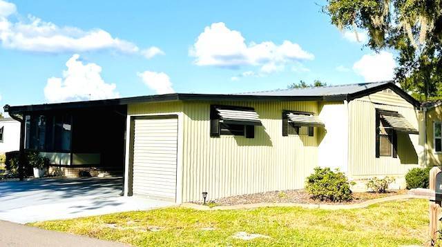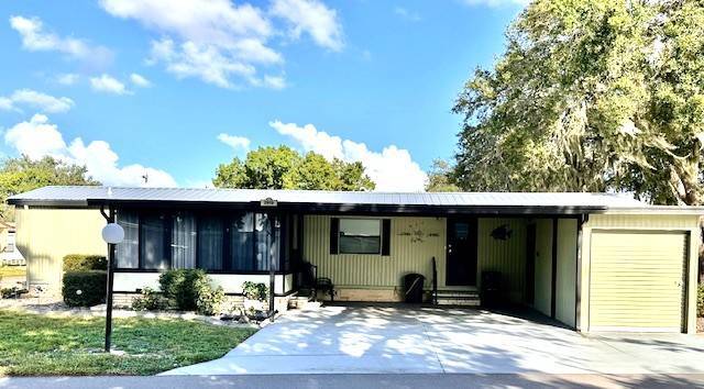 Beautifully maintained 2-bedroom, 2-bathroom home on a large corner lot in a desirable 55+ golf course community on a scenic lake. This furnished and turnkey home is move-in ready and features vinyl plank flooring throughout, a new metal roof (2023), and a golf cart garage. The double covered carport provides plenty of parking and shade. A golf cart is included, making it easy to enjoy all the amenities this vibrant community offers-including a beautiful pool, clubhouse, and lakeside golf course. Perfect for relaxing or entertaining, this home is priced to sell!