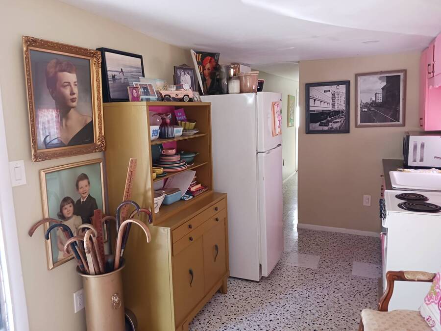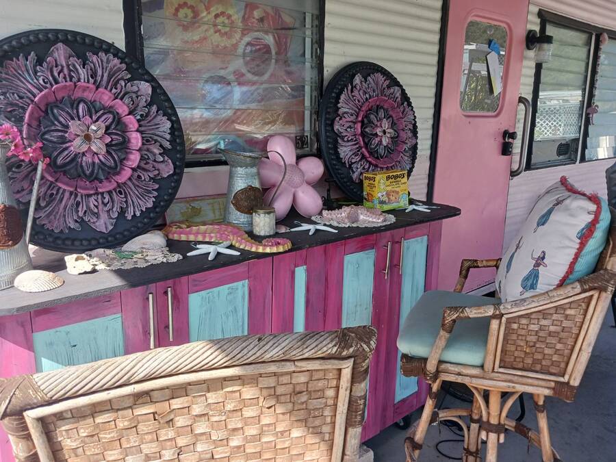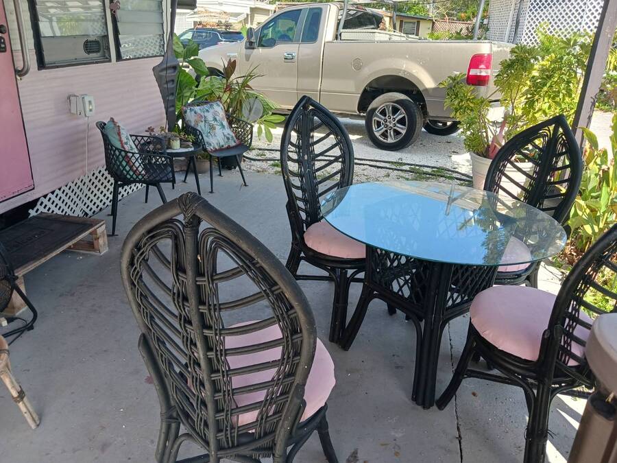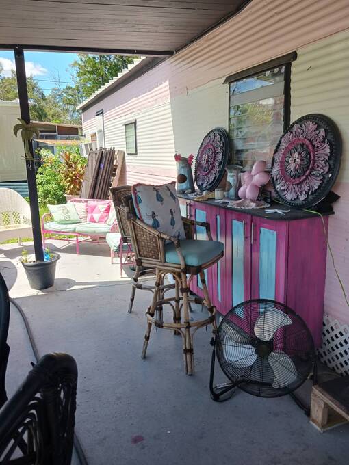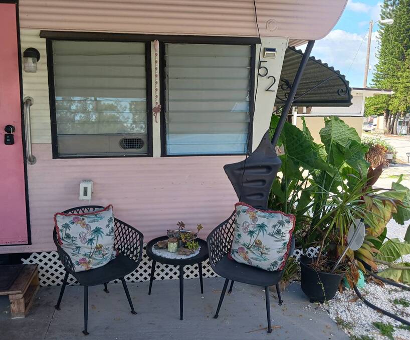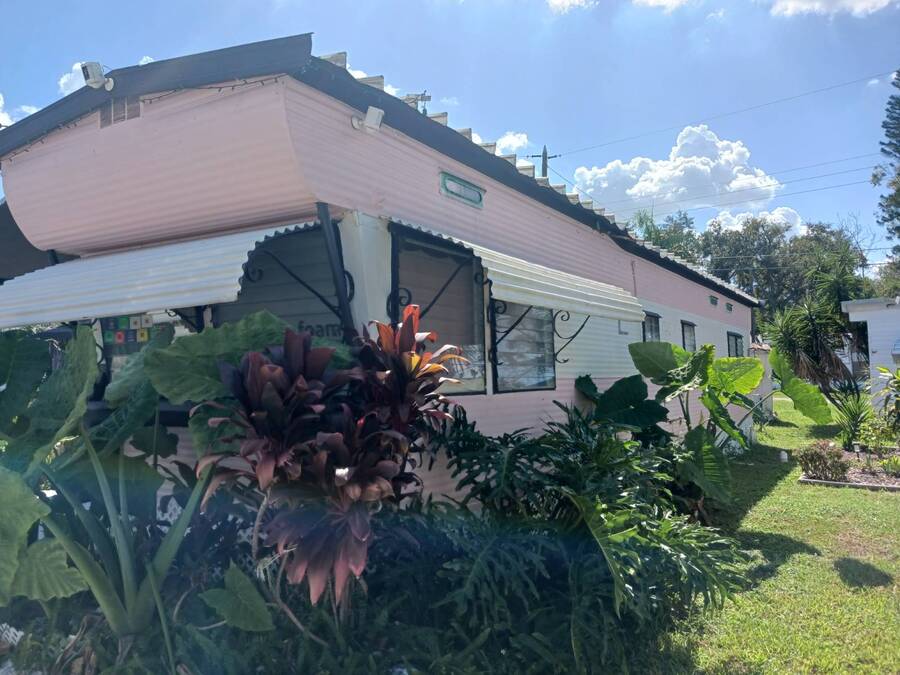 Welcome to this 1957 Era mobile home that was completely redone in the style of the that time. The new subfloors are soild & have new 1950's style Terrazzo vinyl decorative flooring. The bathroom is completely new! New bath tub & accented with a vintage pink sink!! This is an absolutely adorable retro mobile home. Little Pinky, has one bedroom, one bath, a nicely updated kitchen, cozy living room, and the covered carport / patio extends the living space. 55+ community, lot rent is $550, close to shopping & beaches , zone X- non Flood. Great if you want a 2nd home in Florida that's affordable, or year round affordable living. Must see this lil gem in person to appreciate. Call today!