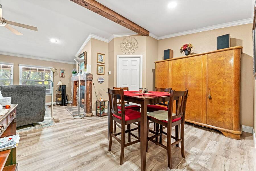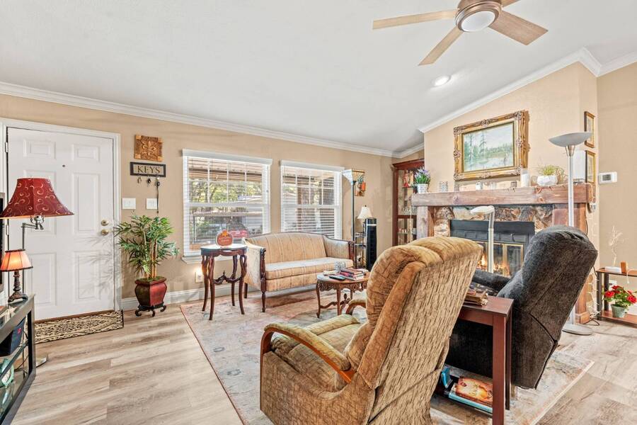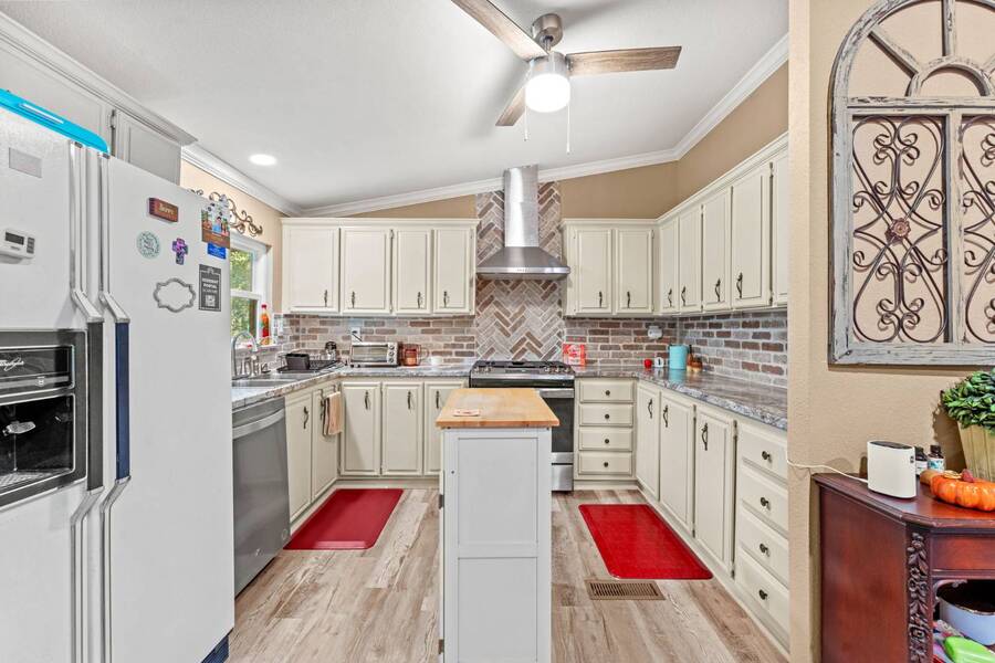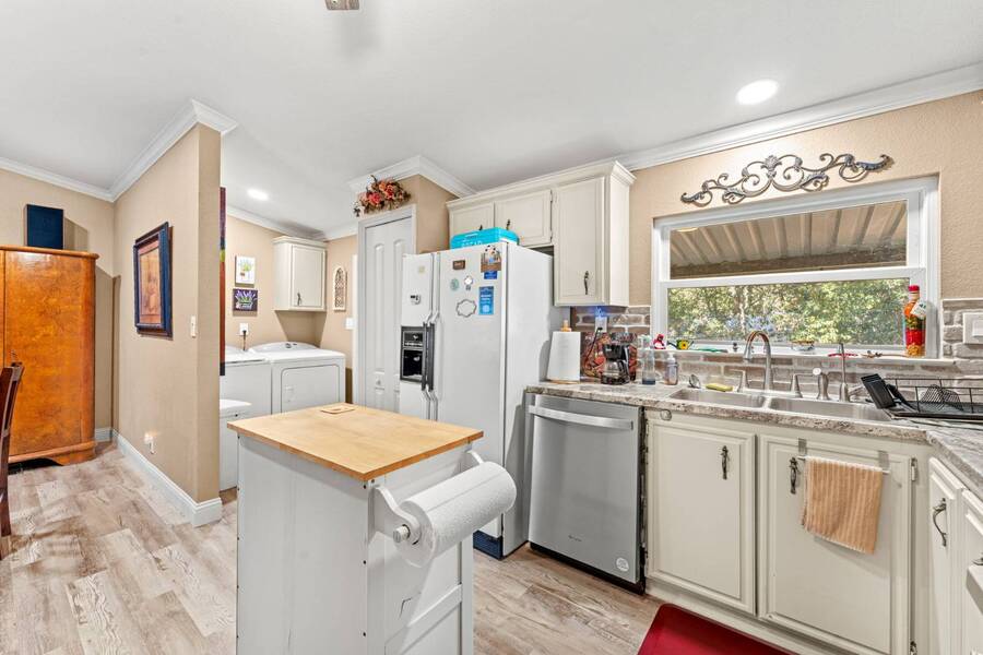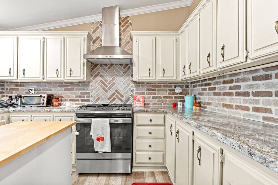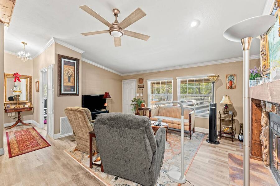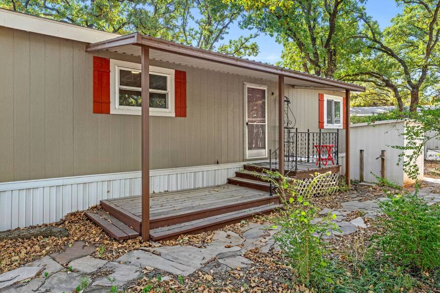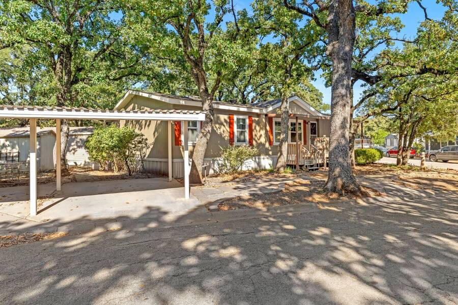 Discover the perfect blend of modern living and comfort in this beautifully renovated 3-bedroom, 2-bathroom double-wide manufactured home at 5726 Kay Dr, located on a corner lot in the well-maintained Camino del Bosque Mobile Home Community, Fort Worth. Every detail has been thoughtfully upgraded, from the freshly redone ceilings and walls to new windows that invite natural light and stylish new flooring with reinforced plywood underneath. The kitchen is a chef's dream, boasting new countertops, a gas stove, new vent hood, backsplash tiles, and painted cabinets, plus a new dishwasher, faucet, sink, ambient lighting under and above the cabinets, and a reverse osmosis system for purified drinking water. Both the master and spare bathrooms have been fully transformed with stunning tile work, new stone accents, updated vanities, and brand-new toilets. Throughout the home, you'll find elegant touches like crown molding, baseboards, recessed lighting with dimmer switches, and upgraded electrical outlets. A new roof was installed in 2023, plush carpeting with premium padding, a new A/C unit, a commercial-grade air conditioning system, a cozy fireplace, and a modern beam detail in the living room for added comfort and style. Outside, the home shines with a covered front porch, charming shutters, window canopies, and lush greenery in the open front space and covered parking space. Complete with a new hot water heater, this home offers luxury, convenience, and the perfect space to call home.