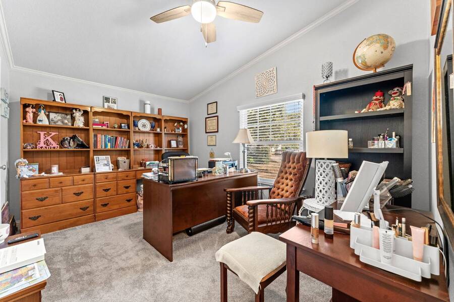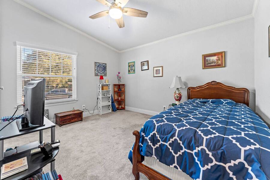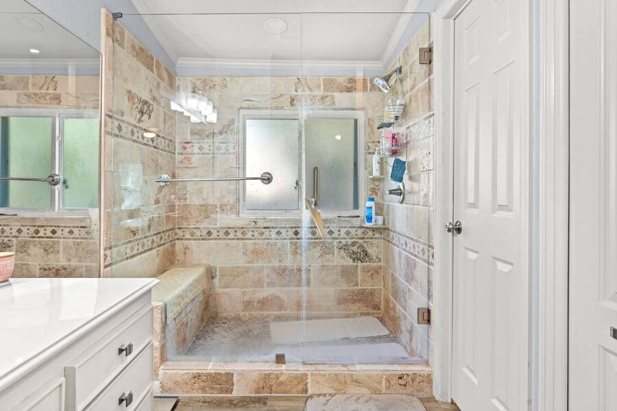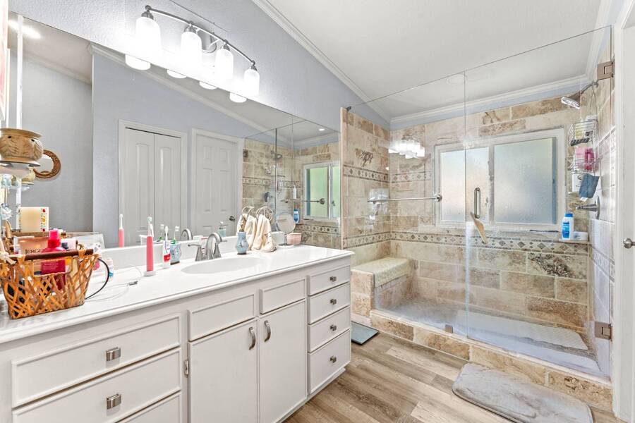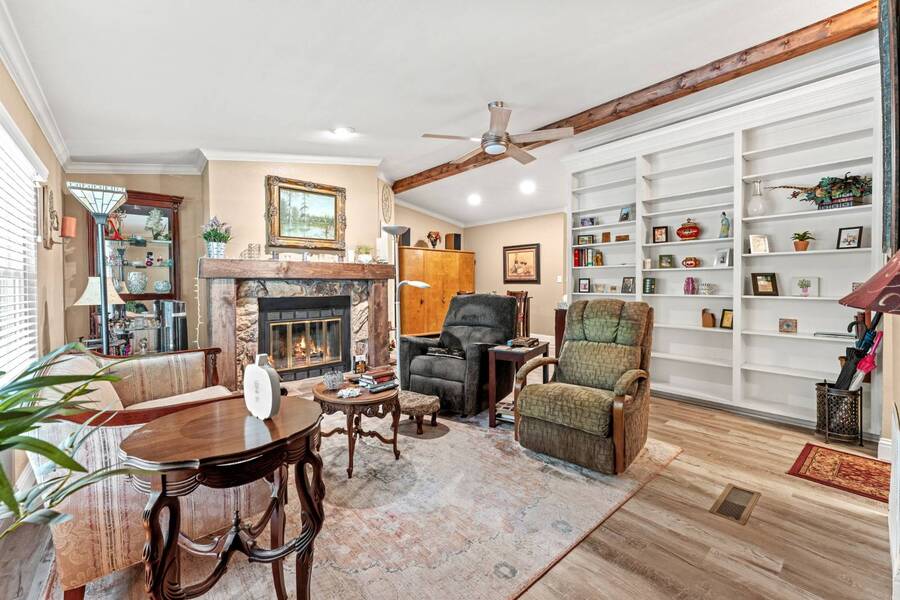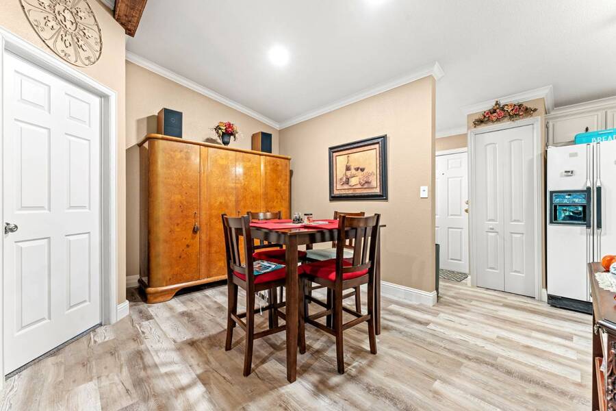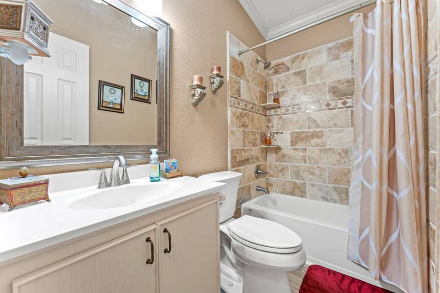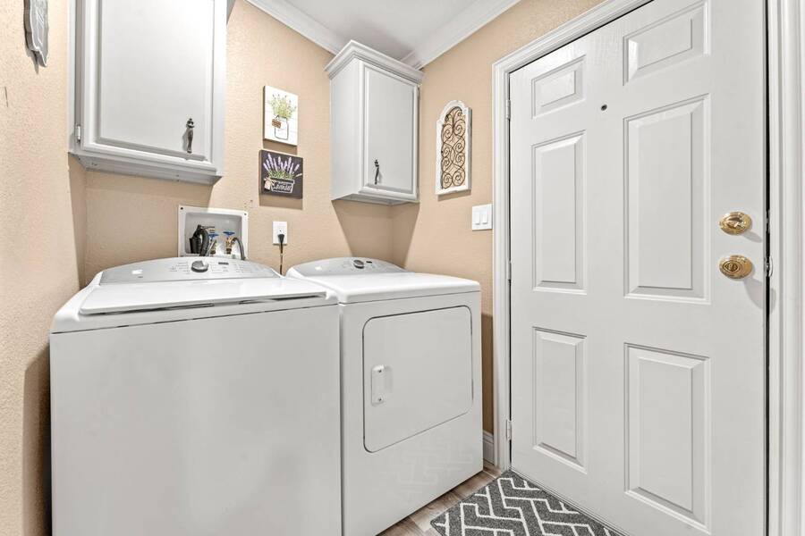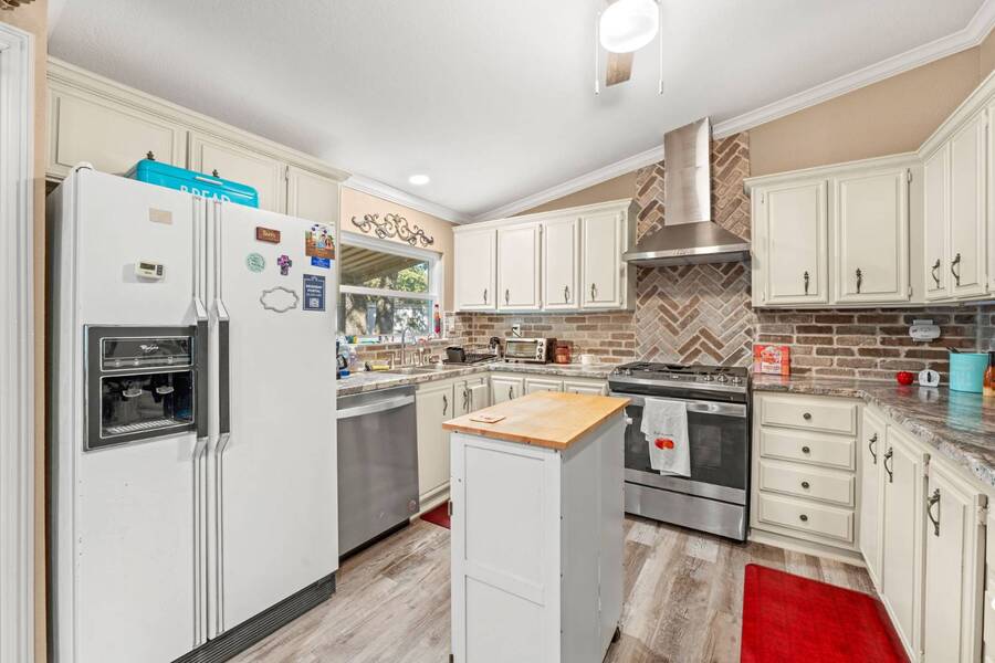 Discover the perfect blend of modern living and comfort in this beautifully renovated 3-bedroom, 2-bathroom double-wide manufactured home at 5726 Kay Dr, located on a corner lot in the well-maintained Camino del Bosque Mobile Home Community, Fort Worth. Every detail has been thoughtfully upgraded, from the freshly redone ceilings and walls to new windows that invite natural light and stylish new flooring with reinforced plywood underneath. The kitchen is a chef's dream, boasting new countertops, a gas stove, new vent hood, backsplash tiles, and painted cabinets, plus a new dishwasher, faucet, sink, ambient lighting under and above the cabinets, and a reverse osmosis system for purified drinking water. Both the master and spare bathrooms have been fully transformed with stunning tile work, new stone accents, updated vanities, and brand-new toilets. Throughout the home, you'll find elegant touches like crown molding, baseboards, recessed lighting with dimmer switches, and upgraded electrical outlets. A new roof was installed in 2023, plush carpeting with premium padding, a new A/C unit, a commercial-grade air conditioning system, a cozy fireplace, and a modern beam detail in the living room for added comfort and style. Outside, the home shines with a covered front porch, charming shutters, window canopies, and lush greenery in the open front space and covered parking space. Complete with a new hot water heater, this home offers luxury, convenience, and the perfect space to call home.