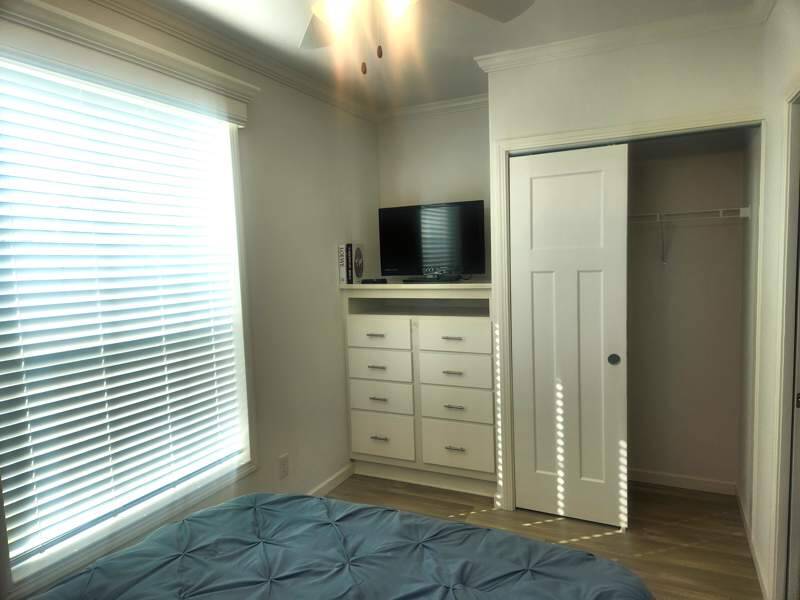 Bedroom has generous closet with built-in shelving plus a custom bureau with an open storage space for eye glasses and everything else you usually misplace, plus a top shelf for your television.
