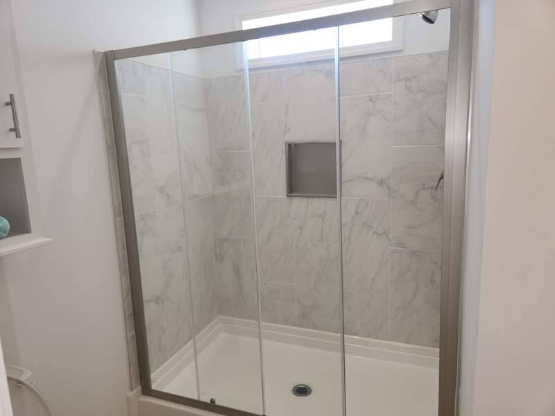 Bathroom has upgraded walk-in shower with glass door and marble tiles. Transom window lets in plenty of sunlight. Spacious vanity and storage cabinet makes your morning routine a breeze.