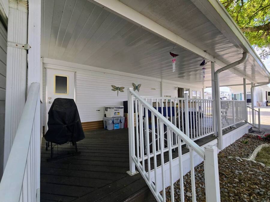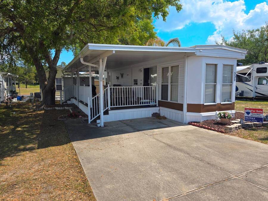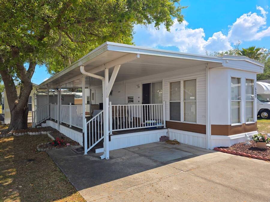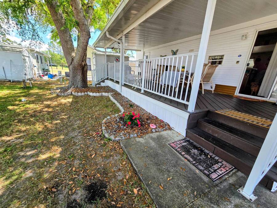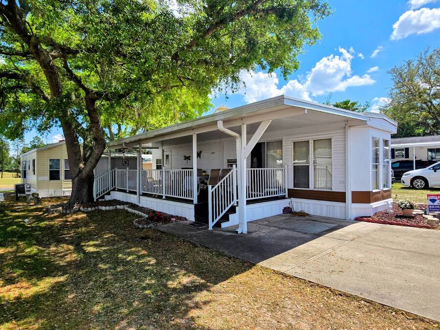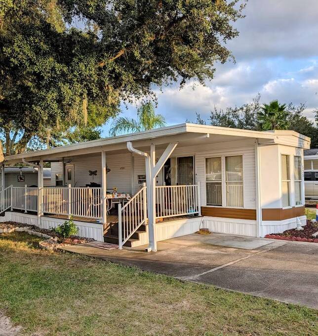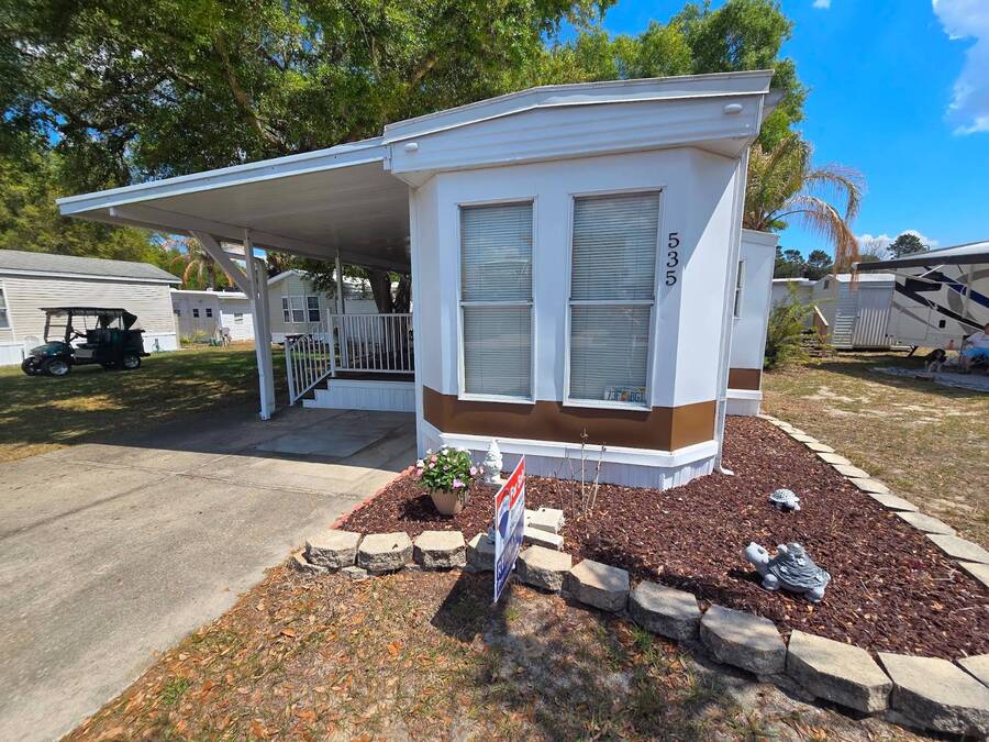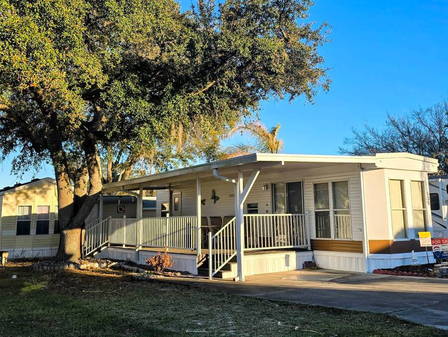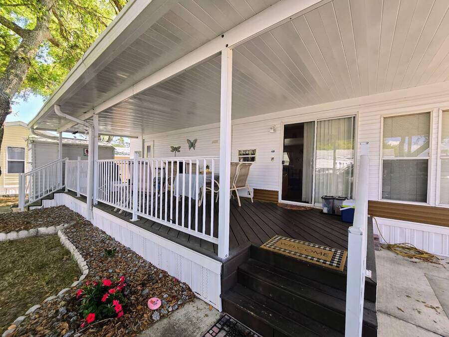 What a great Breckenridge Model with newer membrane roof and heat pump. Spend a little or a lot of time here with flex lot plans in Recreation Plantation. The covered deck is a stand out and a great gathering place for new and old friends! Add an on-site washer dryer set up in the outbuilding and you have your own mini paradise. Ample parking in front on on the side of this Unit. This one has a private bedroom at the back of the Unit and then a bonus room at the front of the Unit that could b a craft area, a guest quarters or even an office area and it has a hide a bed loveseat. The Kitchen has the natural wood look and an expandable dining area that's just right for quick meals or intimate meals with guests. The outdoor covered porch is the perfect meeting place for all! Park resident approval is a must. Look at this fun spot because it's not a 55+ only community. Happy life starts right here! Golf carts, bicycles, and a pet friendly community is the tasty icing on this piece of Paradise. 2 huge pools, 2 hots tubs, 3 club houses, 14 Pickleball courts, tennis, bocce, sand volley ball, billiards, card games with friends, weekend dances and sooooo much more. A fun community for walks, talks and pet friendly.