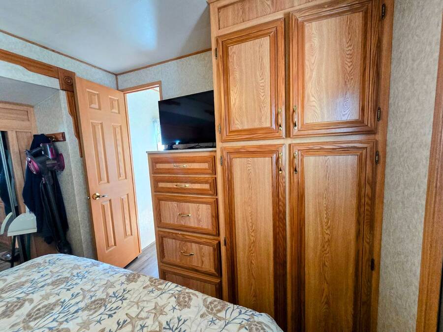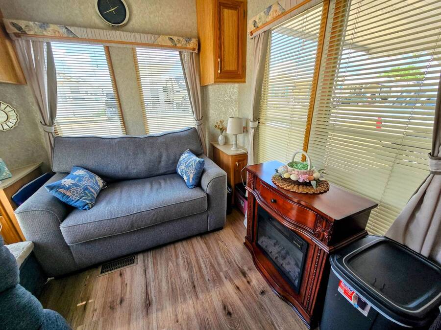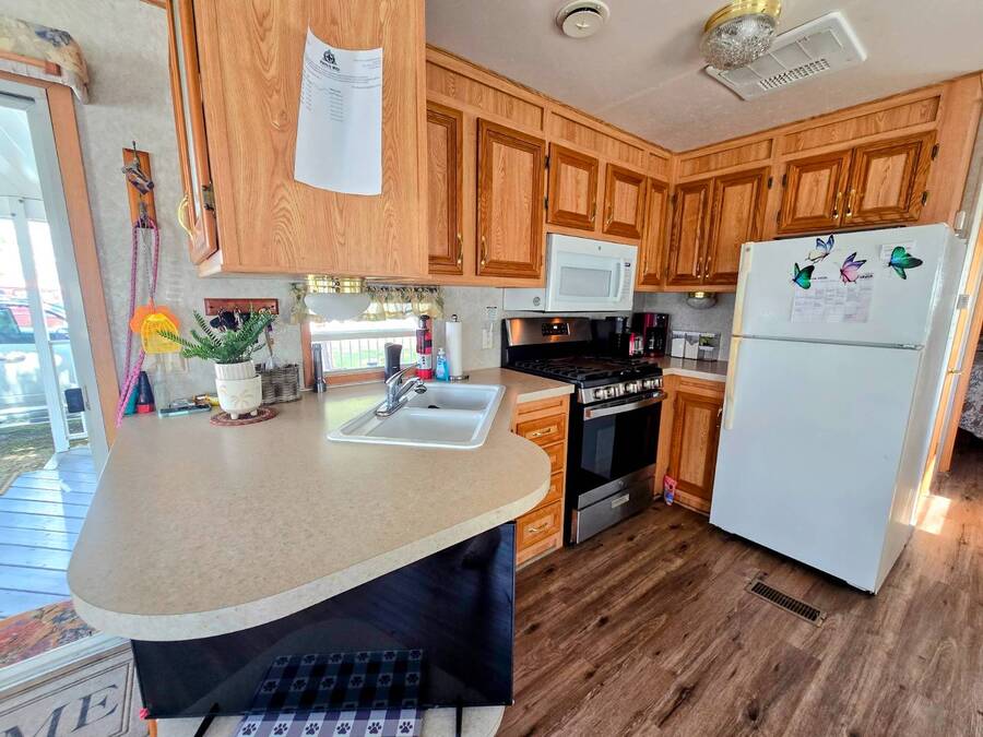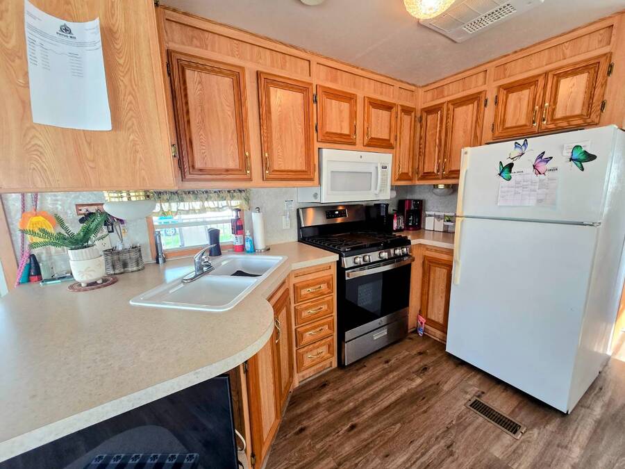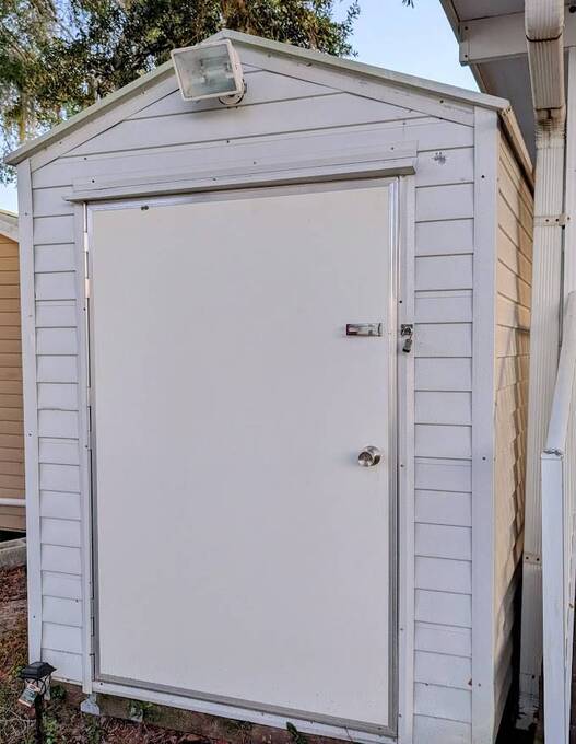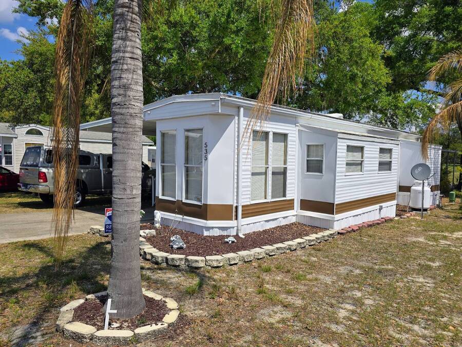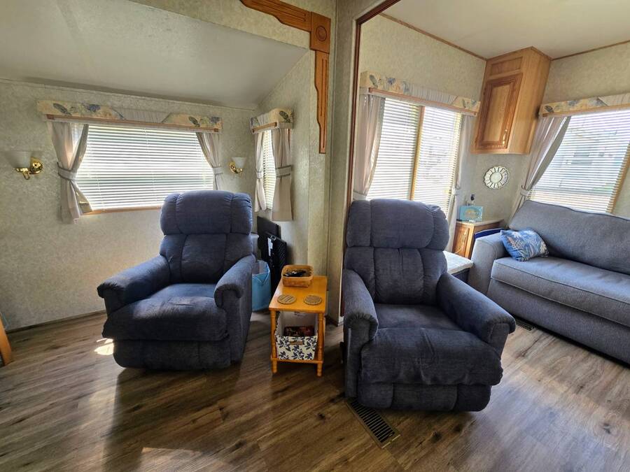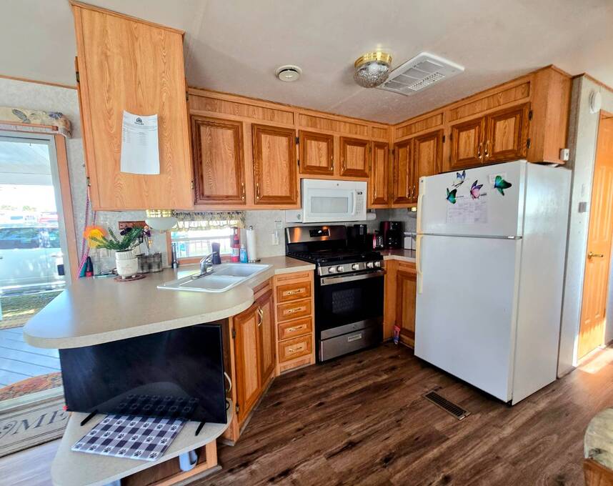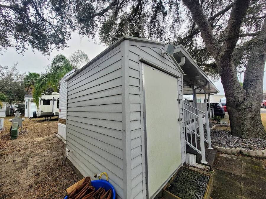 What a great Breckenridge Model with newer membrane roof and heat pump. Spend a little or a lot of time here with flex lot plans in Recreation Plantation. The covered deck is a stand out and a great gathering place for new and old friends! Add an on-site washer dryer set up in the outbuilding and you have your own mini paradise. Ample parking in front on on the side of this Unit. This one has a private bedroom at the back of the Unit and then a bonus room at the front of the Unit that could b a craft area, a guest quarters or even an office area and it has a hide a bed loveseat. The Kitchen has the natural wood look and an expandable dining area that's just right for quick meals or intimate meals with guests. The outdoor covered porch is the perfect meeting place for all! Park resident approval is a must. Look at this fun spot because it's not a 55+ only community. Happy life starts right here! Golf carts, bicycles, and a pet friendly community is the tasty icing on this piece of Paradise. 2 huge pools, 2 hots tubs, 3 club houses, 14 Pickleball courts, tennis, bocce, sand volley ball, billiards, card games with friends, weekend dances and sooooo much more. A fun community for walks, talks and pet friendly.