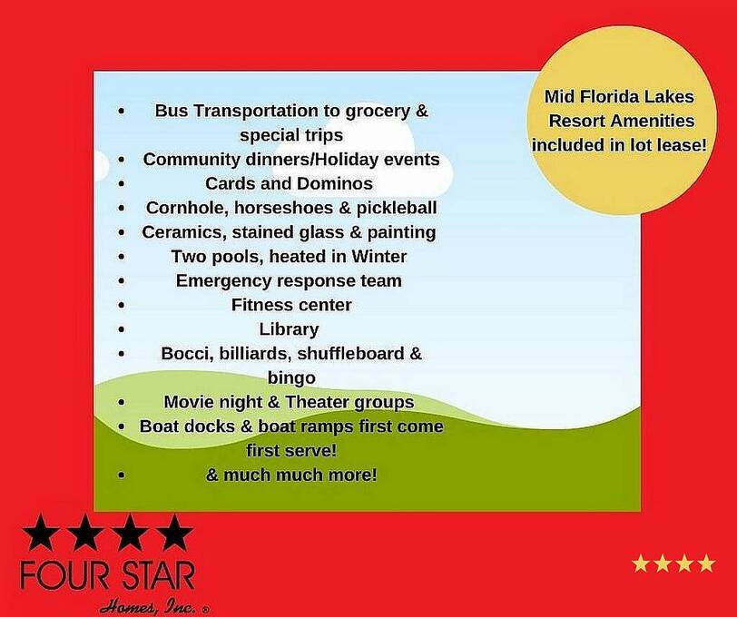 Welcome to this well-maintained 2002 Jacobsen doublewide located in the highly sought-after 55 plus community of Mid FL Lakes. This home features a spacious double driveway and a beautifully landscaped yard that adds great curb appeal. Inside, you will love the L-shaped kitchen with a convenient island breakfast bar, perfect for casual dining and entertaining. The home includes an inside laundry area with washer and dryer, two comfortable bedrooms, and two full baths for added convenience. Enjoy your morning coffee or unwind in the evening on the screened porch overlooking peaceful views, a perfect spot to relax and soak in the Florida lifestyle. Mid FL Lakes is an active 55 plus community offering Chain of Lakes access, a friendly atmosphere, and plenty of activities for residents. Do not miss your chance to own this charming home, it is the perfect blend of comfort, convenience, and location. Call today for your private showing.