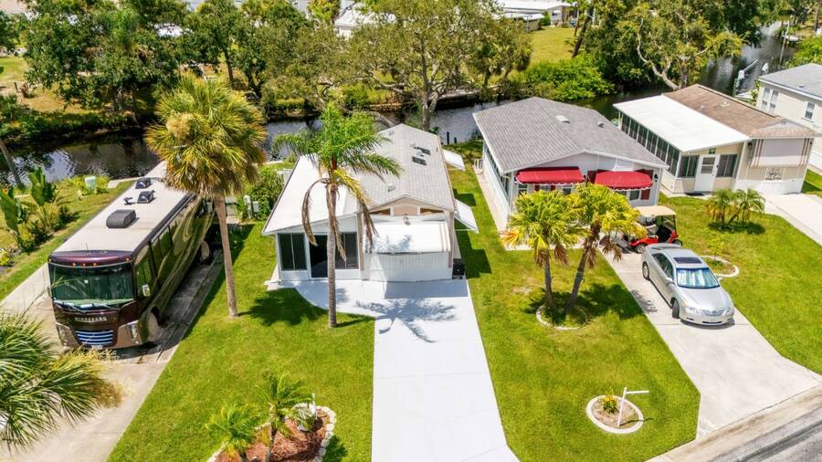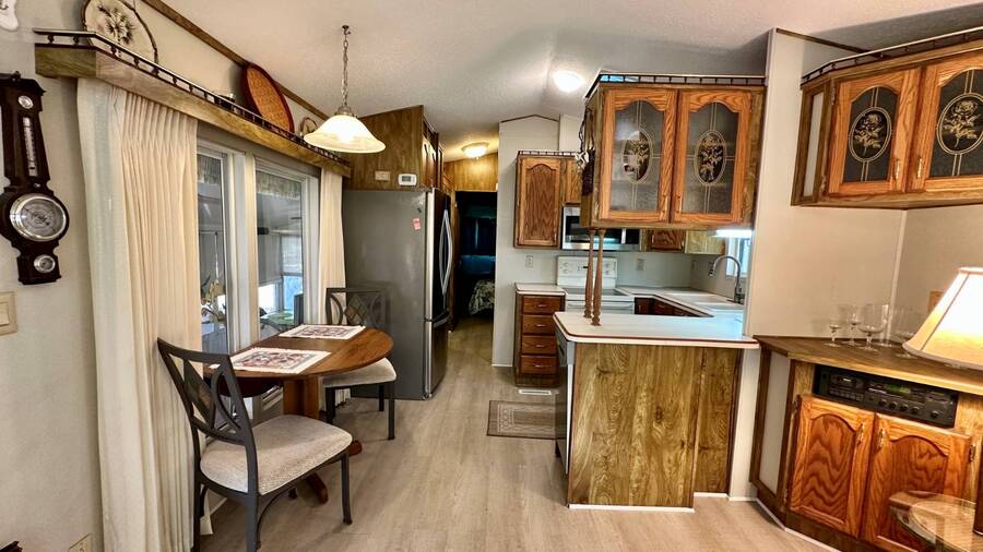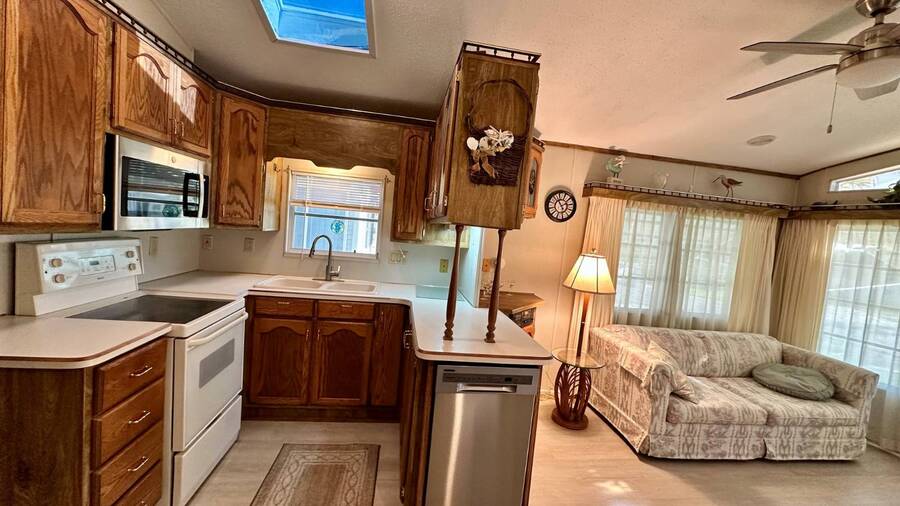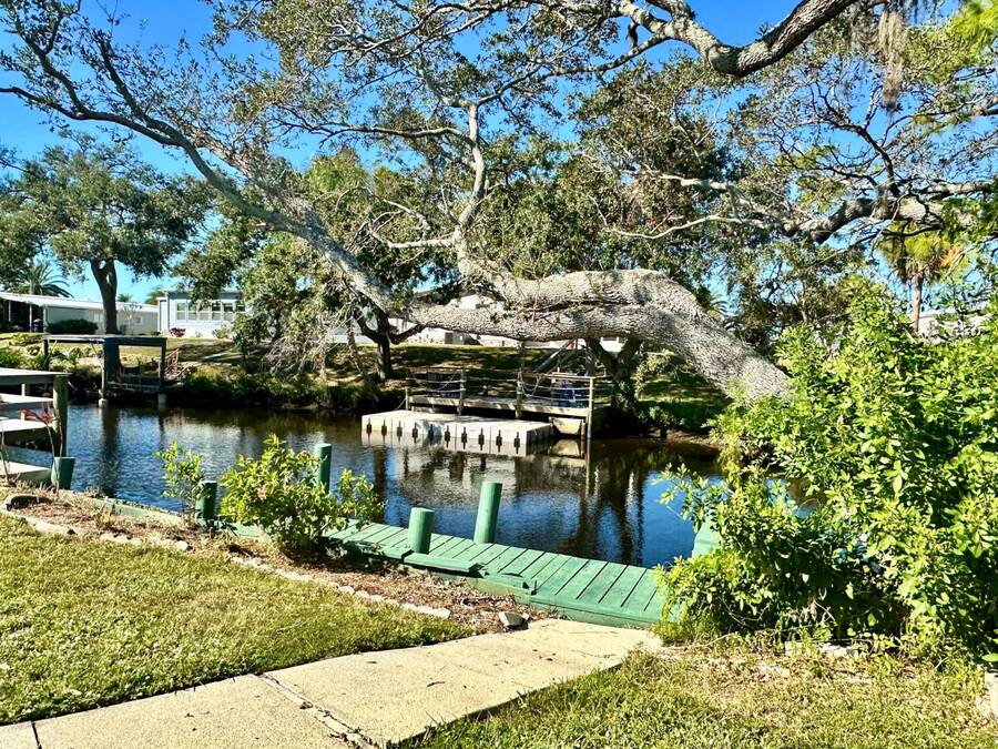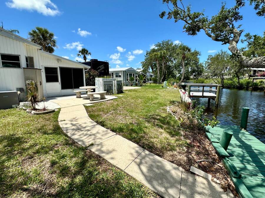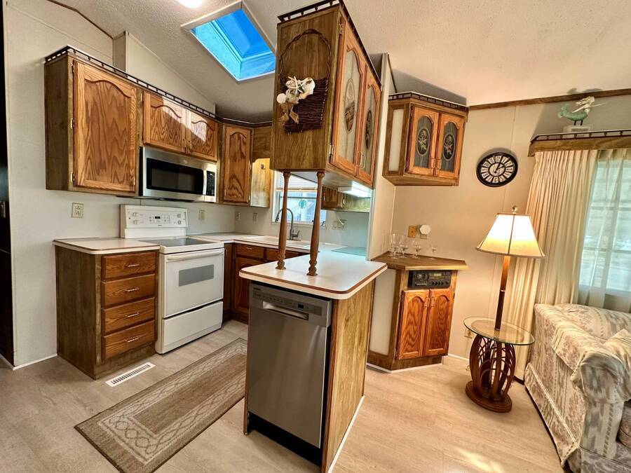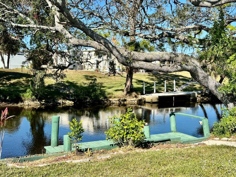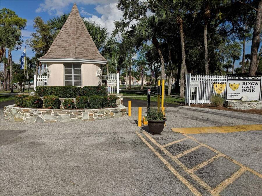 Waterfront Living with Modern Comforts... This charming home offers both style and functionality, featuring new vinyl plank flooring, a stainless steel dishwasher, and a built-in microwave. The kitchen boasts classic oak cabinetry, a convenient pantry, and a water filtration system. The spacious living room with cathedral ceilings includes a cozy corner bar, four new Hunter ceiling fans, and a comfortable La-Z-Boy sofa with an air bed - perfect for guests. The primary bedroom includes a built-in desk and a stackable washer and dryer for added convenience. Step outside to the concrete patio and seating area, ideal for relaxing or entertaining. Enjoy peace of mind with a new shingled roof (installed in 2022) complete with a transferable warranty, plus skylights that brighten the kitchen and bathroom. Best of all, this property includes access to a dock and the Intracoastal Waterway leading out to beautiful Dona Bay - perfect for boating or simply soaking up the coastal lifestyle. King's Gate Park is an adult community for persons 55 or older and is a Florida Condo Association. The Park is located 3 miles from the Gulf Beaches, golf courses, hospital, restaurants and cultural activities in nearby Venice and Sarasota. Amenities include pool, tennis, pickleball and shuffleboard courts to name a few and activities almost every day.