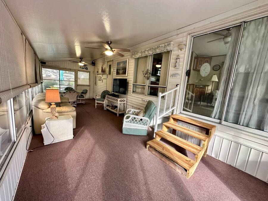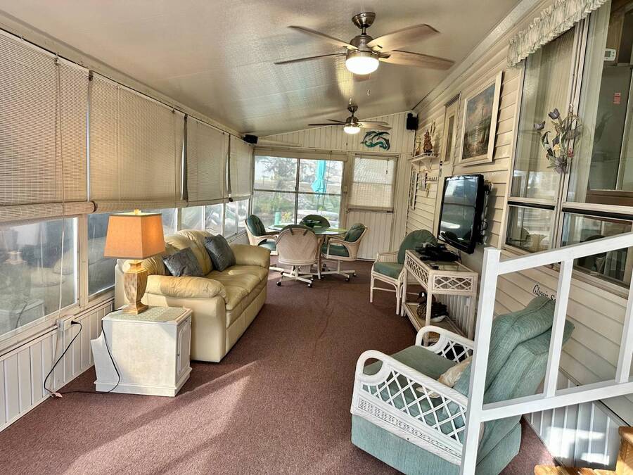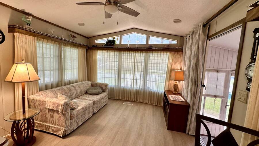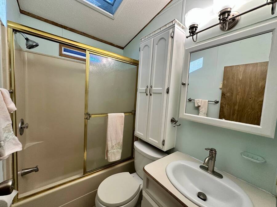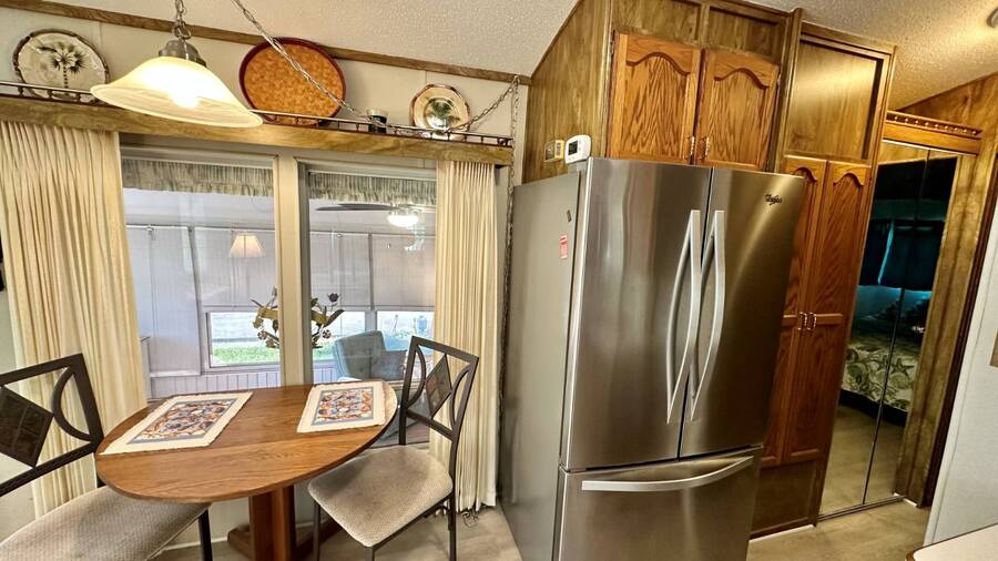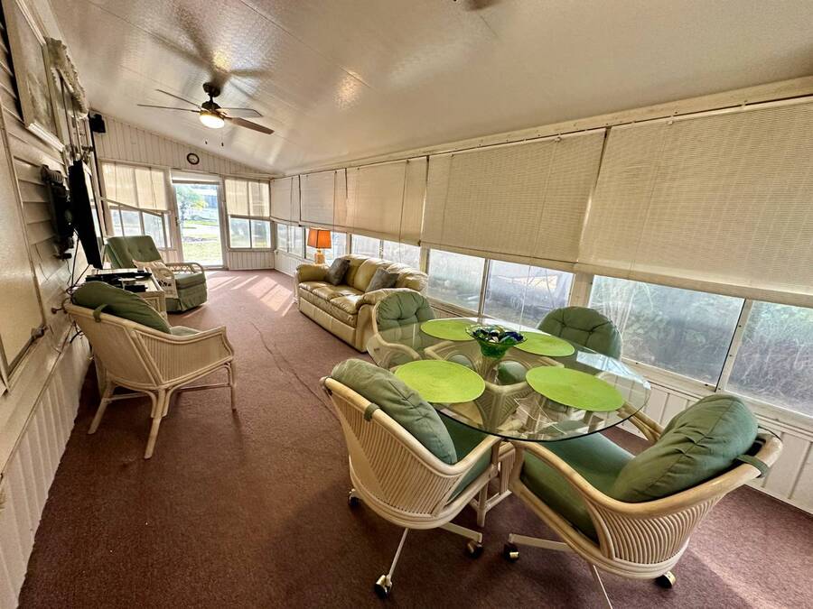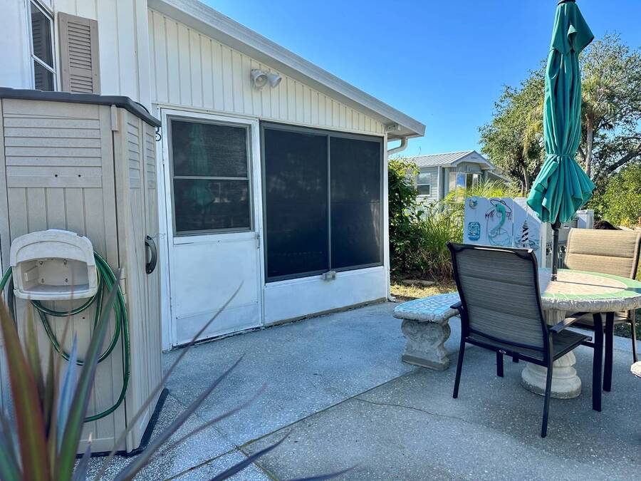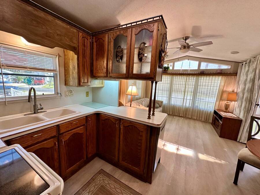 Waterfront Living with Modern Comforts... This charming home offers both style and functionality, featuring new vinyl plank flooring, a stainless steel dishwasher, and a built-in microwave. The kitchen boasts classic oak cabinetry, a convenient pantry, and a water filtration system. The spacious living room with cathedral ceilings includes a cozy corner bar, four new Hunter ceiling fans, and a comfortable La-Z-Boy sofa with an air bed - perfect for guests. The primary bedroom includes a built-in desk and a stackable washer and dryer for added convenience. Step outside to the concrete patio and seating area, ideal for relaxing or entertaining. Enjoy peace of mind with a new shingled roof (installed in 2022) complete with a transferable warranty, plus skylights that brighten the kitchen and bathroom. Best of all, this property includes access to a dock and the Intracoastal Waterway leading out to beautiful Dona Bay - perfect for boating or simply soaking up the coastal lifestyle. King's Gate Park is an adult community for persons 55 or older and is a Florida Condo Association. The Park is located 3 miles from the Gulf Beaches, golf courses, hospital, restaurants and cultural activities in nearby Venice and Sarasota. Amenities include pool, tennis, pickleball and shuffleboard courts to name a few and activities almost every day.