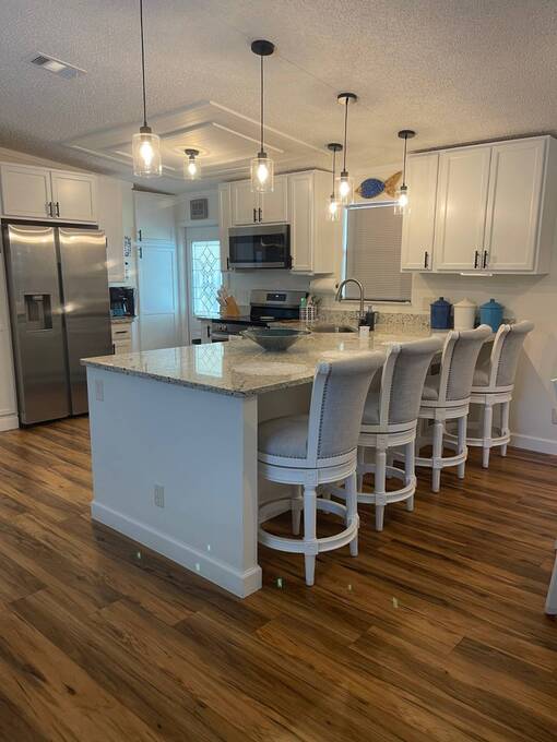 This beautiful, unfurnished home is move-in ready! The brand-new kitchen features custom cabinets, granite countertops, a huge 4' x 10' island with electric and USB ports, stainless steel appliances, and modern lighting. Master bedroom has a large walk-in closet. Both bathrooms are fully renovated with stylish upgrades, including a rain showerhead and accent lighting in the guest bathroom for a spa-like feel. Additional updates include all-new drywall, doors, hardware, and a 2024 hurricane-rated roof. All new plumbing. Relax and entertain in the Florida room with A/C, custom blinds, and French doors. This home sits on a corner lot and the oversized driveway provides parking for multiple vehicles. Black Golf Cart included.