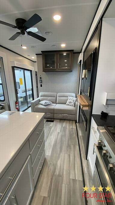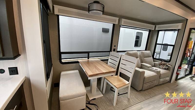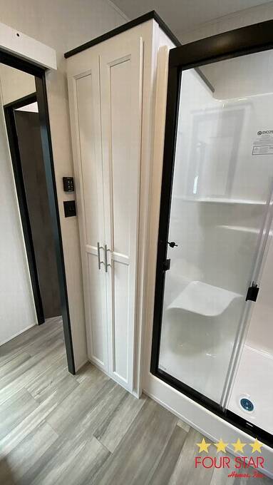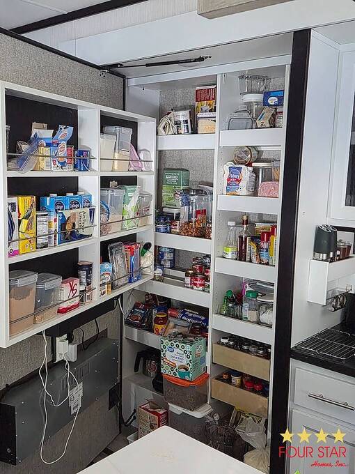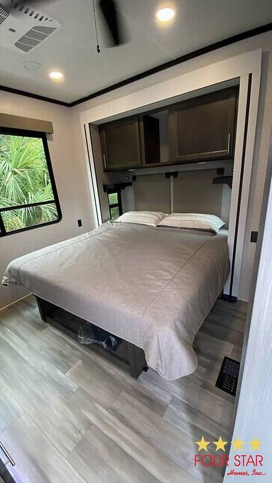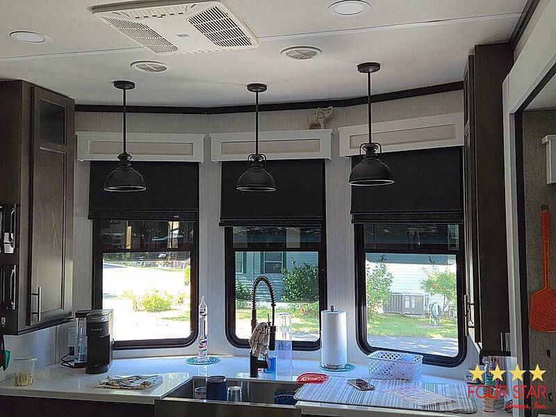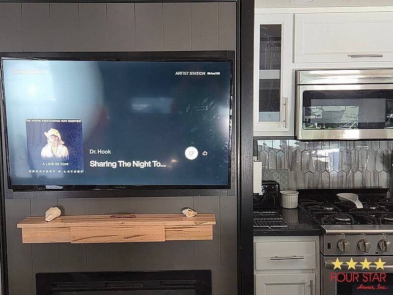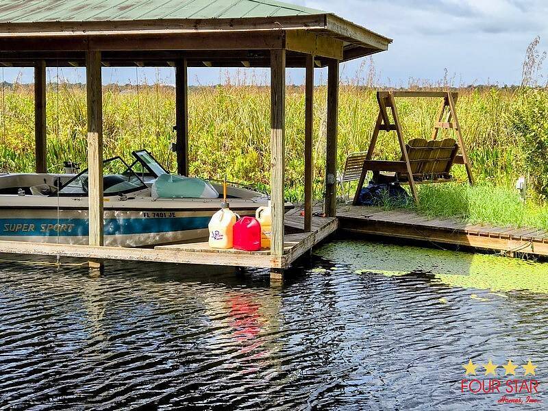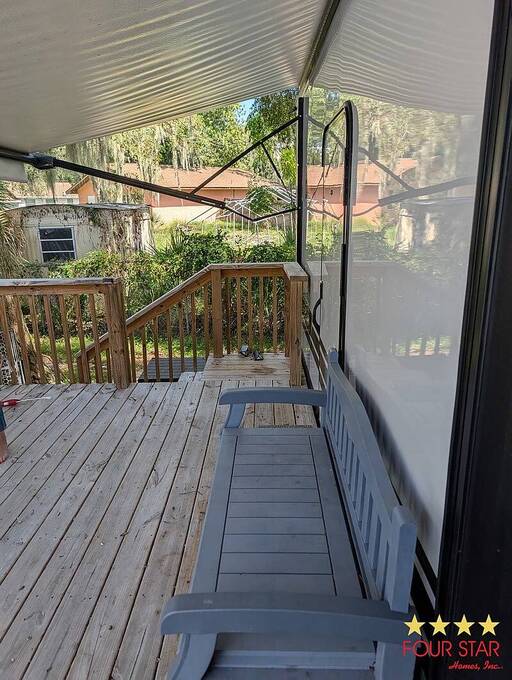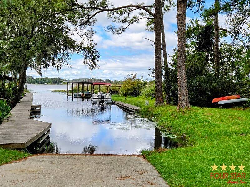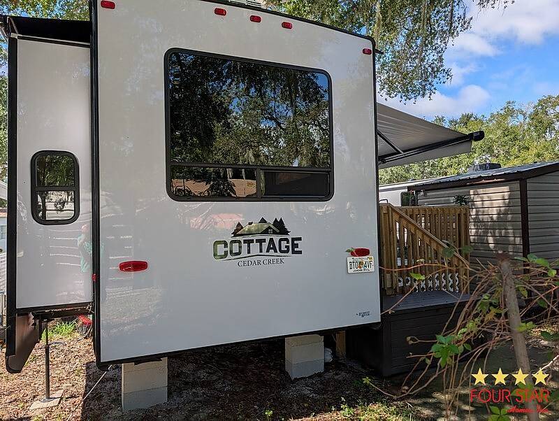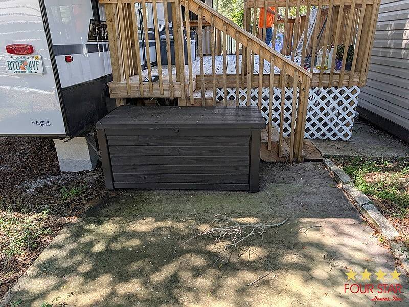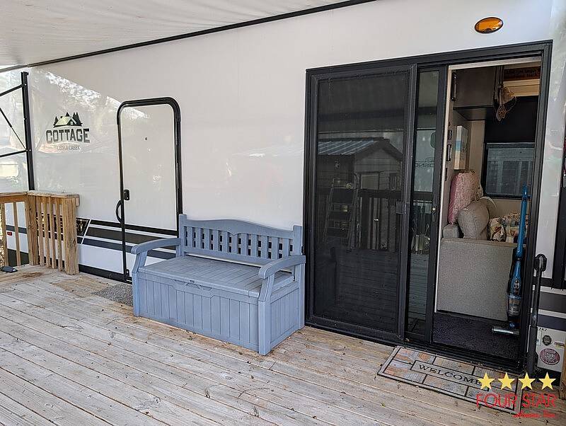 Tinted Windows, Upgrade Appliances, 20 Gallon Water Heater, 40 Gallon Holding Tank, Pantry behind Big Screen TV, Hidden Dishwasher, Bath Seat in Shower, 2 Sinks in Bath, Membrane Roof, Enhanced insulation, Newly Built Deck with steps in front and rear, Anchored, Blocked, and Leveled for stability, Storage building, Three Slide outs, 2019 GEM E Car included with acceptable offer, Waterfront Picnic Area, Boat Ramp and Fishing Dock. No Odors from Smoking or Pets.