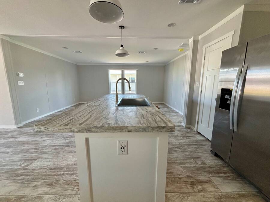 The kitchen steals the show with a large island a stylish farmhouse sink, a stove with a hood, and a convenient pantry. The kitchen flows seamlessly into the dining and living areas, creating the perfect setup for entertaining or simply enjoying the spacious feel of the home.