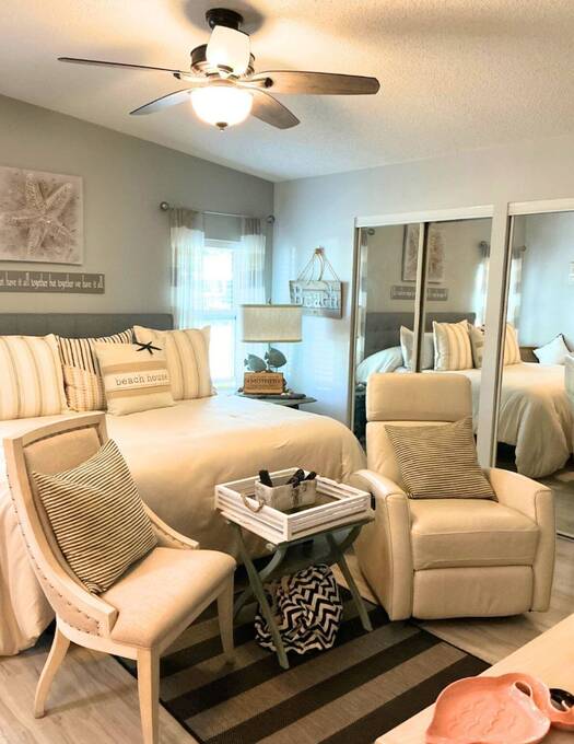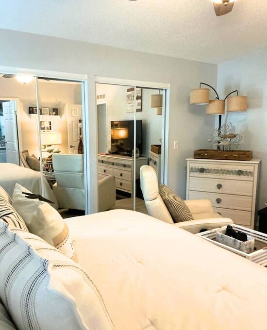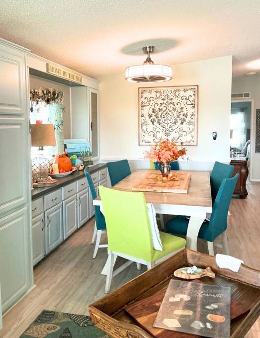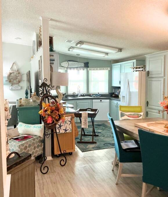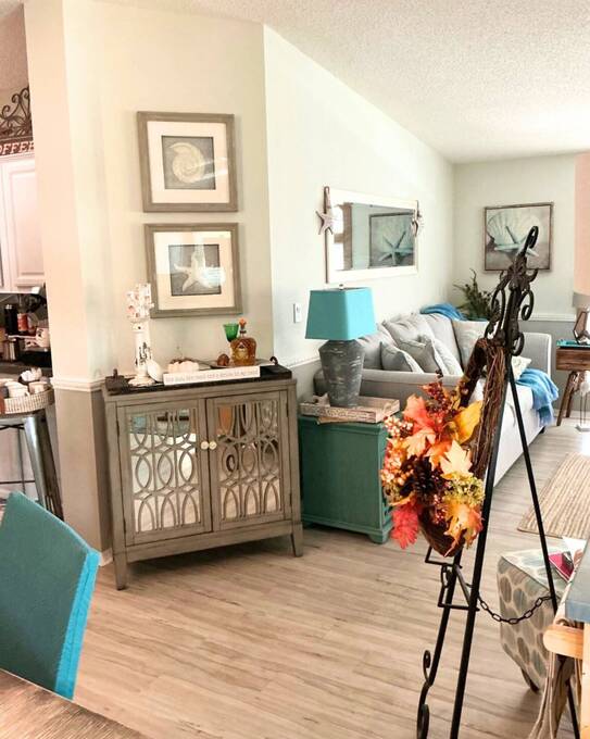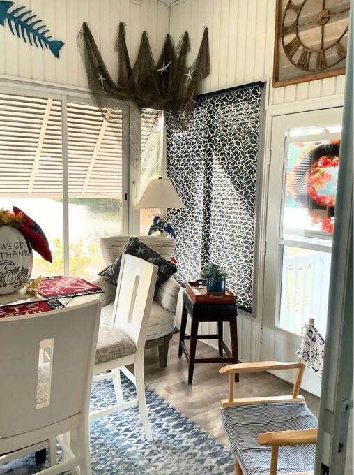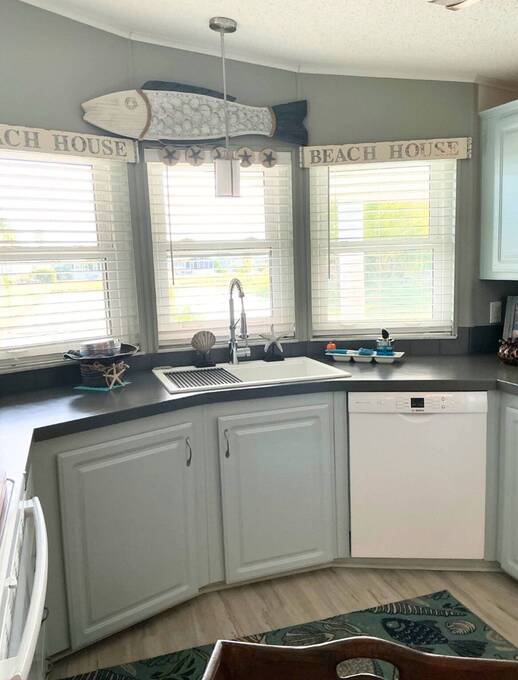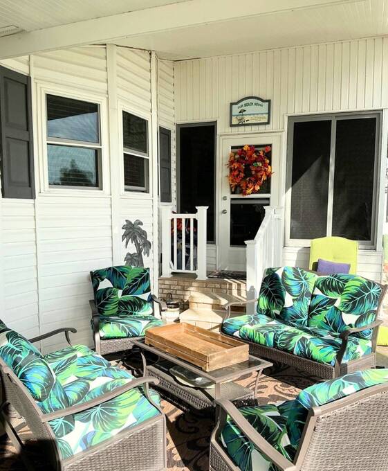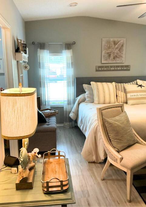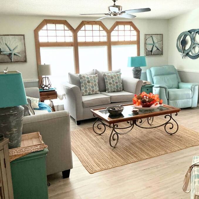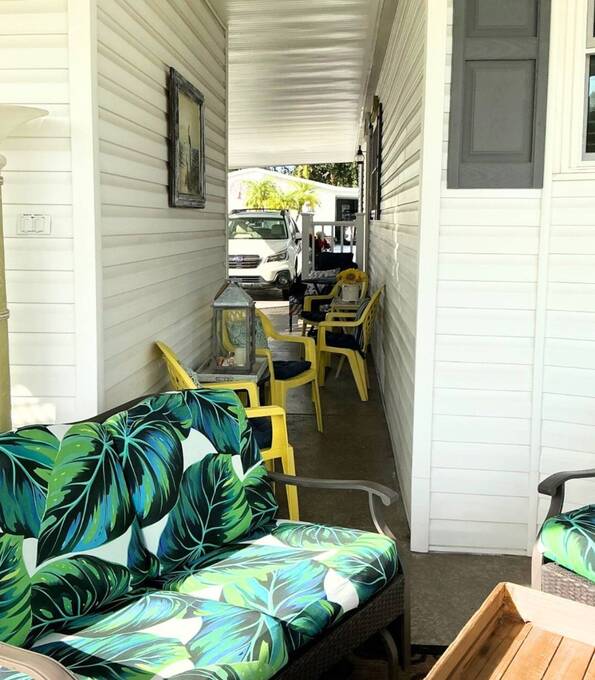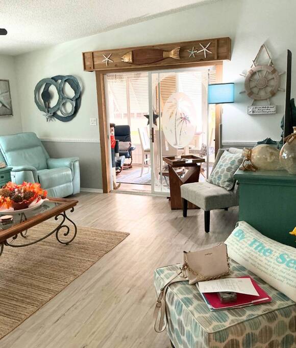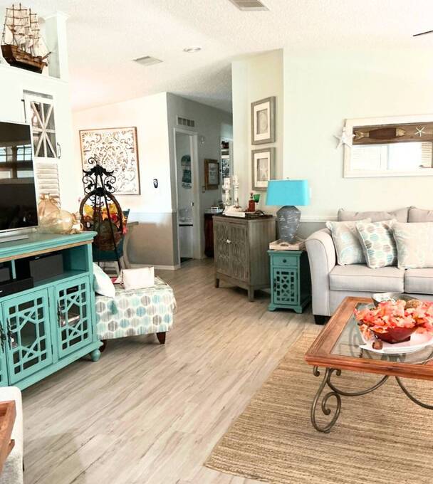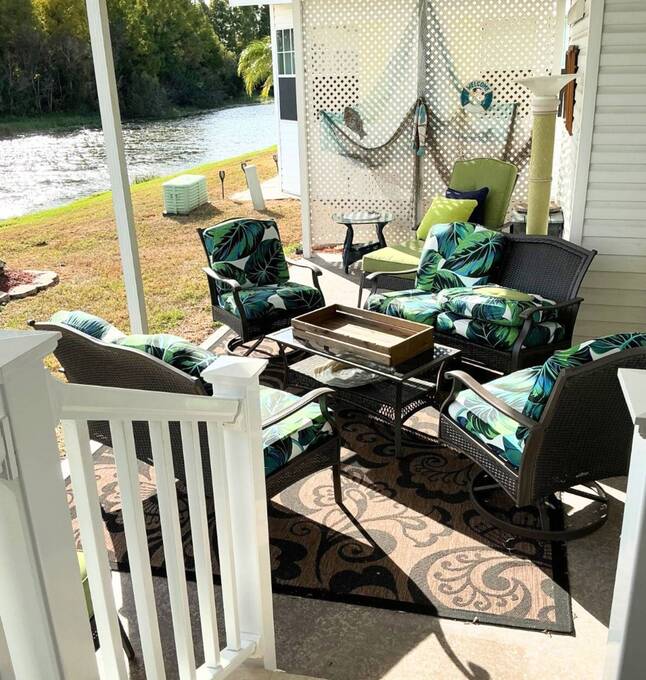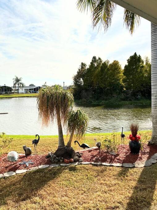 Experience luxury and comfort in this one of a kind, turnkey beach style Jacobsen home, boasting over 1,400 square feet of beautifully designed interiors and prime water views. This home features numerous upgrades, including vinyl flooring, new roofing, double -pane windows, and newer appliances. The master bath is a spa-like retreat with a walk in enclosure, custom glass doors, double sinks, and added storage. The remodeled lanai is perfect for relaxation, featuring a split AC unit, custom windows, and tasteful furnishings. Step outside onto the covered patio, complete with outdoor seating and a lounge set, all overlooking a serene lake and nature preserve. Residents also enjoy exclusive access to a vibrant clubhouse with a gym, billiards room, a library, a large heated pool and hot tub, a pavilion with a kitchen and 2 gas grills. Relaxed seating around a fire pit for cool evenings. The Gardens also offer recreational courts for tennis, pickle ball, horse shoes, and shuffle board. There's always something fun to do.