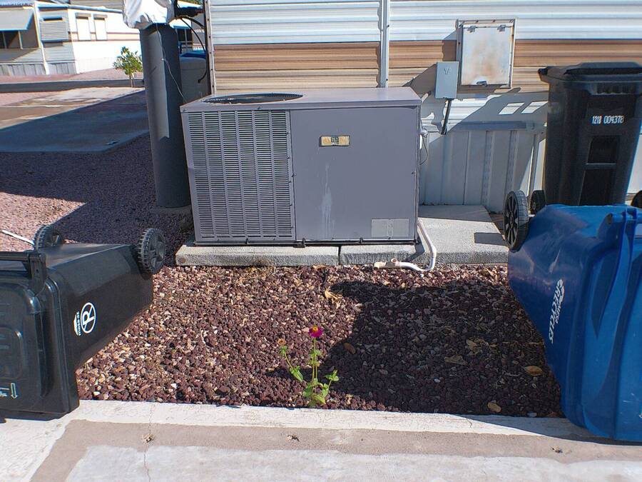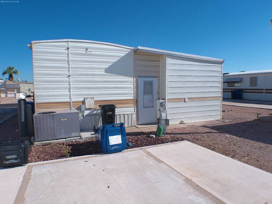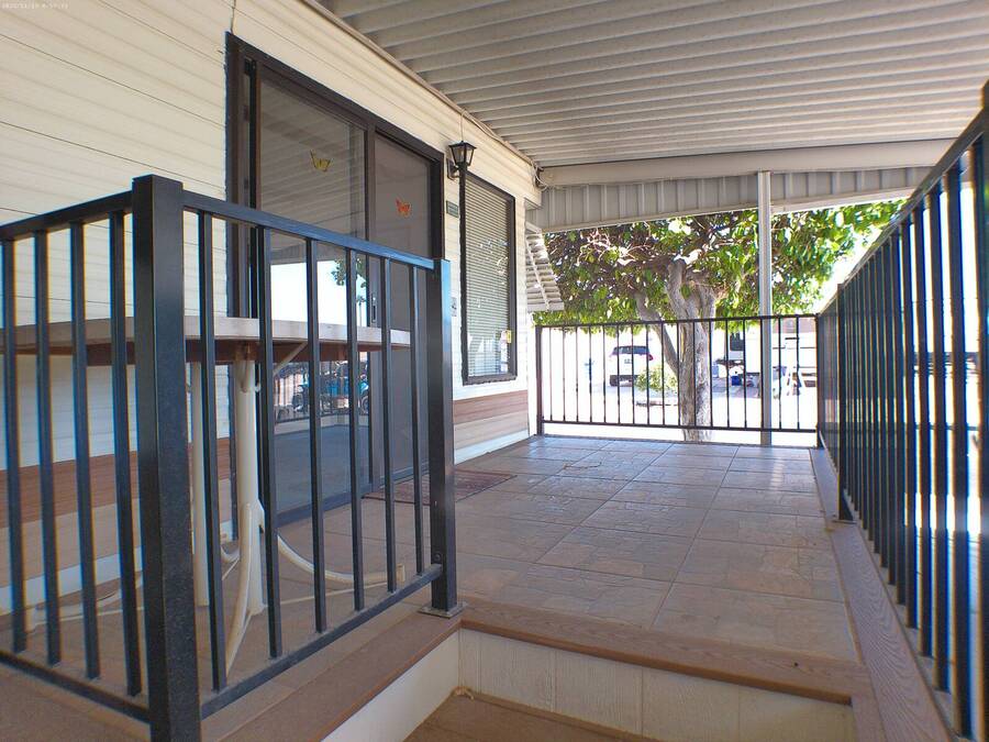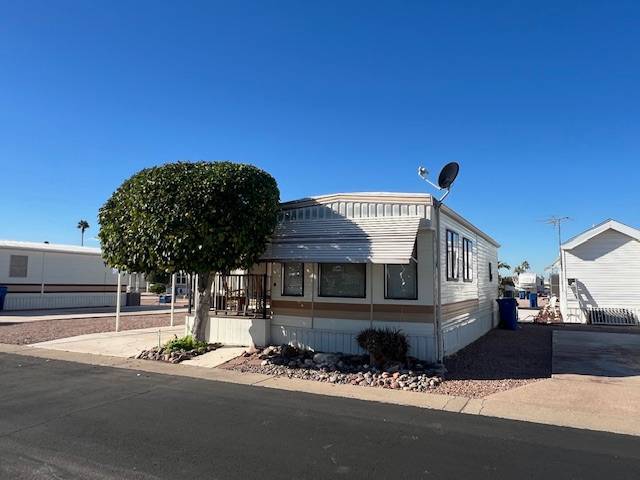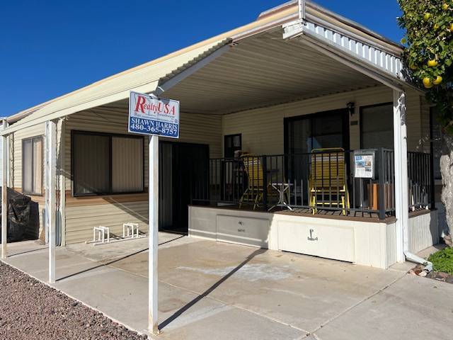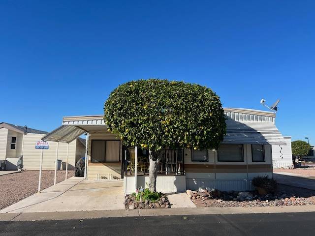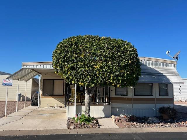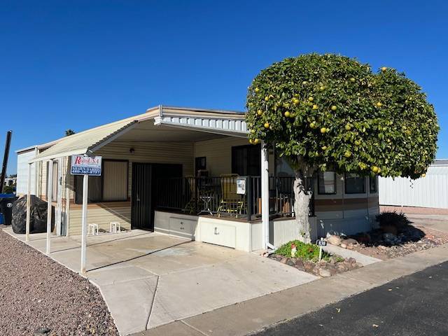 Located in a premier resort full of activities, this park model features raised tiled front deck for outdoor living. There are two sliding glass doors with screens. Living room with two recliners, ceiling fan, and a mix of carpet and laminate flooring. Kitchen features stainless steel Frigidaire Professional built-in microwave, dishwasher, and stove; deep Kohler sink with upgraded faucet and garbage disposal; built-in knife rack; laminate countertops; and plenty of cabinet storage. Large bathroom with Step-in shower, with built-in drawers, and a ceiling vent. Bedroom includes a queen-size bed (with room for a king), built-in dresser, mirrored closet doors, and a ceiling fan. Extra half bath with water-saving toilet and pocket doors. Finished Arizona room with textured walls and ceiling tiles, sofa sleeper, and a built-in shed offering additional storage, countertops, and a washer and dryer. Culligan Water Softener. Some items pictured may not convey. Lot rent is shown as monthly estimated that is due annually, in August of each year. Call today to view this home!