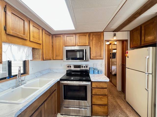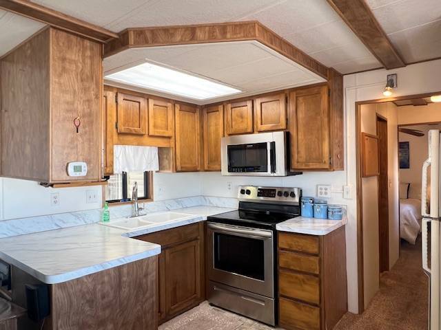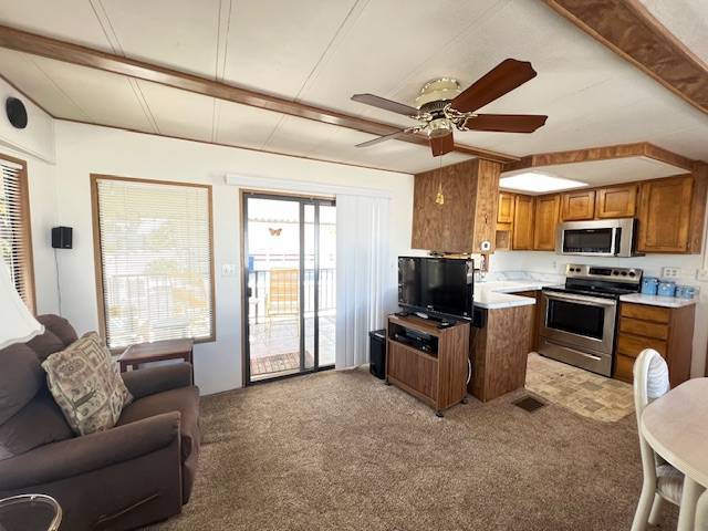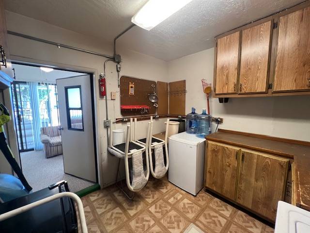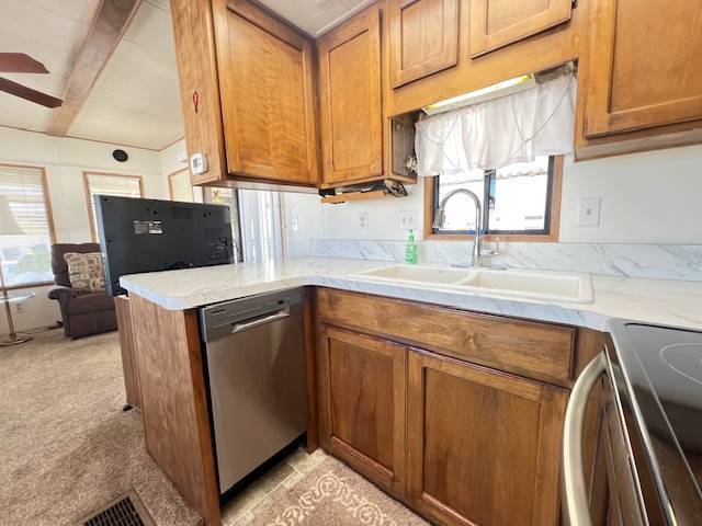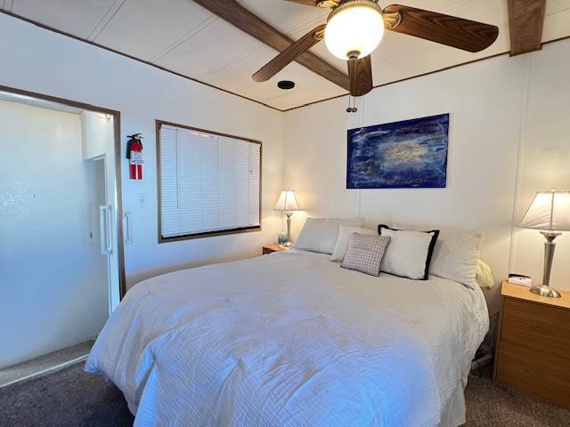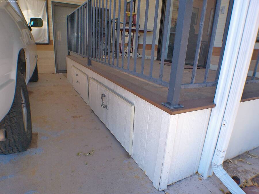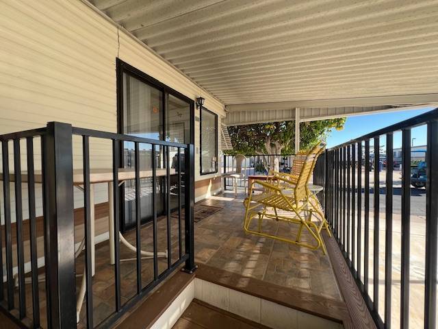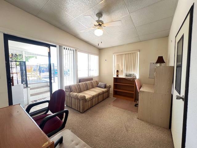 Located in a premier resort full of activities, this park model features raised tiled front deck for outdoor living. There are two sliding glass doors with screens. Living room with two recliners, ceiling fan, and a mix of carpet and laminate flooring. Kitchen features stainless steel Frigidaire Professional built-in microwave, dishwasher, and stove; deep Kohler sink with upgraded faucet and garbage disposal; built-in knife rack; laminate countertops; and plenty of cabinet storage. Large bathroom with Step-in shower, with built-in drawers, and a ceiling vent. Bedroom includes a queen-size bed (with room for a king), built-in dresser, mirrored closet doors, and a ceiling fan. Extra half bath with water-saving toilet and pocket doors. Finished Arizona room with textured walls and ceiling tiles, sofa sleeper, and a built-in shed offering additional storage, countertops, and a washer and dryer. Culligan Water Softener. Some items pictured may not convey. Lot rent is shown as monthly estimated that is due annually, in August of each year. Call today to view this home!
