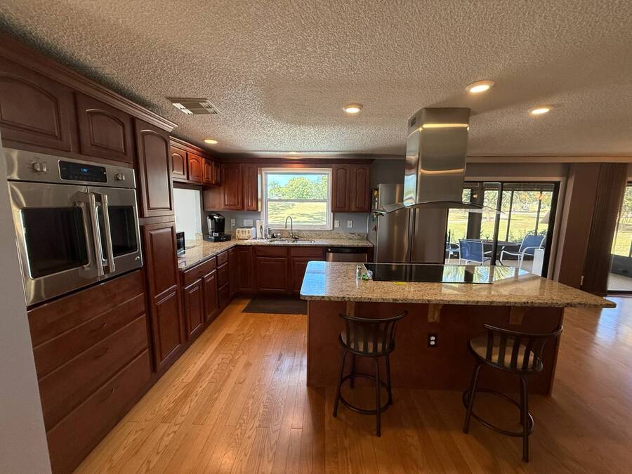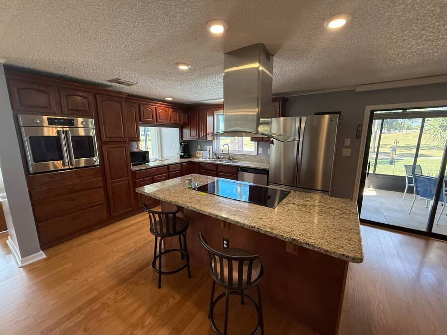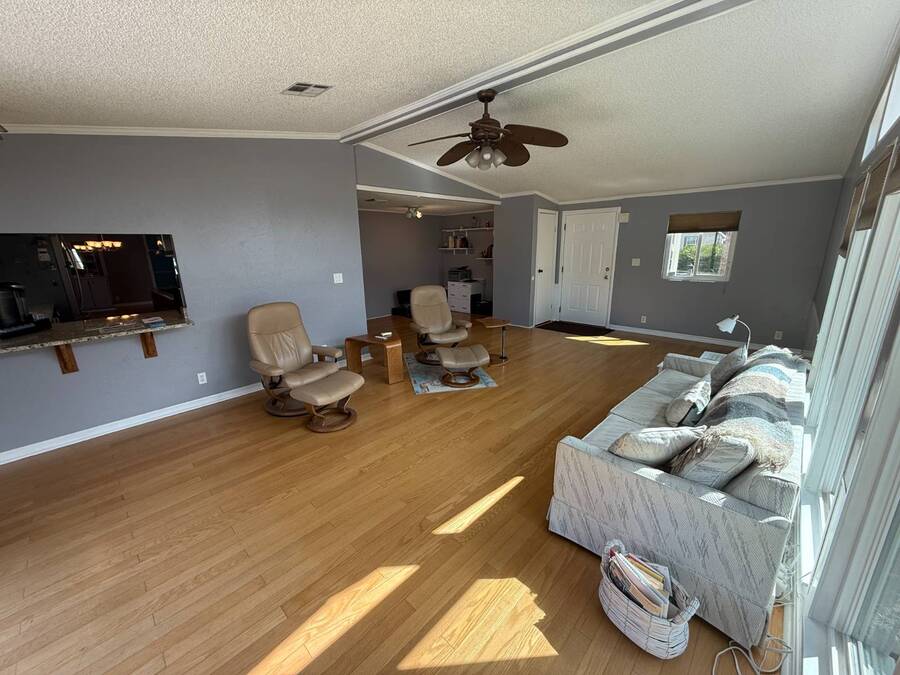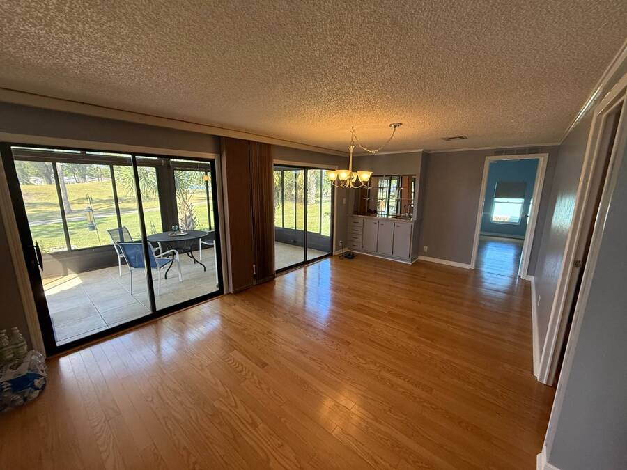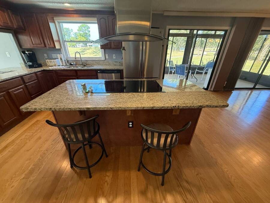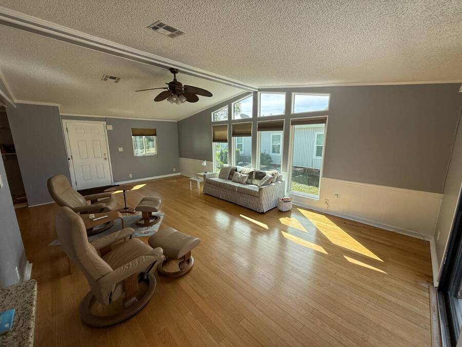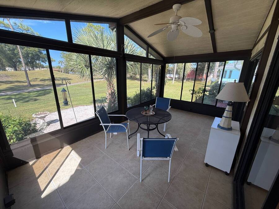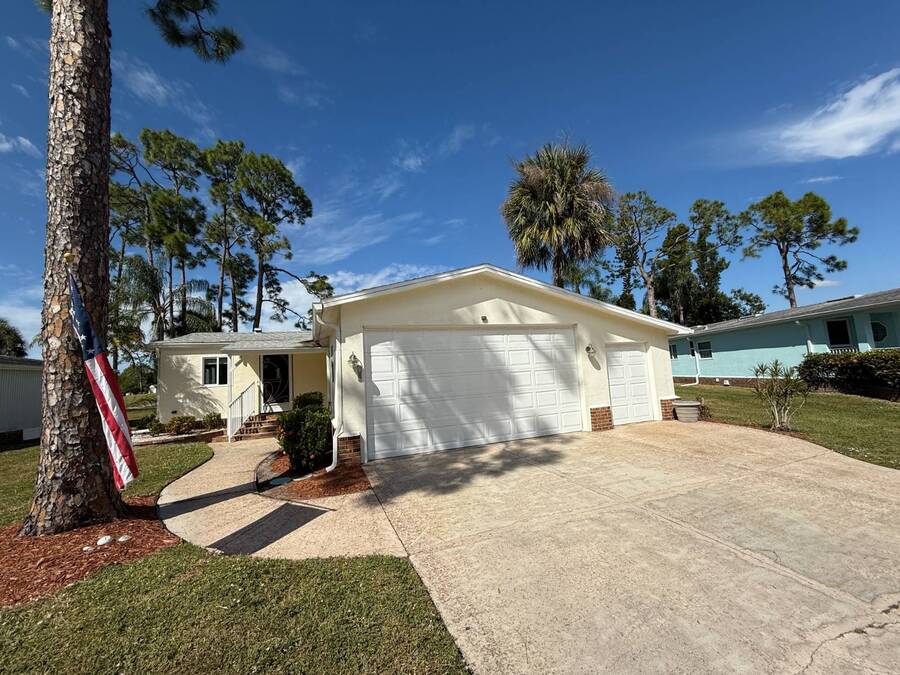 This well cared for Palm Harbor stucco home is located at the green of the 8th hole on the South Golf Course. This home is located on a quiet street just steps from one of the five pools in the community. This home faces the golf course from the primary living area, kitchen, primary bedroom, and the lanai. This home is being sold partially furnished. As you arrive at the home, you will see the 2-car garage and golf cart garage, large driveway, covered entryway, tasteful landscaping, and gutters around the home. When you enter the home you will be in the primary living area which has hardwood floors, lots of windows providing natural lighting, and sliding glass doors with views of the patio and golf course. The primary living area has sleeper sofa and ceiling fan. The kitchen has granite countertops, island with glass cooktop and breakfast bar. There are stainless appliances, lots of cabinets, drawers, and surface space. The dining room is a large room with a pendant light, with wet bar. There are 2 sliding glass doors out to the lanai. The guest bathroom is a Jack & Jill design with a single sink vanity with walk-in shower, and tile floors. The laundry is in the home in the hallway to the garage with cabinets and a storage closet. The guest bedroom is a large room with a wall-length closet and a ceiling fan. The primary bedroom is a large room with a walk-in closet. The primary bathroom has tile floors, double sink vanity with marble countertops, tile walk-in shower with glass door and tile seat in the shower room. The lanai has a tile floor, sliding glass windows with screens and ceiling fan. The concrete patio is a great space for relaxing and enjoying the golf course views. The garage has a hurricane door. This home comes with a golf cart (needs batteries). UPDATES: Roof (2023), A/C (2016), Windows (2016) Only a few minutes to one of the five pools & hot tubs, clubhouse and fitness center as well as tennis courts, pickleball courts and golf course. This community has a full social calendar and activity schedule. Plenty to keep you busy! This is a 55+ (very active) community.