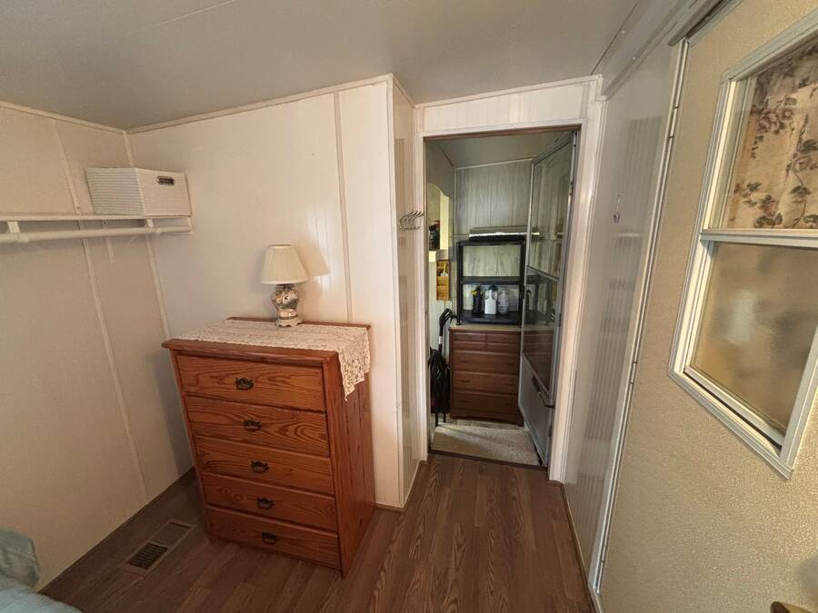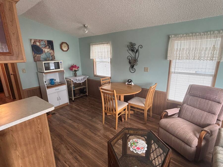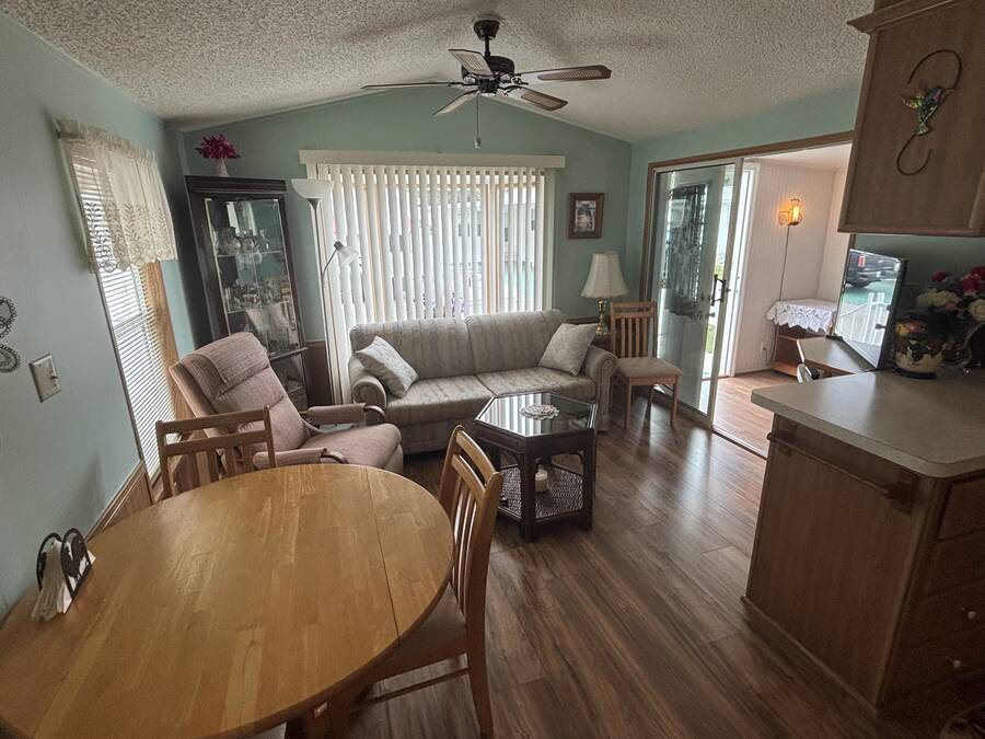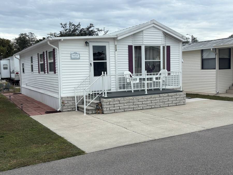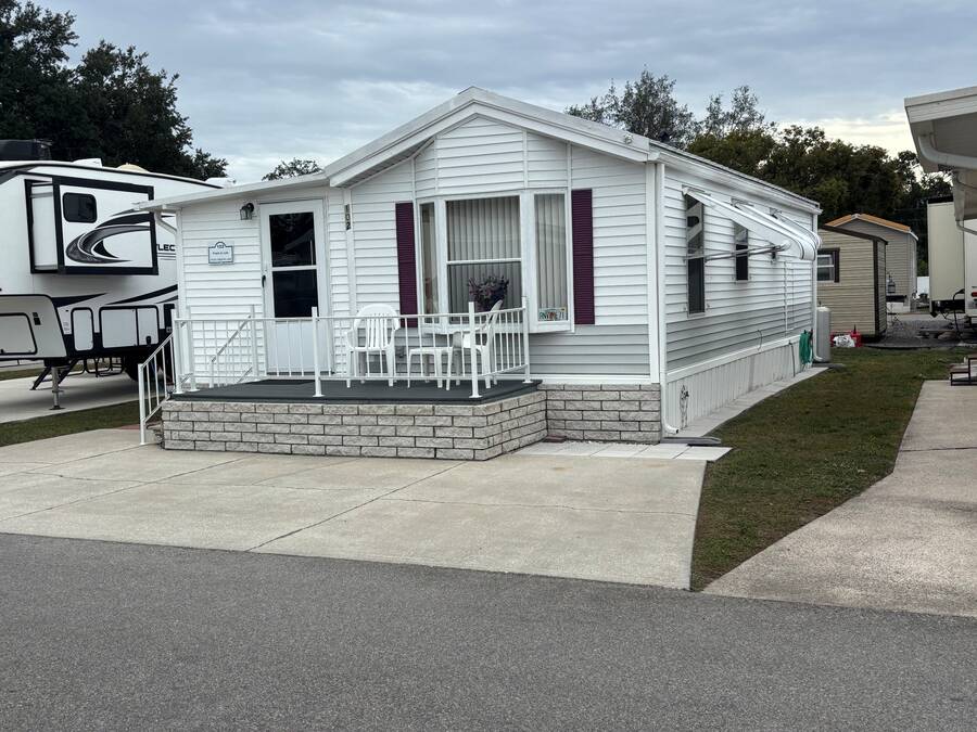 *** Price Reduced $5,00.00*** Owner very motivated to sell! This quaint 444 square foot home has 2 BR/1 Bath and is charming, bright and super clean! An additional 164 square feet in the addition brings the total square foot to 608. The home has a large open floor plan with newer laminate flooring throughout, no carpet. The very large kitchen has tons of cabinets and a new countertop and comes with all appliances. All dishes and pots & pans are included as well as kettle, slow cooker and other small appliances. The living room sofa is a pull-out bed with a double mattress. The bathroom has a shower/tub combo with lots of storage under the counter. The primary bedroom features a wall of cabinets for tons of storage. The second bedroom is bright and sunny with easy access to the laundry room and a washer and dryer. A new 32" TV is also included. There is an uncovered deck in the front, perfect for greeting your neighbors and friends. The home has a large laundry/storage shed that is insulated and paneled with lots of tools that stay with the home. Also included are a pressure washer, garden hoses, weed eater, and a 6ft step ladder. There is also parking for 2 vehicles. The 5' X 12' composite deck was added in 2020. The A/C unit with heat pump was new to the home in Dec. 2023. There have been no issues with the metal roof. The home has been pressure washed, including the roof, siding, patio stones and the cement slab in the front of the home. Just a quick walk to the clubhouse, pool, laundry room and mailboxes. Also included in the sale is a 3 wheel bike, perfect for cruising around the park. The home is located in Rainbow Village Zephyrhills RV Resort, the premier active 55+ RV Resort in Zephyrhills Florida. Situated in a quiet country setting but minutes away from shopping, dining , and the hospital. Zephyrhills is one of the most popular destinations for retirees in America. Blessed with a warm climate and an unlimited number of recreational choices, this quaint community attracts many seniors to this beautiful area. So if your retirement dream are golfing, fishing, sunny days by the pool, or just going for a walk, at Rainbow Village you can live your best retirement. Centrally located close to hospital, shopping dining yet set in a picturesque country setting. Sun Homes is an equal housing provider. Home buyer must pass credit and background check. Monthly site rent fees apply. Call 813/782/5075 today to schedule an appointment.