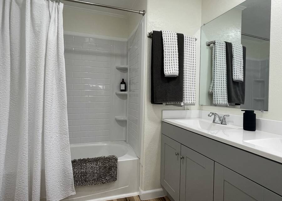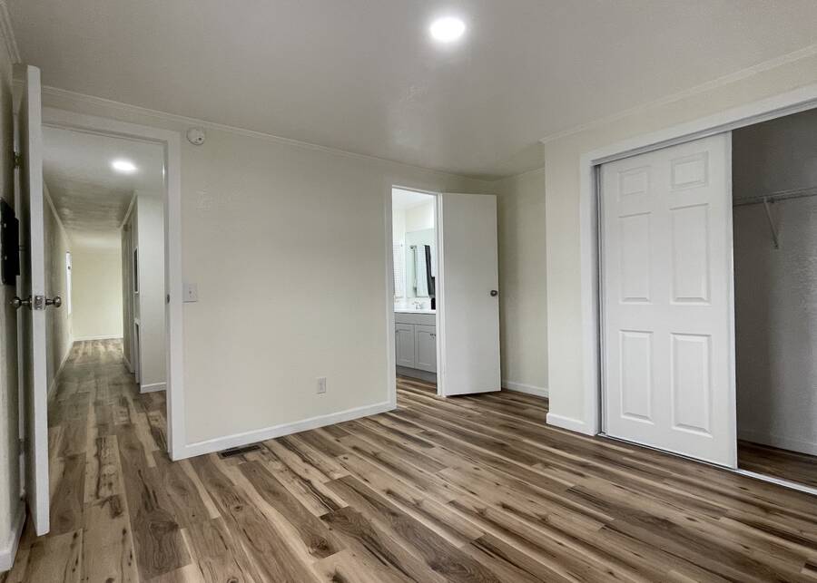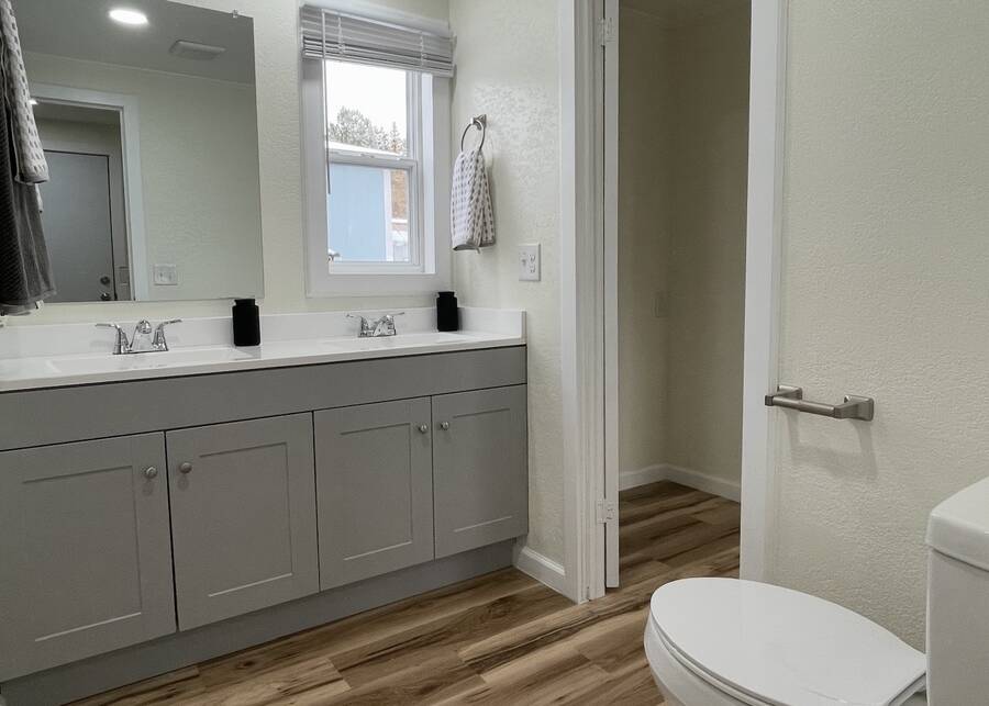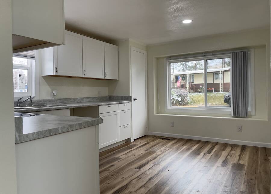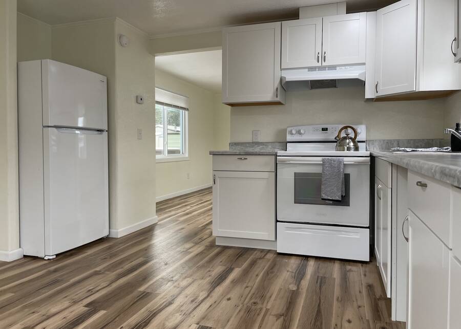 Welcome to this charming 840 square feet manufactured home featuring two bedrooms and one bathroom with an open layout that maximizes every inch of living space. This recently renovated home showcases a stunning, fully updated kitchen complete with abundant storage, upgraded cabinets and sinks, plus brand-new appliances, while beautiful brand-new laminate flooring throughout creates a cohesive, modern aesthetic that's both stylish and practical.