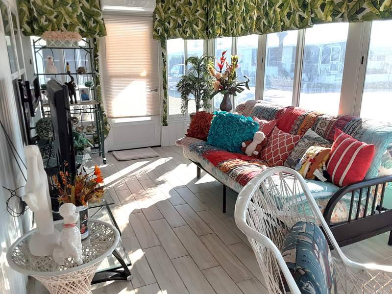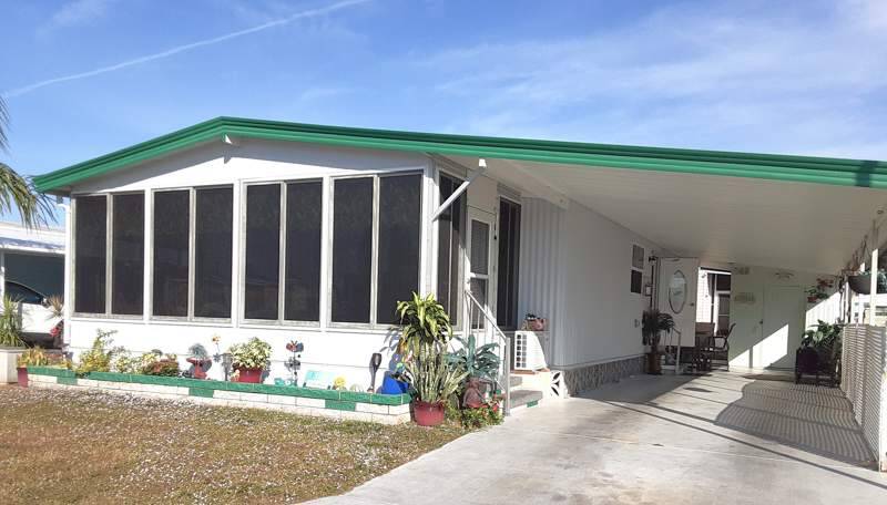 This 1056 square foot manufactured home in Terra Palms must be seen to appreciate all of the beautiful upgrades and atmosphere inside. The home features a cozy but spacious living room, dining room, master bedroom with an en suite bathroom and walk-in closet, open plan kitchen with a breakfast bark, and a lovely Florida room that is fully enclosed and screened in. The exterior of the home includes a carport, shed, and an enclosed porch, perfect for relaxing or entertaining. The flooring is tiled. Inside, you'll find a range of appliances such as an oven, fridge, dishwasher, microwave, washer, dryer, and hot water heater, along with central A/C to keep you comfortable year-round. The countertops and cabinets are fully upgraded and there is also a built in bar. Wait - a golf cart is included for your enjoyment. Most of the furnishings are included for a quick move in experience. They are very well maintained and show little wear and tear. Driveway to be freshly painted shortly as a part of the sale.