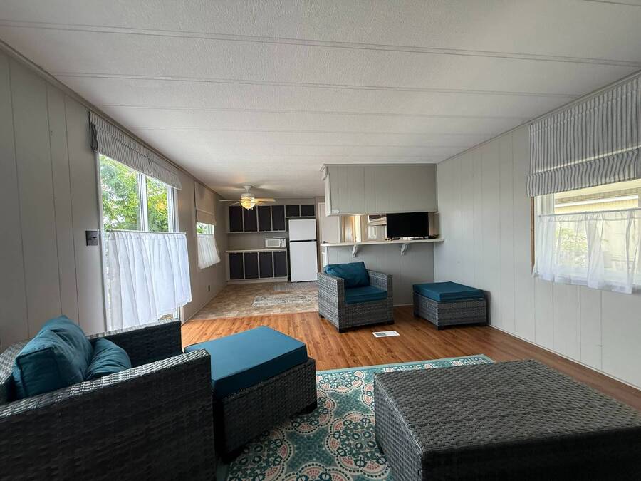 Discover relaxed Florida living at 17 Larkspur Avenue in the welcoming Coach House Mobile Home Park. This charming home offers a blend of comfort, updates, and natural beauty, including a golf cart that comes with the home. From the moment you arrive, you'll notice the spacious carport and the lush Florida foliage that surrounds the property. The owners have a true green thumb, and the banana trees are not only thriving, but they're producing fruit. With Florida's natural climate, the landscaping stays beautiful with very little effort. Step inside through the newly added steps and sturdy railings, and you'll find a well-maintained home with thoughtful updates throughout. The home features newer windows installed about three years ago, with only one original window remaining in the front. The oversized shed is a major bonus, offering ample storage along with a washer and dryer that stay with the home. Inside, the guest room comfortably fits a queen-size bed and includes two closets, fresh paint, new window valances, and full-coverage window shades. A convenient hall closet provides additional storage. The master bathroom offers a walk-in shower with tile flooring, a newer window, great storage options, and a clean, updated feel. The kitchen is bright and functional with plenty of cabinet space, freshly painted cupboards, and a refrigerator that was replaced just a few months ago. Vinyl flooring flows through the kitchen, while the living room features laminate wood flooring and comes fully furnished. The window shades here also lower completely for full privacy. The second guest room has received substantial updates, including new subflooring and laminate flooring. This room also has a queen-size bed and benefits from an added half bath with a toilet and sink, perfect for visiting guests. The home has been well cared for over the years with annual tenting, yearly maintenance on its membrane roof, and important subfloor updates in both the front and back bedrooms. Sliding glass doors open to a private patio area, giving you the option to expand with a sunroom, lanai, or additional living space, already prepped and ready for your vision. If you'd like to tour this inviting home at 17 Larkspur Avenue in Palmetto, Florida, give me a call. It's move-in ready, wonderfully maintained, and waiting for its next owner to enjoy all it has to offer. Coach House is an age-qualified resort community of manufactured/mobile homes. The Coach House has 2 recreation halls- one attached to the pool area. A very nice relaxing pool overlooking the lake. 4 stocked lakes, an exercise room, laundromat, workshop for the residents, shuffleboard, pickle ball court, corn hole, two tiki bars, dog park, and lots of clubs and activities. The park has a very warm community feel. The lot rent is based on the home's location. Not only does the monthly lot rent cover all the amenities of the community listed above, it also covers almost all other monthly expenses such as; trash pickup, all property taxes, lawn maintenance and spectrum bulk package. All listing information given to us is considered appropriate and reliable but always recommend home inspections by independent companies who have a background and thorough understanding of manufactured homes. We cannot guarantee the accuracy of information given to us or the condition of the home. Lot rents are determined by the community office not our company.