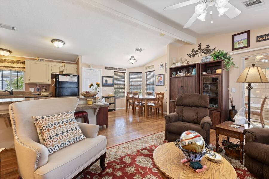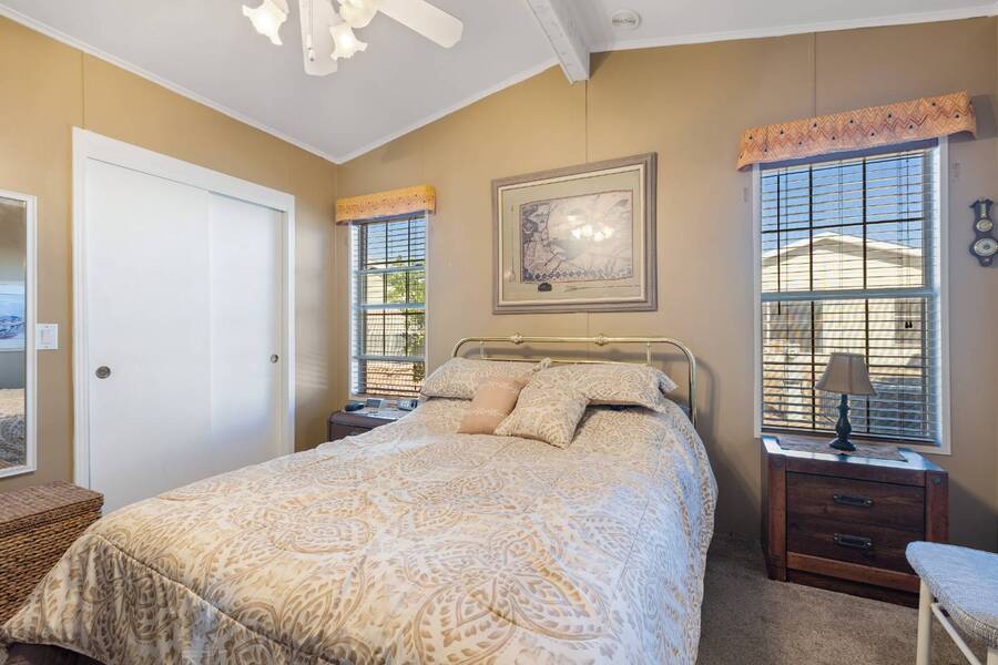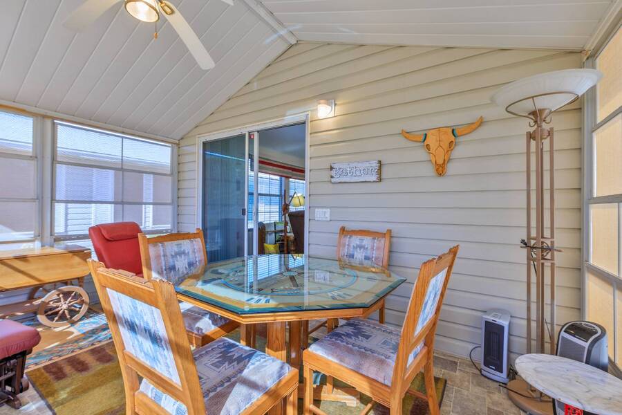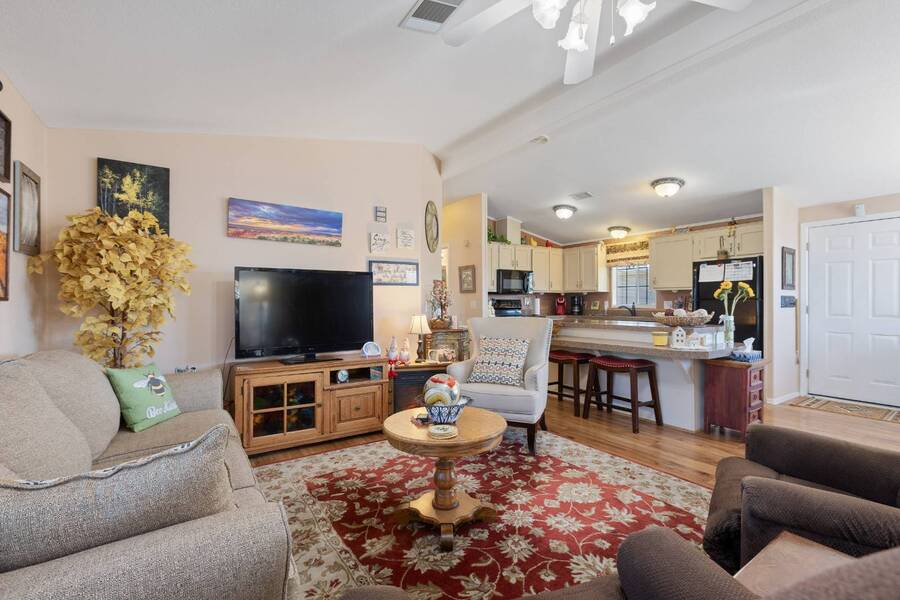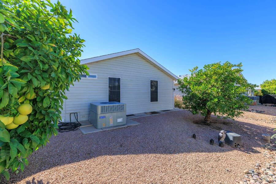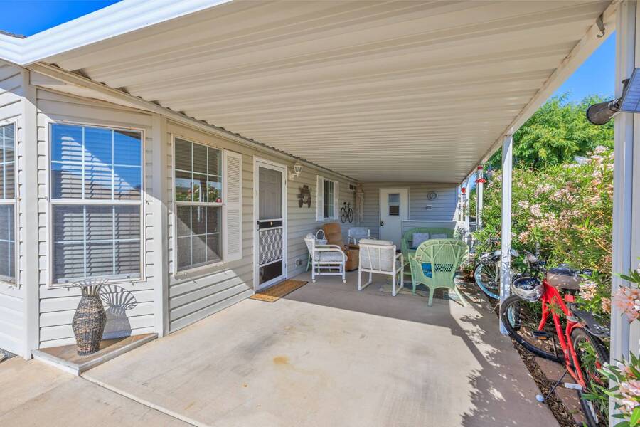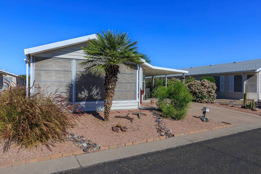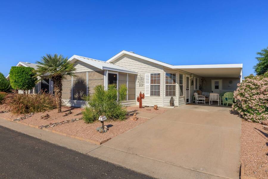 Beautiful 2BD/2BA home ideally located near the clubhouse, featuring an open-concept floorplan and a stylish kitchen with island/bar and granite countertops. Enjoy the natural light from sunny bay windows in the dining area and the contemporary tape-and-textured common spaces. The home offers new plumbing, black appliances, carpet in the primary bedroom, and vinyl/laminate flooring elsewhere. Sunscreen shades for all windows, an extra-large Arizona room & shed, and two fruit trees (orange and grapefruit) complete this charming property..... Fully furnished... Black kitchen appliances - 2019... New plumbing... Granite countertops.... Extra large AZ room & extra large shed......................................................... Experience the Thesman Lifestyle, an active 55 plus land lease community where luxury meets affordability. For over 40 years we have set the standard with world class amenities and year-round activities. We provide a 24-hour gated community, with a beautiful 20,000 square foot clubhouse including ballroom, fireside lounge, library with computers and individual rooms for cards, billiards, arts & crafts and fitness center. Enjoy outdoor amenities heated pool & spa, BBQ area, pet park, sport courts for pickleball, tennis, bocce, shuffleboard and basketball. Our activities director assures a full calendar of social and recreation events. Our shuttle bus makes it easy and convenient to attend sporting and special events, plus local shopping. Whether you want to relax or stay active our vibrant communities offer everything you need to enjoy life to the fullest. Discover and start living the Thesman Lifestyle today!