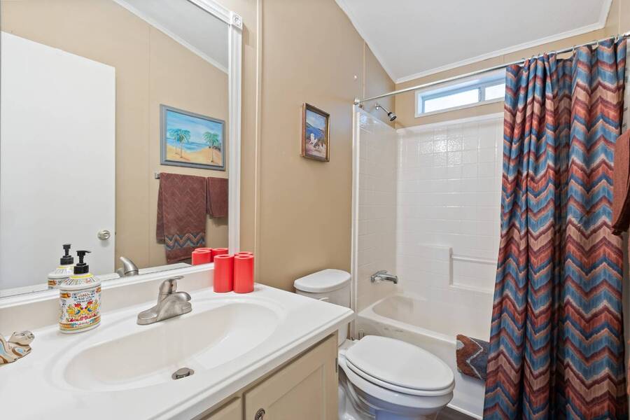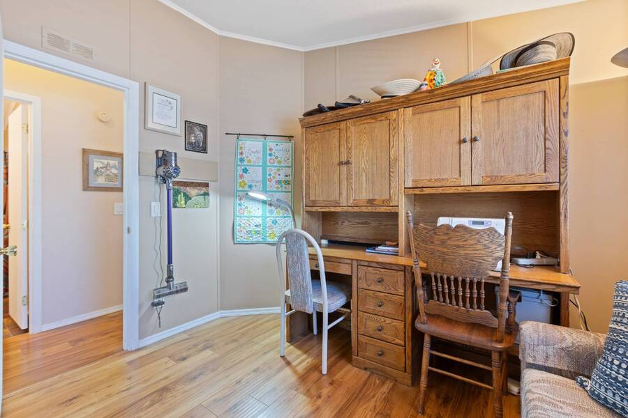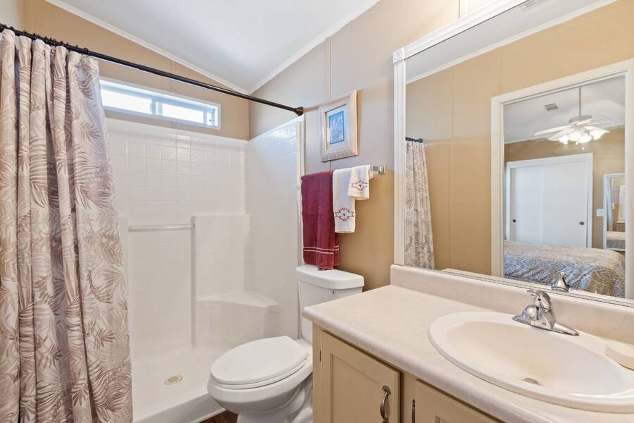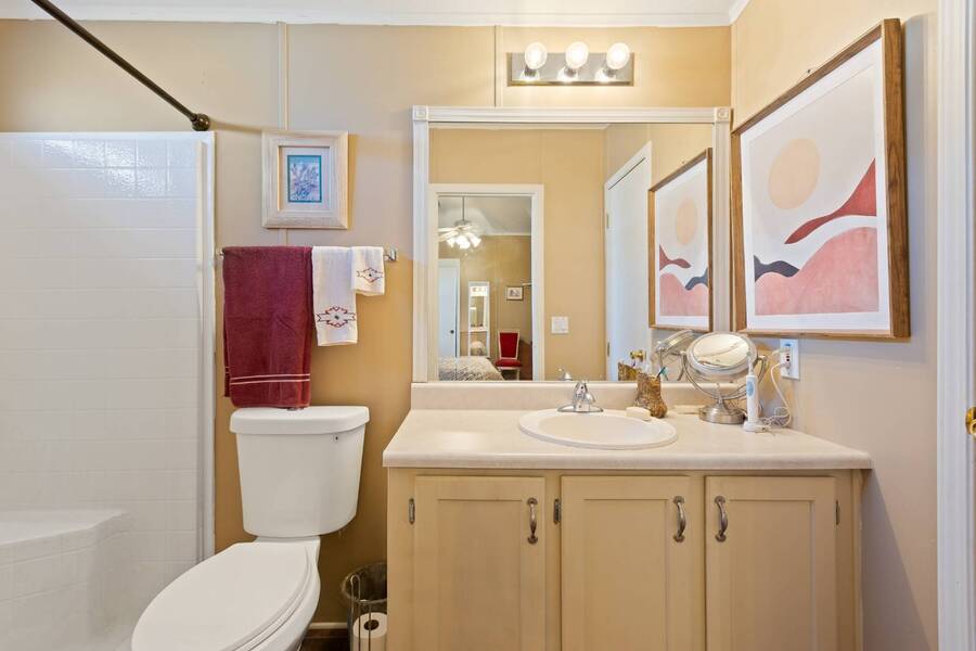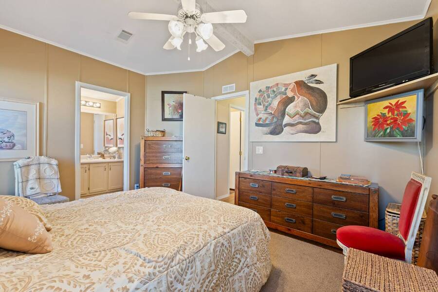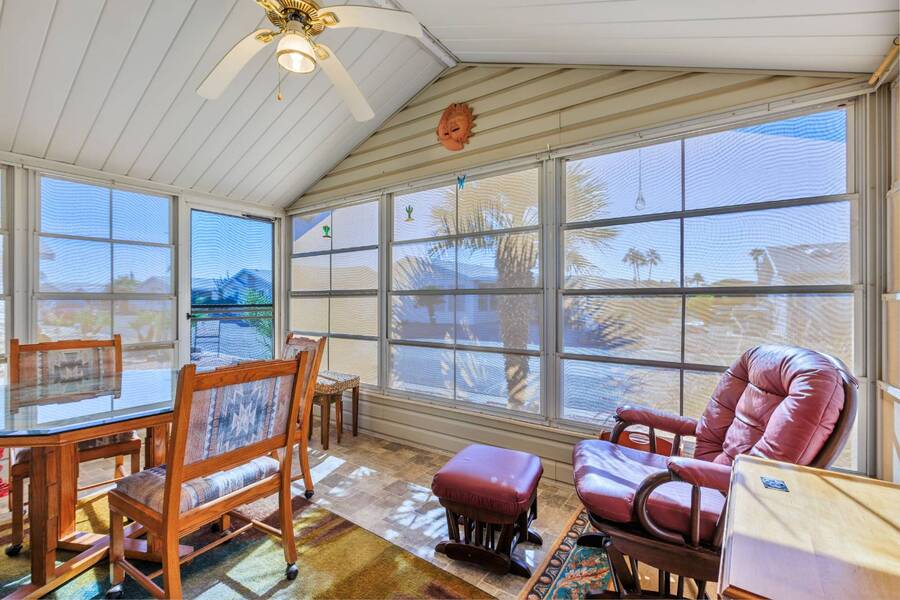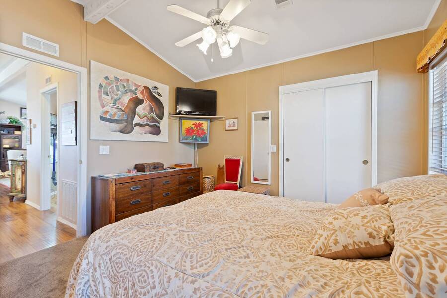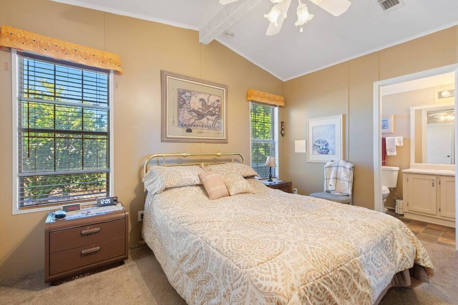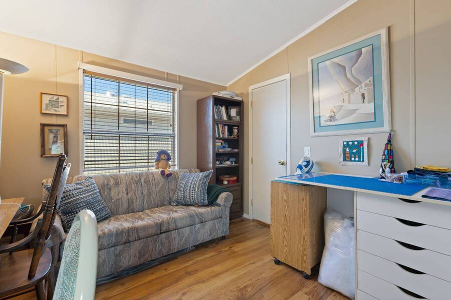 Beautiful 2BD/2BA home ideally located near the clubhouse, featuring an open-concept floorplan and a stylish kitchen with island/bar and granite countertops. Enjoy the natural light from sunny bay windows in the dining area and the contemporary tape-and-textured common spaces. The home offers new plumbing, black appliances, carpet in the primary bedroom, and vinyl/laminate flooring elsewhere. Sunscreen shades for all windows, an extra-large Arizona room & shed, and two fruit trees (orange and grapefruit) complete this charming property..... Fully furnished... Black kitchen appliances - 2019... New plumbing... Granite countertops.... Extra large AZ room & extra large shed......................................................... Experience the Thesman Lifestyle, an active 55 plus land lease community where luxury meets affordability. For over 40 years we have set the standard with world class amenities and year-round activities. We provide a 24-hour gated community, with a beautiful 20,000 square foot clubhouse including ballroom, fireside lounge, library with computers and individual rooms for cards, billiards, arts & crafts and fitness center. Enjoy outdoor amenities heated pool & spa, BBQ area, pet park, sport courts for pickleball, tennis, bocce, shuffleboard and basketball. Our activities director assures a full calendar of social and recreation events. Our shuttle bus makes it easy and convenient to attend sporting and special events, plus local shopping. Whether you want to relax or stay active our vibrant communities offer everything you need to enjoy life to the fullest. Discover and start living the Thesman Lifestyle today!