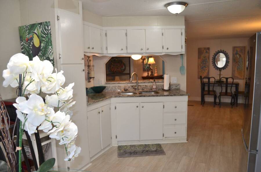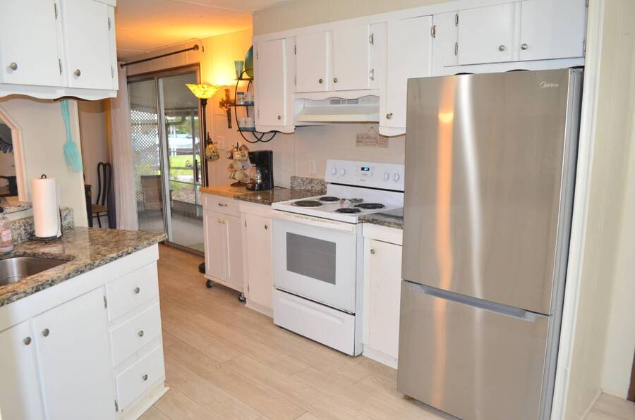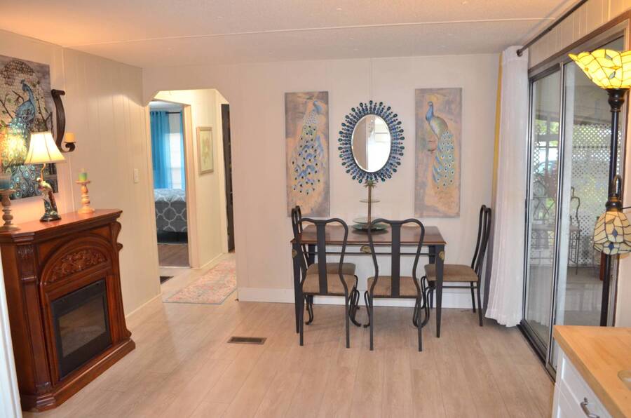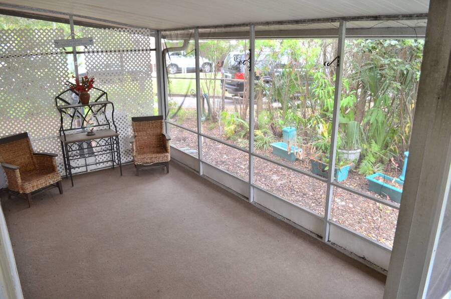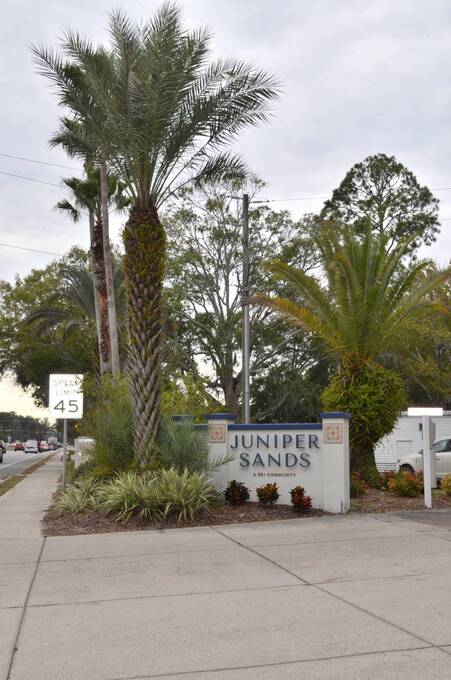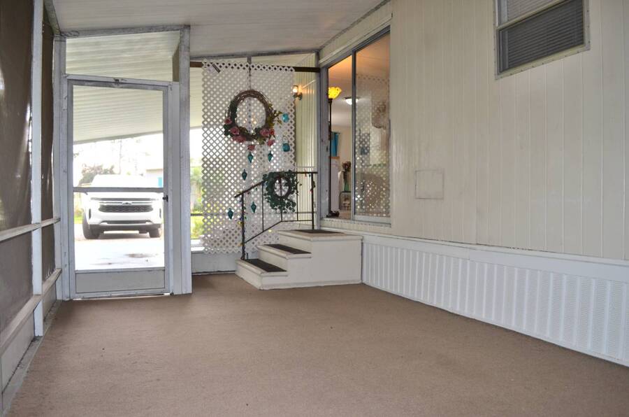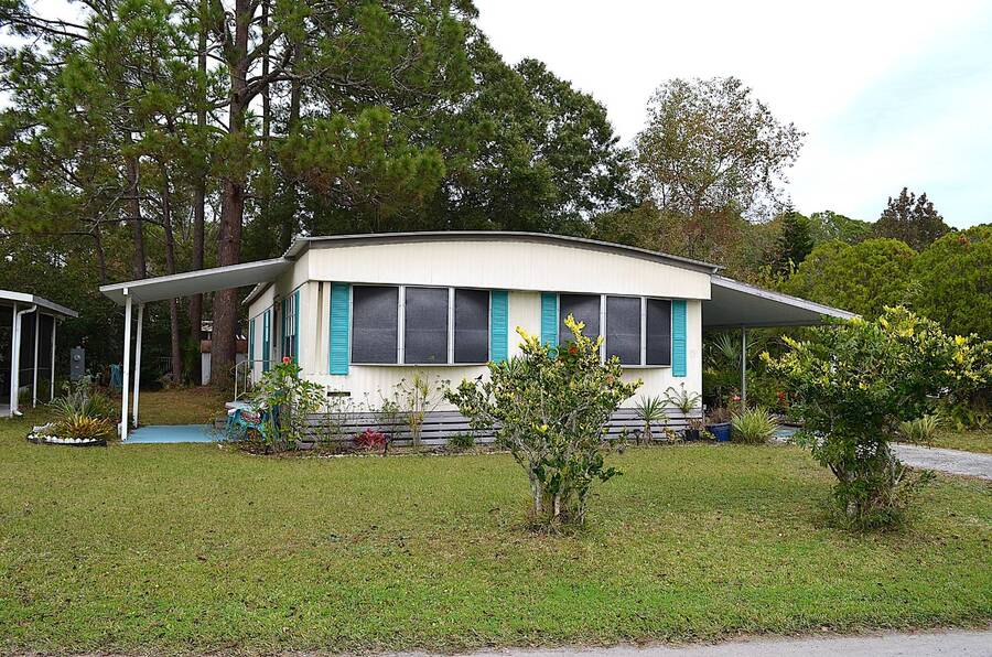 Light, bright, and full of coastal charm! This 3-bedroom, 1-bath double-wide offers an open living area, breakfast bar, updated flooring, and a cozy kitchen with a stainless-steel fridge. Enjoy a spacious screened patio, covered carport, storage shed, and a peaceful yard with mature trees. Located in Juniper Sands, a quiet 55+ land-lease community where the lot rent includes water, sewer, and trash collection. Minutes to shopping and historic St. Augustine.