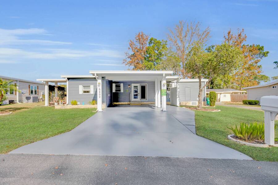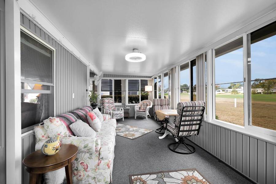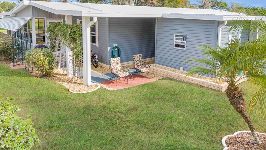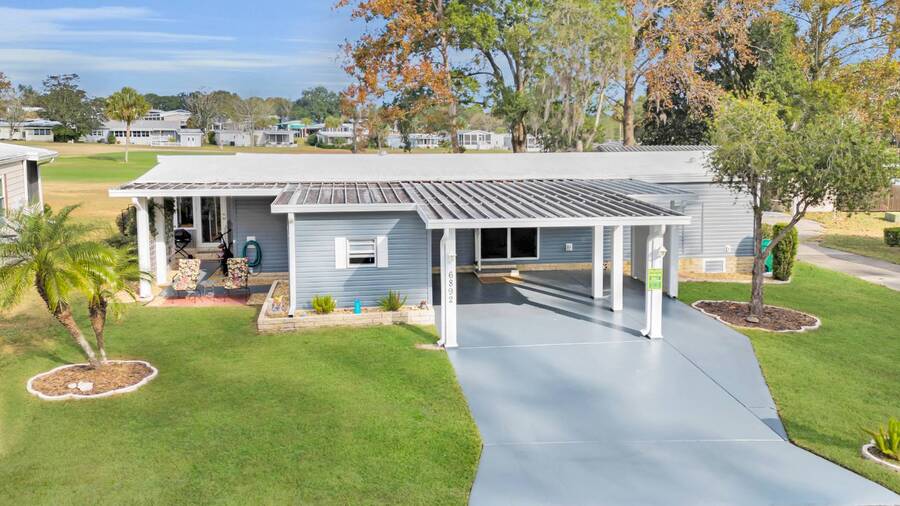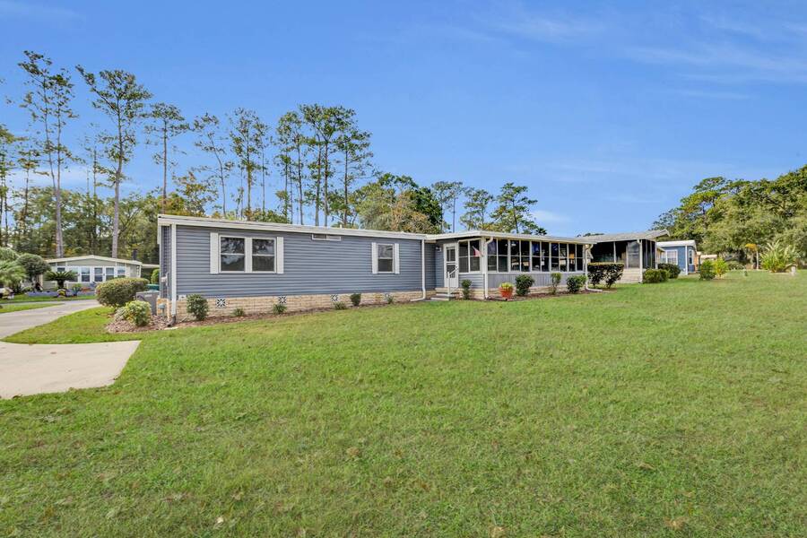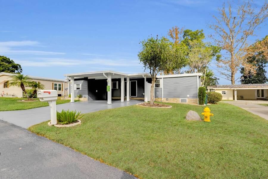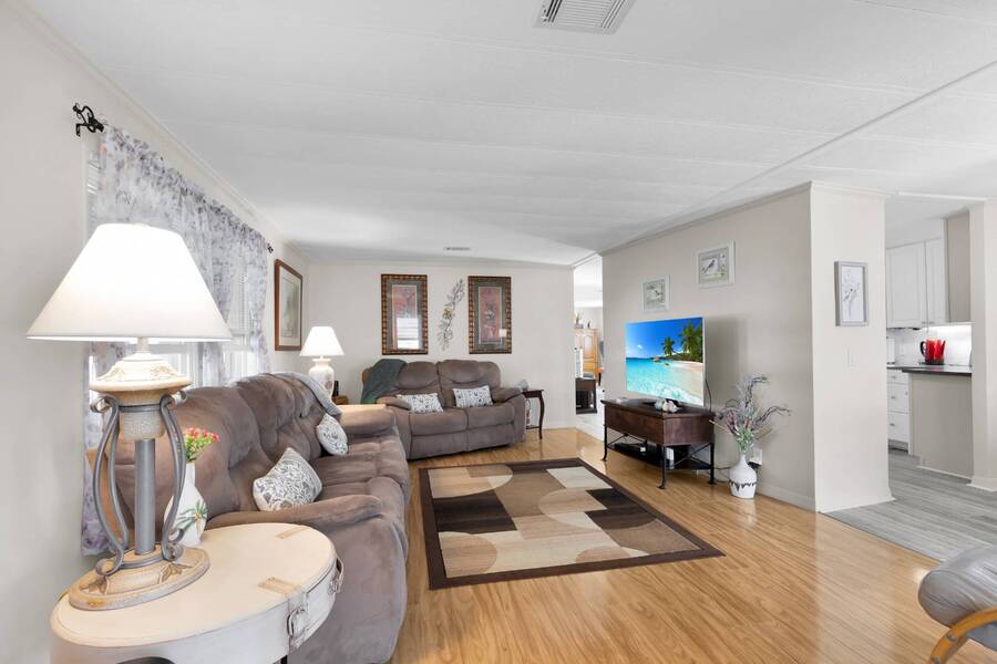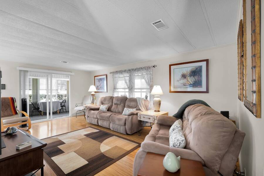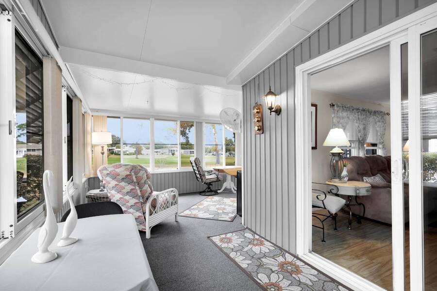 This beautiful 2 bed 2 bath home is in Rolling Green Village, a 55+ Community. The home has new vinyl siding, an expanded carport with golf cart parking, a covered patio, and an enclosed lanai with heat and air conditioning. From the carport, enter through new French doors into the family room. An updated kitchen with breakfast bar leads into the quaint dining room and large living room, offering views of the golf course. The primary and guest bedrooms are tucked away for the perfect amount of privacy. From the primary bedroom, you can wake to gorgeous views of the golf course. The enclosed lanai has newer sliding glass windows for a true four season room and wraps partially around the home for expansive views of the golf course. The home also boasts new vinyl flooring, newer rubber roof (2019) and new dishwasher. To make life even easier, this move in ready home comes completely furnished. The community of Rolling Greens Village has three recreation centers, three pools, a wood working shop, yoga/pilates studio, fitness center, cards room, billiards, pickleball courts, tennis courts, and 18 hole golf coarse. The lot rent includes sewer, water, bi-weekly trash and lawn mowing. Give me a call to schedule your private showing today.