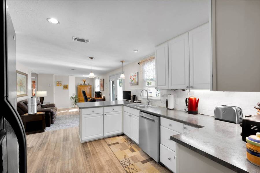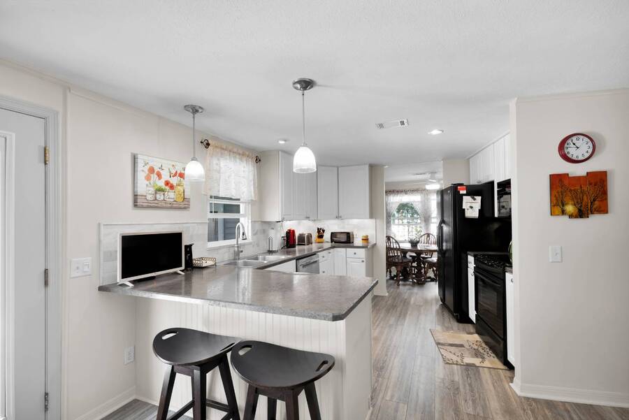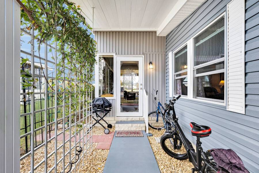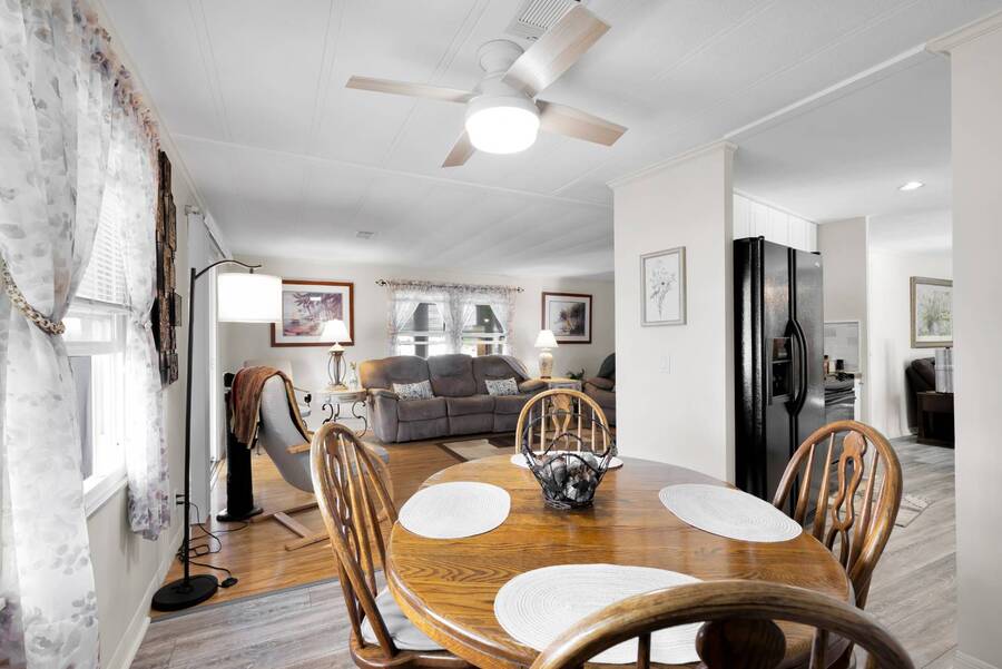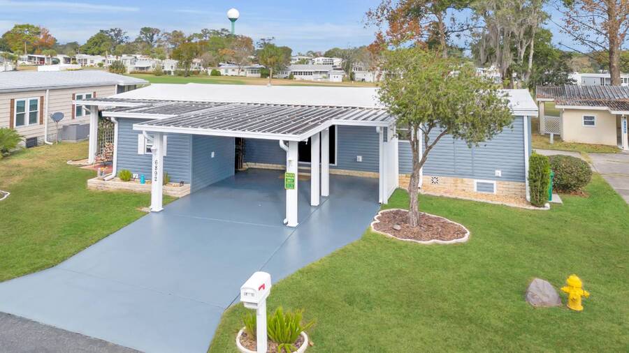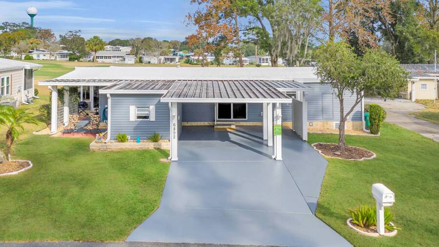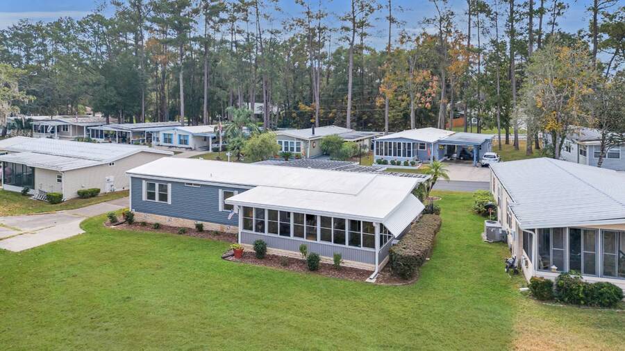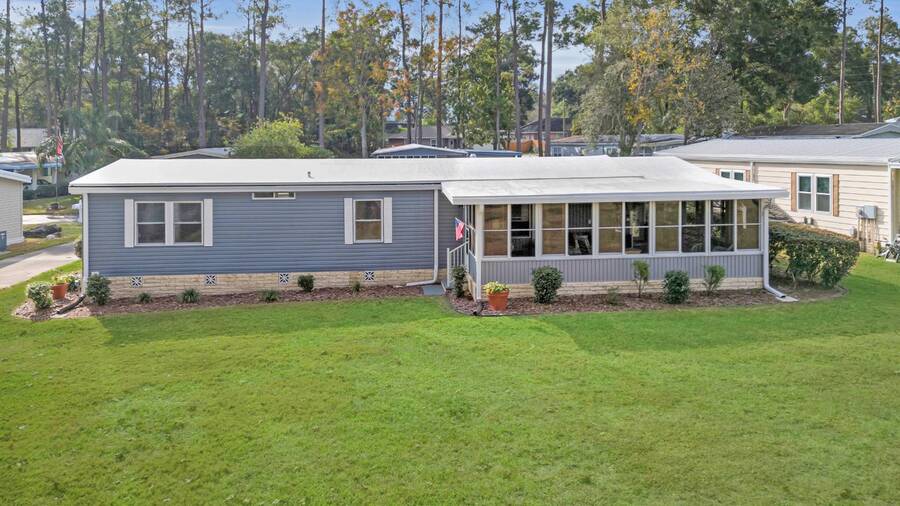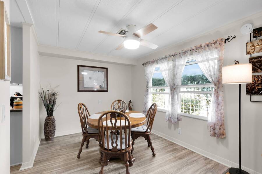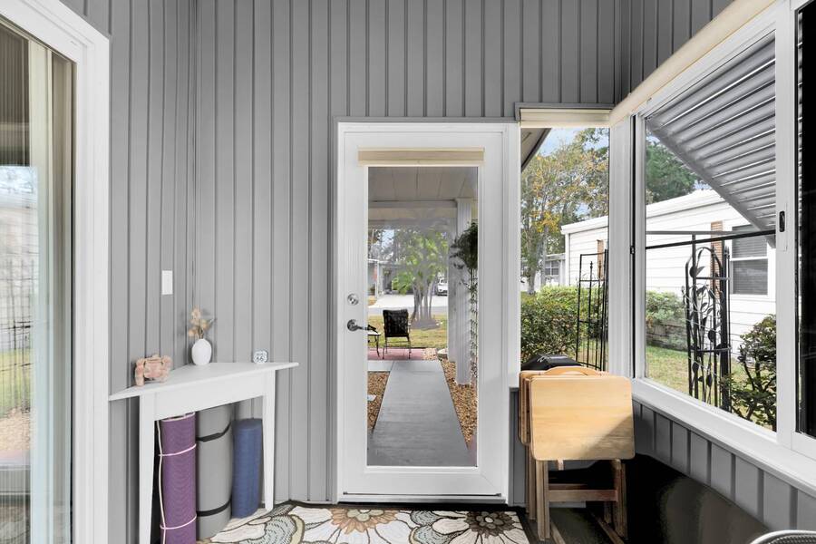 This beautiful 2 bed 2 bath home is in Rolling Green Village, a 55+ Community. The home has new vinyl siding, an expanded carport with golf cart parking, a covered patio, and an enclosed lanai with heat and air conditioning. From the carport, enter through new French doors into the family room. An updated kitchen with breakfast bar leads into the quaint dining room and large living room, offering views of the golf course. The primary and guest bedrooms are tucked away for the perfect amount of privacy. From the primary bedroom, you can wake to gorgeous views of the golf course. The enclosed lanai has newer sliding glass windows for a true four season room and wraps partially around the home for expansive views of the golf course. The home also boasts new vinyl flooring, newer rubber roof (2019) and new dishwasher. To make life even easier, this move in ready home comes completely furnished. The community of Rolling Greens Village has three recreation centers, three pools, a wood working shop, yoga/pilates studio, fitness center, cards room, billiards, pickleball courts, tennis courts, and 18 hole golf coarse. The lot rent includes sewer, water, bi-weekly trash and lawn mowing. Give me a call to schedule your private showing today.