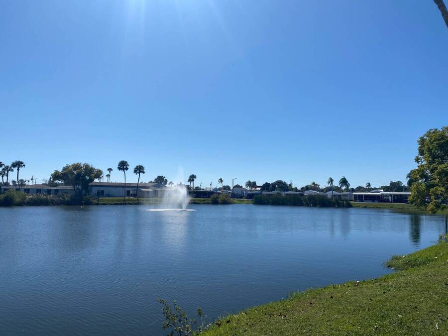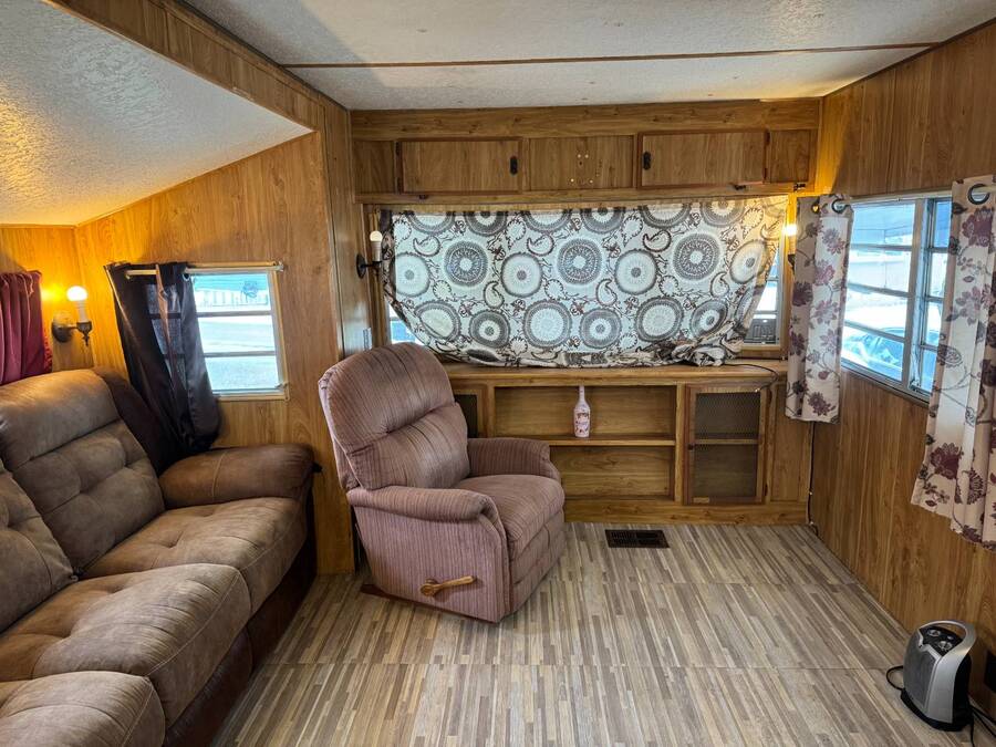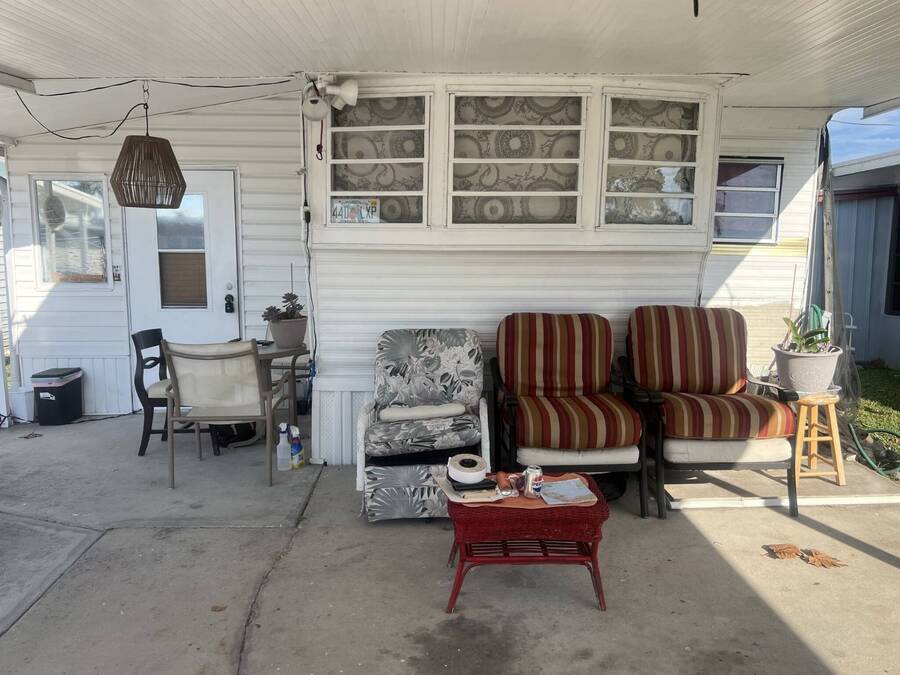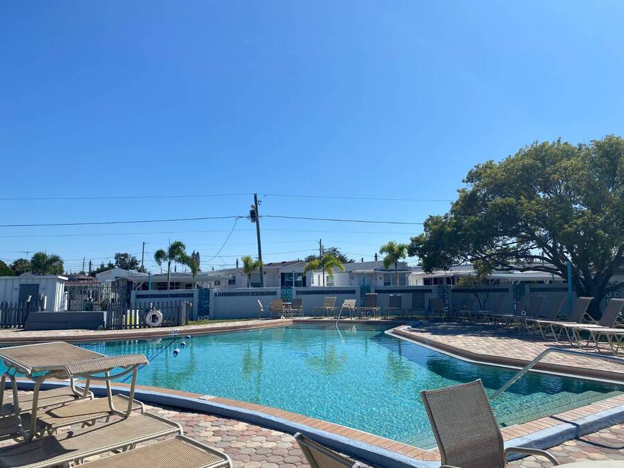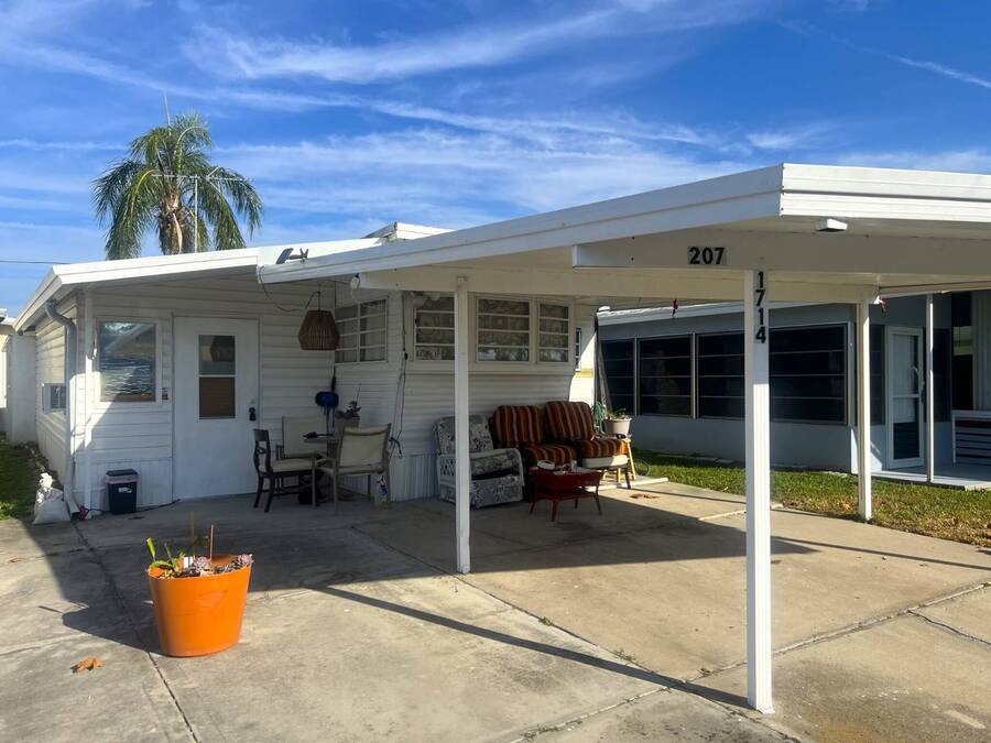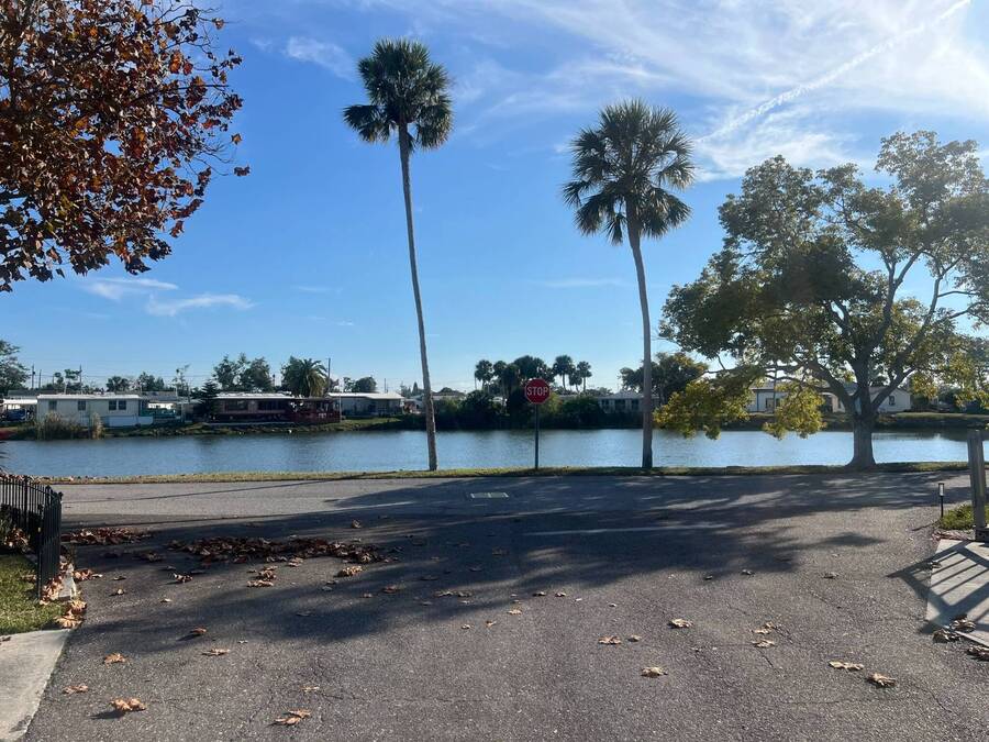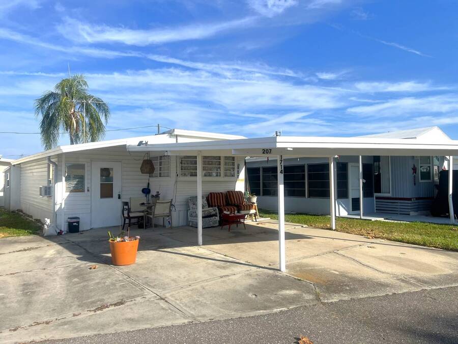 This 2 Bedroom, 1 Bath PARTIALLY FURNISHED Turn-key Home is in Holiday Travel Park, an All-Ages Community with LOW $693 Lot Rent. The Home has 700 Sq Ft with a Double Carport, plus a Separate Spot for a Third Car, a Metal Roof-over, a Patio under the Carport and a Spacious Add-on. The Add-on is 10'x28' with Cement Floors, an Electric Fireplace, Newer blinds and a Window Ac Unit. The Space could be used as a Guest Bedroom or Family Room. To the back is an Attached Storage Shed with Plenty of Storage Space with a Newer Washer and Dryer, New in 2022. The Main Section of the Home has Updated Vinyl Wood-look Floors and Lots of Windows. The Living Area Opens up Nicely to the Kitchen. The Kitchen has an Electric Stove, a Side-by-Side Refrigerator and Plenty of Pantry and Storage Space. The Pass-thru Bathroom leads to the Primary Bedroom. The Bathroom has a Low Style Bathtub and Vinyl Tile Look Floors. The Guest Bedroom has Plenty of Closet Space and is ideal for Visiting Family and Friends. Located to the side of the Home is a Second Attached Storage Shed. The Home is only a Short Walk to the Heated Pool and Social Clubhouse. Start Living the Florida Lifestyle and enjoying the Gulf Breeze in this Lakeview Turnkey Home in Holiday Florida. Travel Park is a Family/All Ages Park in Holiday, FL. Park Amenities include Heated Pool, Gym, Shuffleboard, Fishing Pond and Clubhouse. LOW LOT RENT of $693 includes water, sewer, lawn and Park Amenities. A Charge of $6.66 will Cover the Garbage. Pet Friendly - 2 Pets Any Size- Breed Restrictions Apply.