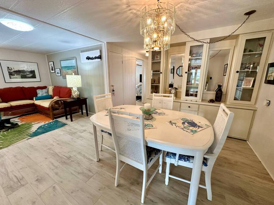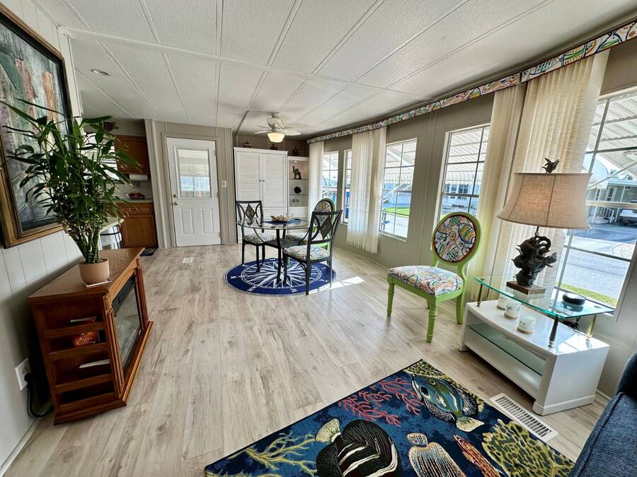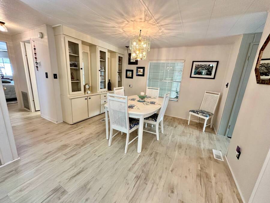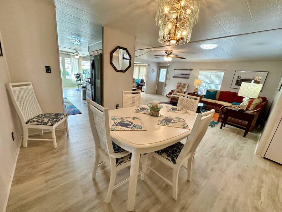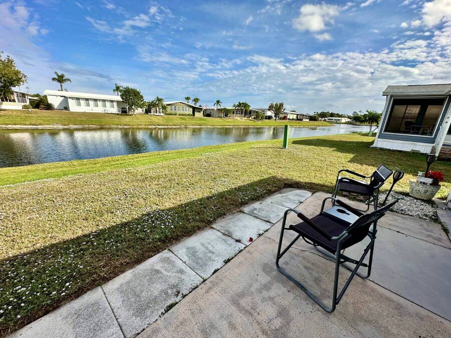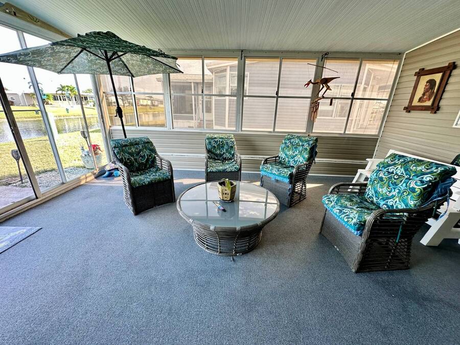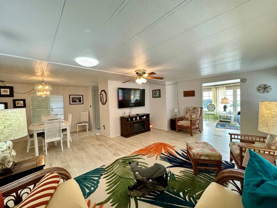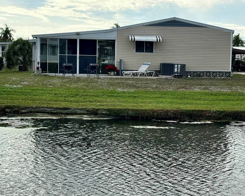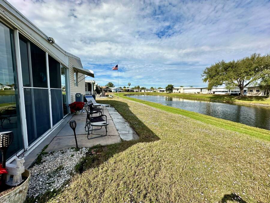 Discover serene lakefront living in this beautifully updated MF home located within a highly desirable 55+ active cooperative community-just 4 miles from Nokomis Beach/North Jetty, where dolphin sightings and stunning Gulf sunsets await. This inviting residence offers a double-wide driveway and double garage equipped with screened doors and motion lighting for added comfort and functionality. Inside, the remodeled warm-wood galley kitchen features Corian countertops, a pantry, and a built-in desk. The charming breakfast nook includes a built-in cabinet, and a coastal-inspired coffee bar seating-perfect for slow mornings & casual gatherings. The spacious living room is filled with natural light and features an electric fireplace, creating a cozy space to relax with a good book. The family room with skylight and comfortable seating as you watch a movie on our 200 channel TV and internet services including with your HOA. The formal dining area is enhanced by newer built-in cabinetry and an elegant crystal chandelier, ideal for entertainment. The home is partially furnished for your convenience. Outdoor living shines in the large, screened lanai overlooking the lake, complete with an electric fireplace, new ceiling fan, and double sliding doors leading to a back patio seating area. It's the perfect spot to sip your morning coffee or unwind after an active day. Recent updates in 2024 include freshly painted interior, new plywood subfloors and vinyl plank flooring throughout, new A/C with new ductwork, new power pole, and water heater (2023). Other updates include re-piped (2008), vinyl siding and an aluminum lay-down roof (1998). Laundry is conveniently located in the large shed, offering ample storage space. Enjoy an active, maintenance-friendly lifestyle close to beaches, boating, dining, and community amenities-all while coming home to peaceful lakefront views.