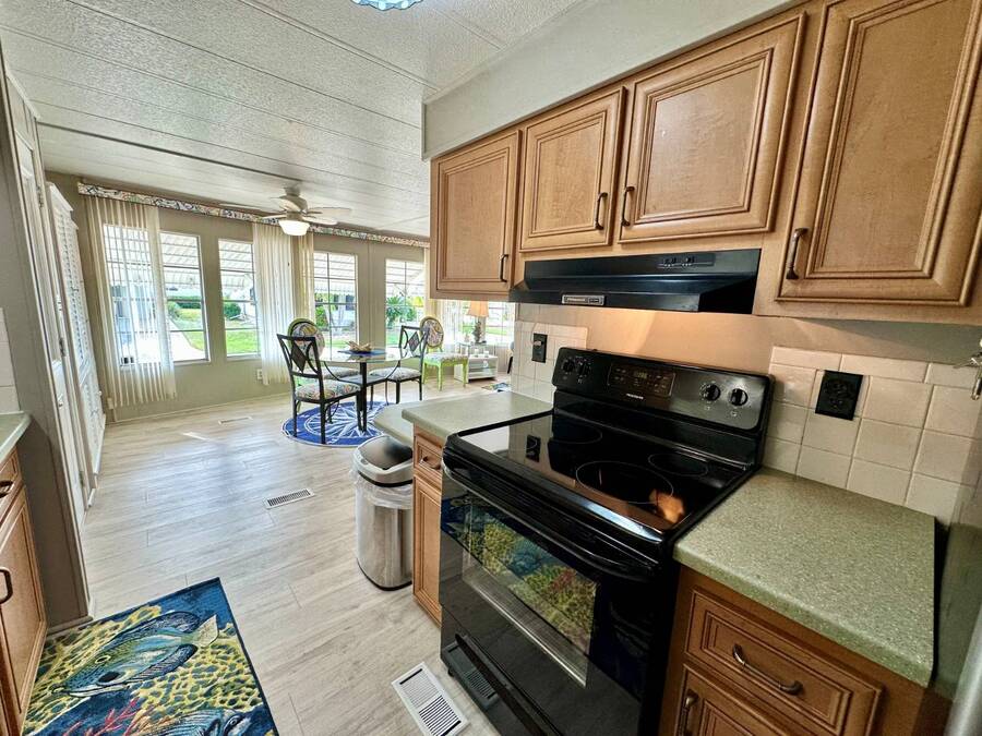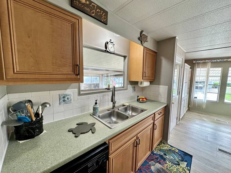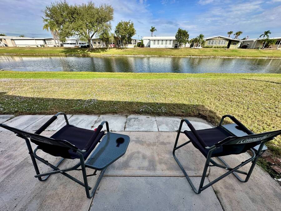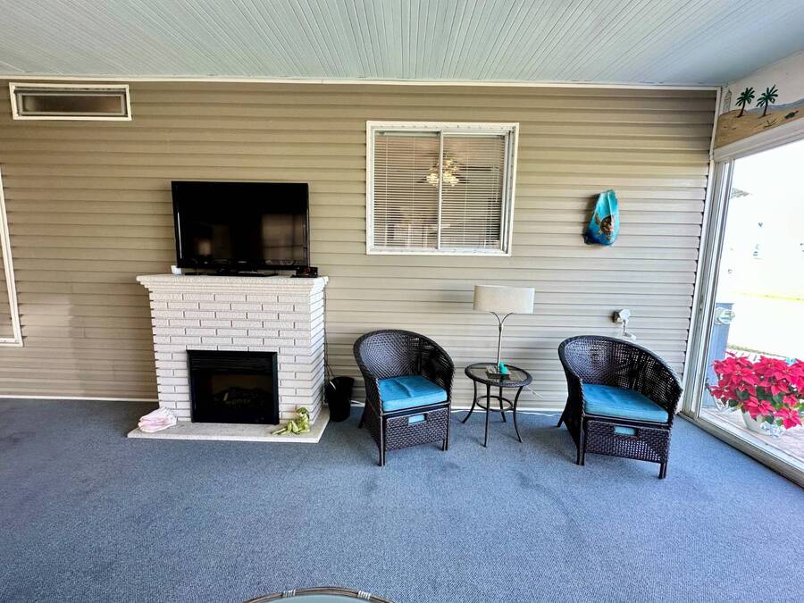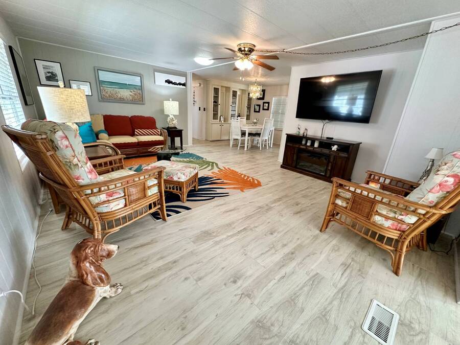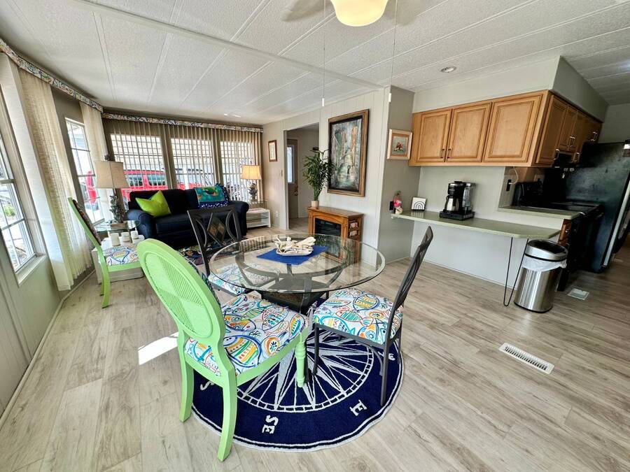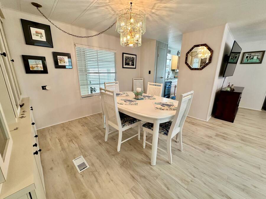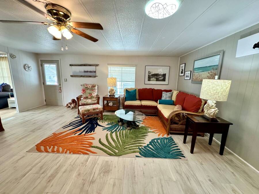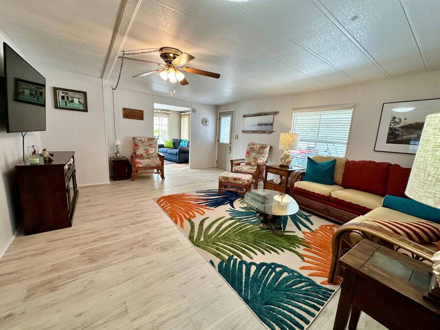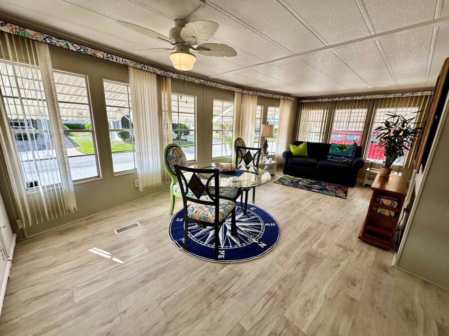 Discover serene lakefront living in this beautifully updated MF home located within a highly desirable 55+ active cooperative community-just 4 miles from Nokomis Beach/North Jetty, where dolphin sightings and stunning Gulf sunsets await. This inviting residence offers a double-wide driveway and double garage equipped with screened doors and motion lighting for added comfort and functionality. Inside, the remodeled warm-wood galley kitchen features Corian countertops, a pantry, and a built-in desk. The charming breakfast nook includes a built-in cabinet, and a coastal-inspired coffee bar seating-perfect for slow mornings & casual gatherings. The spacious living room is filled with natural light and features an electric fireplace, creating a cozy space to relax with a good book. The family room with skylight and comfortable seating as you watch a movie on our 200 channel TV and internet services including with your HOA. The formal dining area is enhanced by newer built-in cabinetry and an elegant crystal chandelier, ideal for entertainment. The home is partially furnished for your convenience. Outdoor living shines in the large, screened lanai overlooking the lake, complete with an electric fireplace, new ceiling fan, and double sliding doors leading to a back patio seating area. It's the perfect spot to sip your morning coffee or unwind after an active day. Recent updates in 2024 include freshly painted interior, new plywood subfloors and vinyl plank flooring throughout, new A/C with new ductwork, new power pole, and water heater (2023). Other updates include re-piped (2008), vinyl siding and an aluminum lay-down roof (1998). Laundry is conveniently located in the large shed, offering ample storage space. Enjoy an active, maintenance-friendly lifestyle close to beaches, boating, dining, and community amenities-all while coming home to peaceful lakefront views.