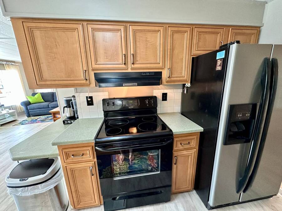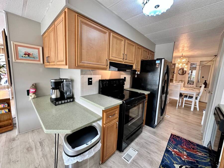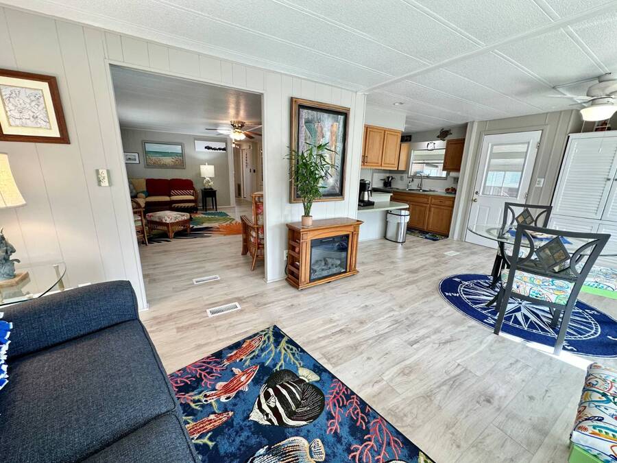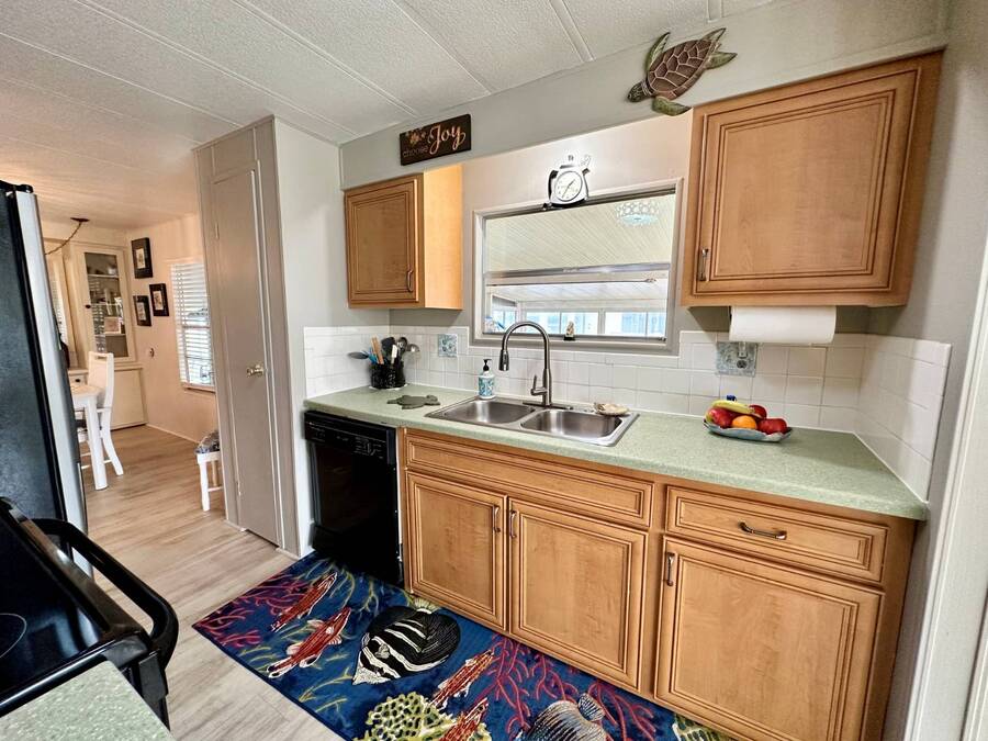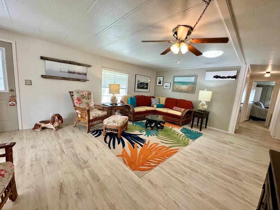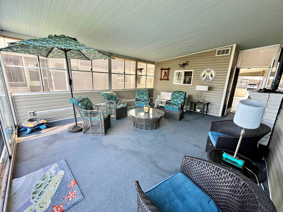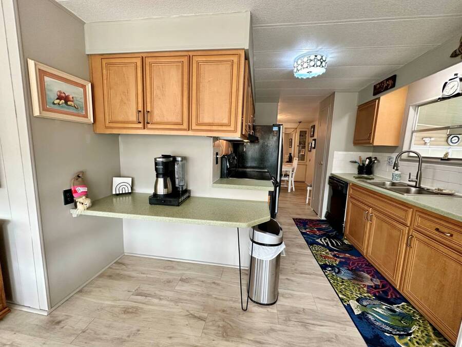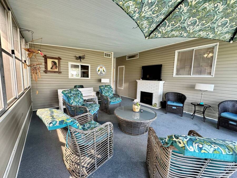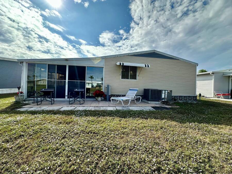 Discover serene lakefront living in this beautifully updated MF home located within a highly desirable 55+ active cooperative community-just 4 miles from Nokomis Beach/North Jetty, where dolphin sightings and stunning Gulf sunsets await. This inviting residence offers a double-wide driveway and double garage equipped with screened doors and motion lighting for added comfort and functionality. Inside, the remodeled warm-wood galley kitchen features Corian countertops, a pantry, and a built-in desk. The charming breakfast nook includes a built-in cabinet, and a coastal-inspired coffee bar seating-perfect for slow mornings & casual gatherings. The spacious living room is filled with natural light and features an electric fireplace, creating a cozy space to relax with a good book. The family room with skylight and comfortable seating as you watch a movie on our 200 channel TV and internet services including with your HOA. The formal dining area is enhanced by newer built-in cabinetry and an elegant crystal chandelier, ideal for entertainment. The home is partially furnished for your convenience. Outdoor living shines in the large, screened lanai overlooking the lake, complete with an electric fireplace, new ceiling fan, and double sliding doors leading to a back patio seating area. It's the perfect spot to sip your morning coffee or unwind after an active day. Recent updates in 2024 include freshly painted interior, new plywood subfloors and vinyl plank flooring throughout, new A/C with new ductwork, new power pole, and water heater (2023). Other updates include re-piped (2008), vinyl siding and an aluminum lay-down roof (1998). Laundry is conveniently located in the large shed, offering ample storage space. Enjoy an active, maintenance-friendly lifestyle close to beaches, boating, dining, and community amenities-all while coming home to peaceful lakefront views.