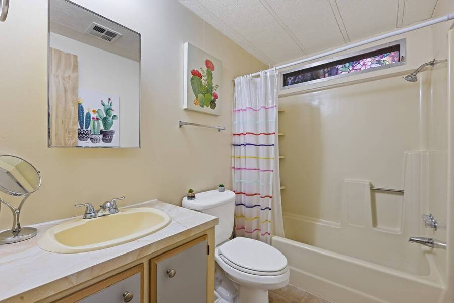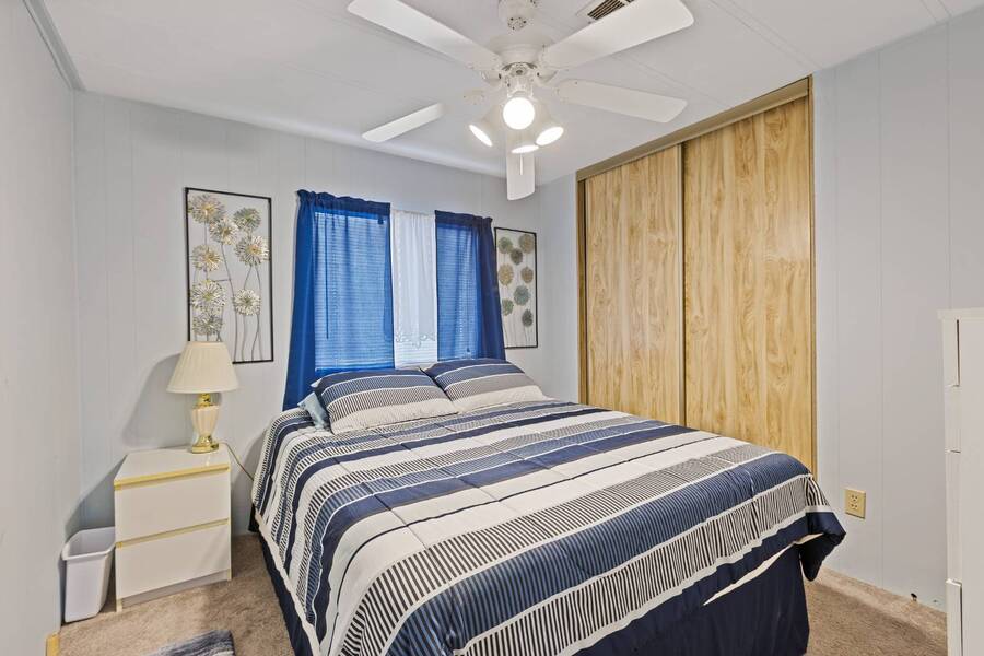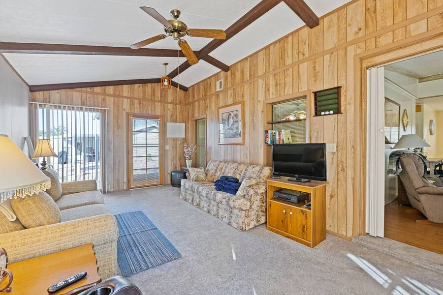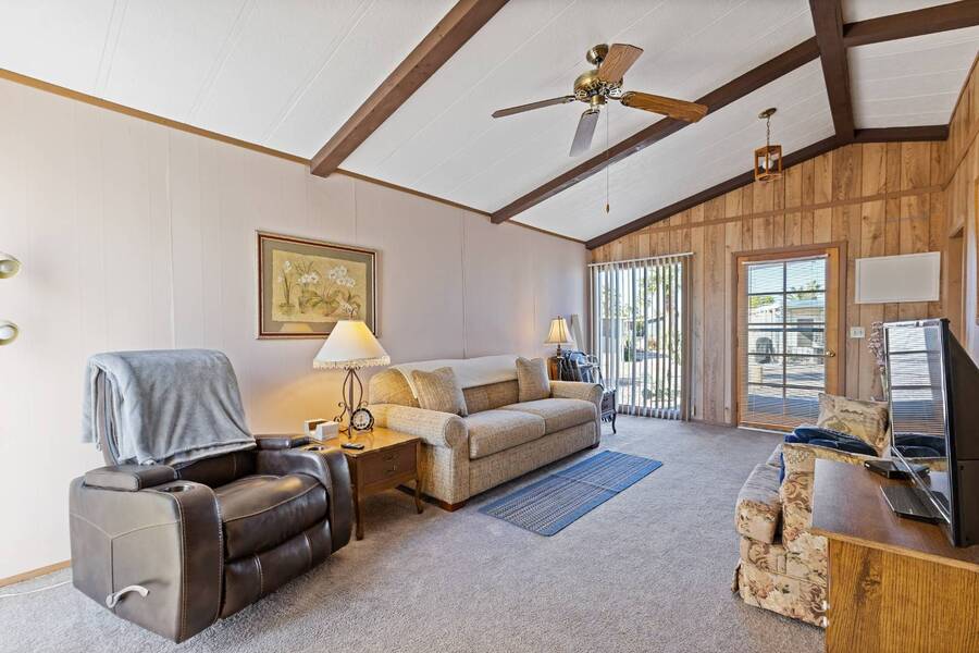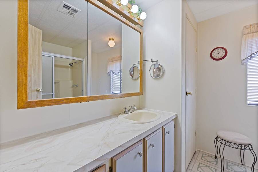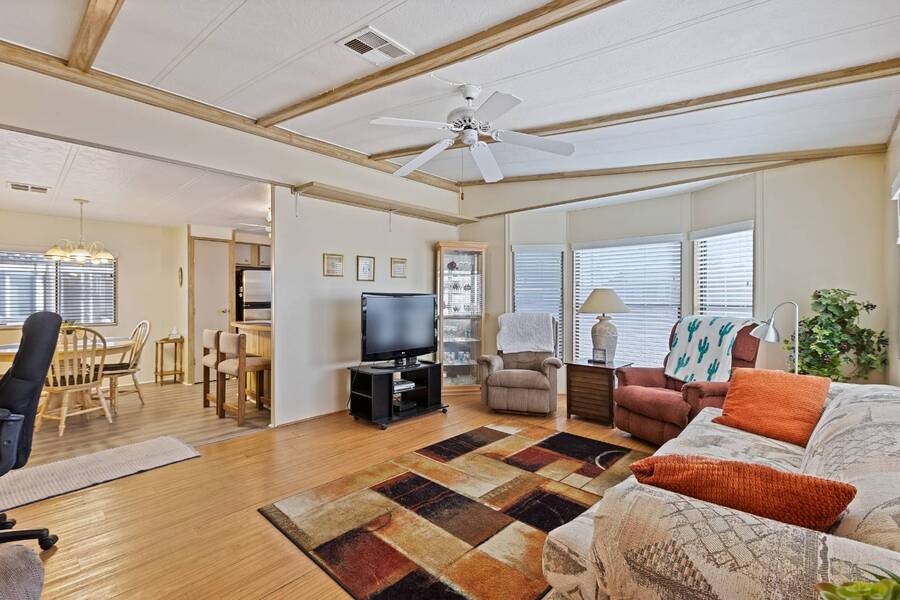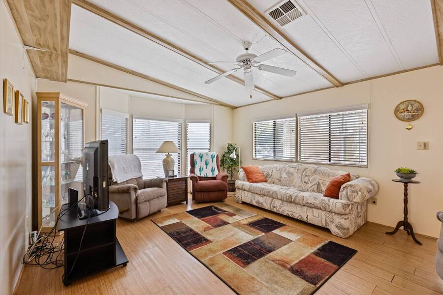 Well-kept 1983 Palm Harbor on a rare, oversized perimeter lot in a quiet cul-de-sac. This fully furnished home offers 1,144 sq ft with an open kitchen and breakfast bar, updated flooring in the kitchen and dining area, and new carpet in the bedrooms. Spacious living room with large windows and great natural light. All-seasons Arizona room provides generous additional space for year-round enjoyment and overlooks the extra-large lot, offering added privacy and excellent outdoor potential. Interior and exterior recently painted. Move-in ready! Fresh interior and exterior paint |New vinyl flooring | W/H- 2019 Experience the Thesman Lifestyle, we are an active 55 plus land lease community where luxury meets affordability. For over 40 years we have set the standard with world class amenities and year-round activities. Our community features a gated community, with a beautiful clubhouse including ballroom, library with computers and individual rooms for cards, billiards, arts & crafts and fitness center. Enjoy outdoor amenities heated pool & spa, BBQ area, pet park, sport courts for shuffleboard. Our activities director assures a full calendar of social and recreation events. Our shuttle bus makes it easy and convenient to attend sporting and special events, plus local shopping. Whether you want to relax or stay active our vibrant communities offer everything you need to enjoy life to the fullest. Start living the Thesman Lifestyle today!