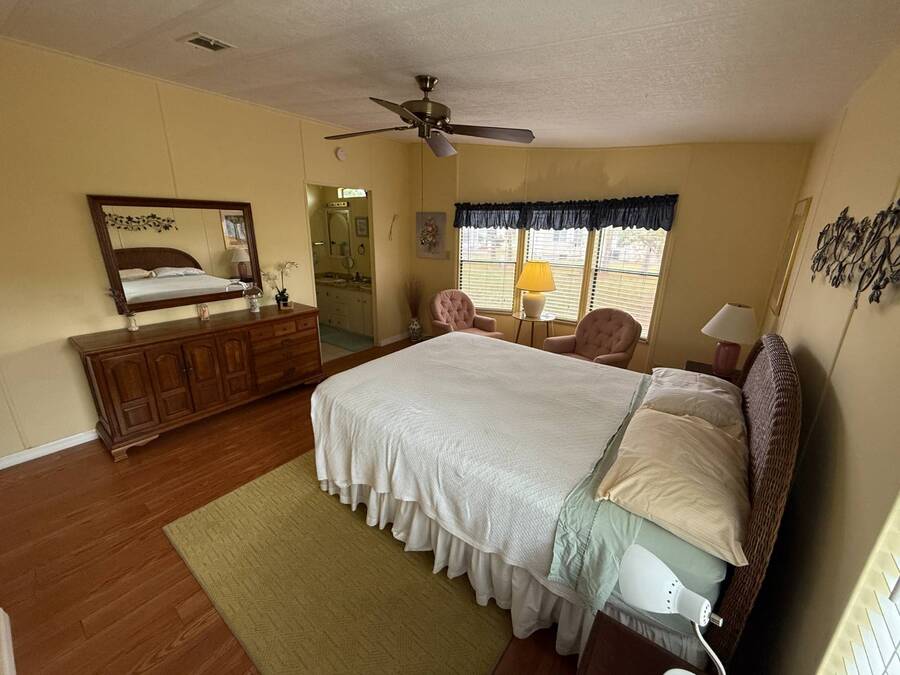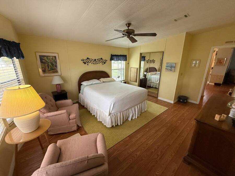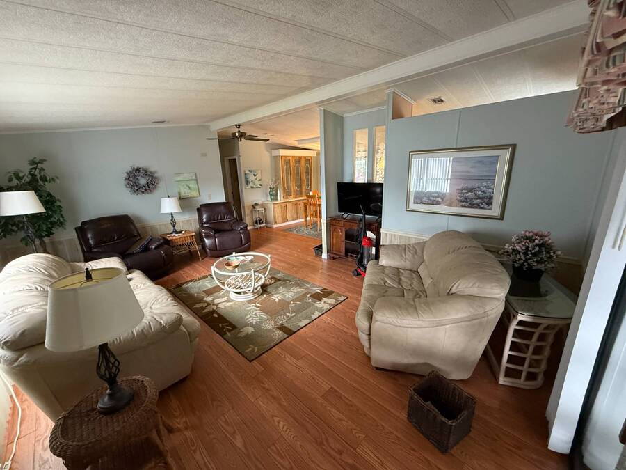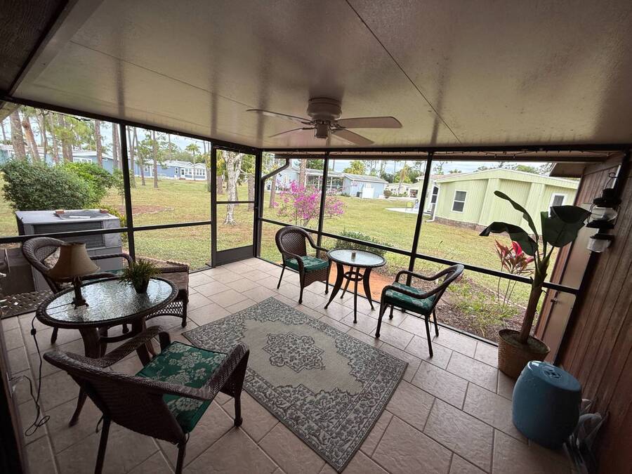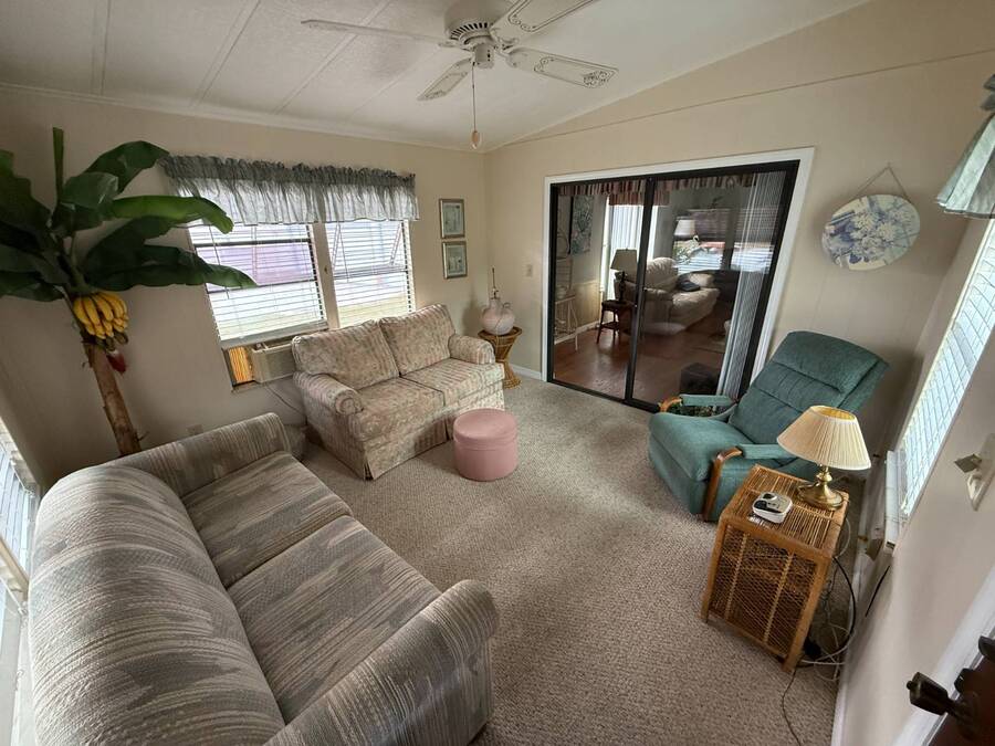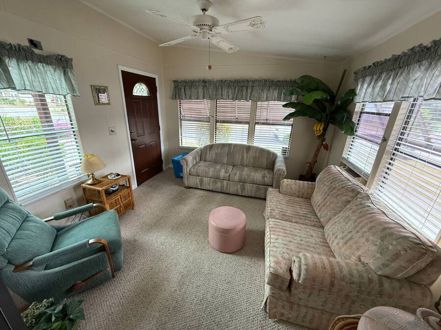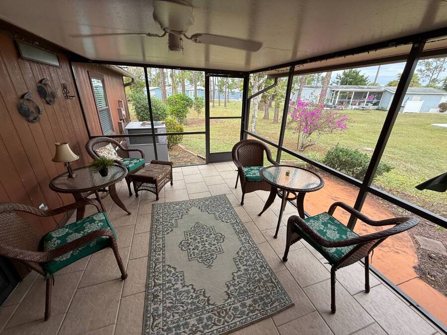 This well cared for 2-bedroom, 2-bathroom home is being sold furnished. The home is located on a quiet street just a few houses down from one of the five pools in the community. When you arrive at the home, you will see the tasteful landscape, shutters on the front of the home, gutters around the home, and a covered front entryway. As you enter the home, you are in the front sitting area with plenty of seating, carpet floors, and a ceiling fan. The primary living area has plenty of additional seating with natural lighting from the windows. The dining area has a table with chairs, a built-in hutch, trey ceilings with a pendant light. The kitchen has lots of cabinets, a breakfast table, and a ceiling fan. The guest bedroom has a bed with furniture, a large closet, and a ceiling fan. The guest bathroom has a single sink vanity, tub with shower, linen cabinet, and tile floors. The primary bedroom is a large room with a queen bed, furniture, a wall closet, and a ceiling fan. The primary bathroom has a large double sink vanity, with a walk-in closet, and separate room for shower. The lanai is a great area to relax and enjoy the Florida weather. This is a screened room with tile floors, a ceiling fan, and table with chairs. UPDATES: Roof (2018) Only a few minutes to one of the five pools & hot tubs, clubhouse, & fitness center as well as tennis courts, pickleball courts and golf course. This community has a full social calendar and activity schedule. Plenty to keep you busy! This is a 55+ (very active) community. Come join this luxury lifestyle community. YOU WON'T BE DISAPPOINTED!!