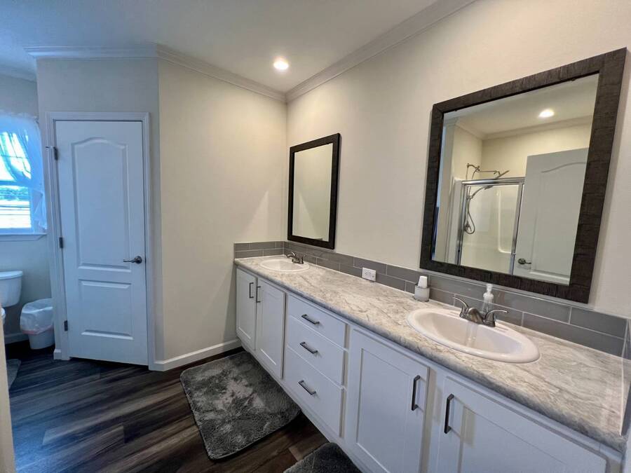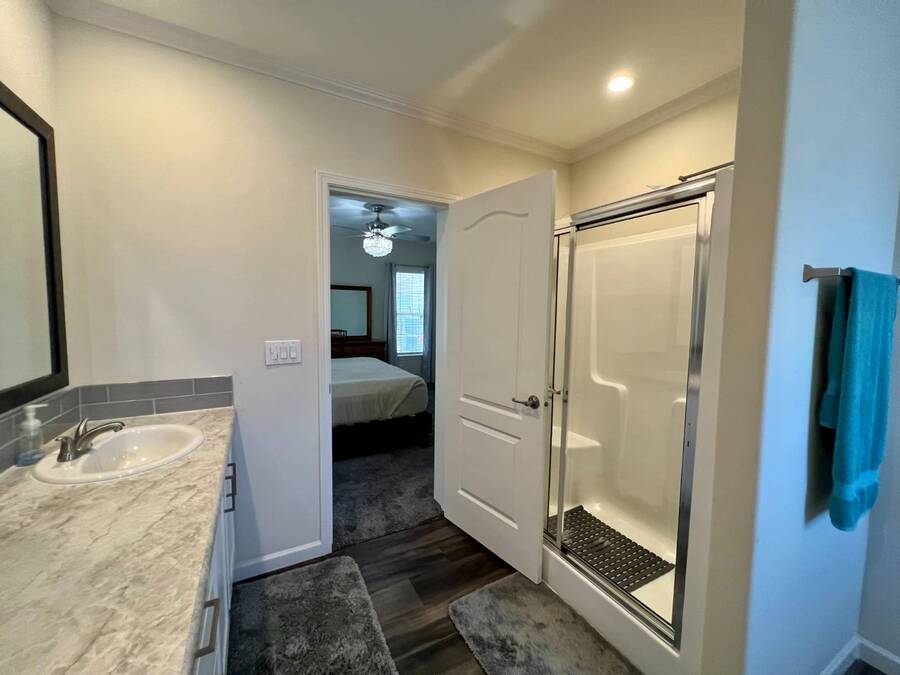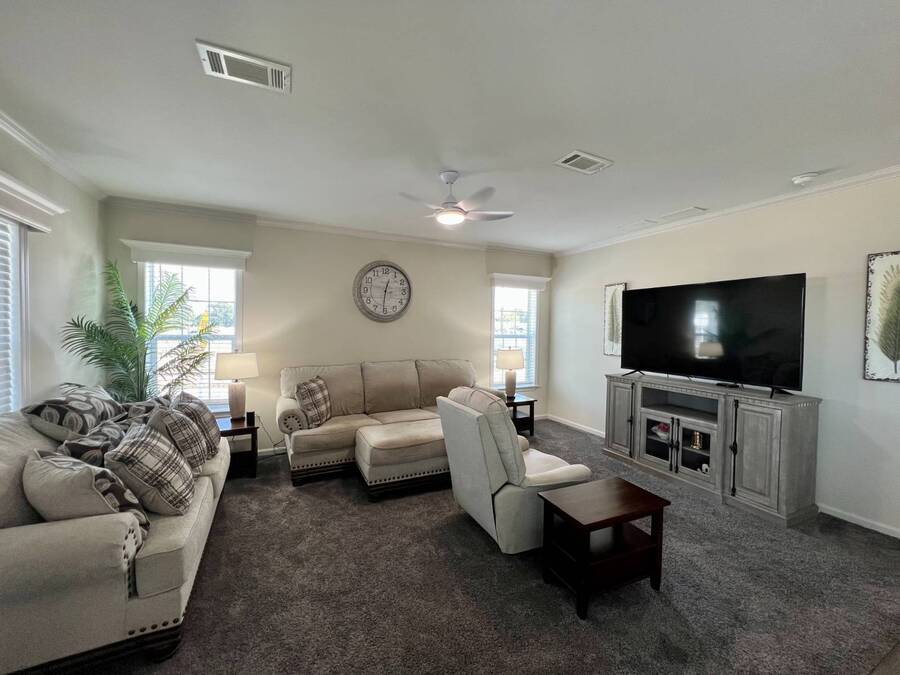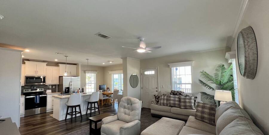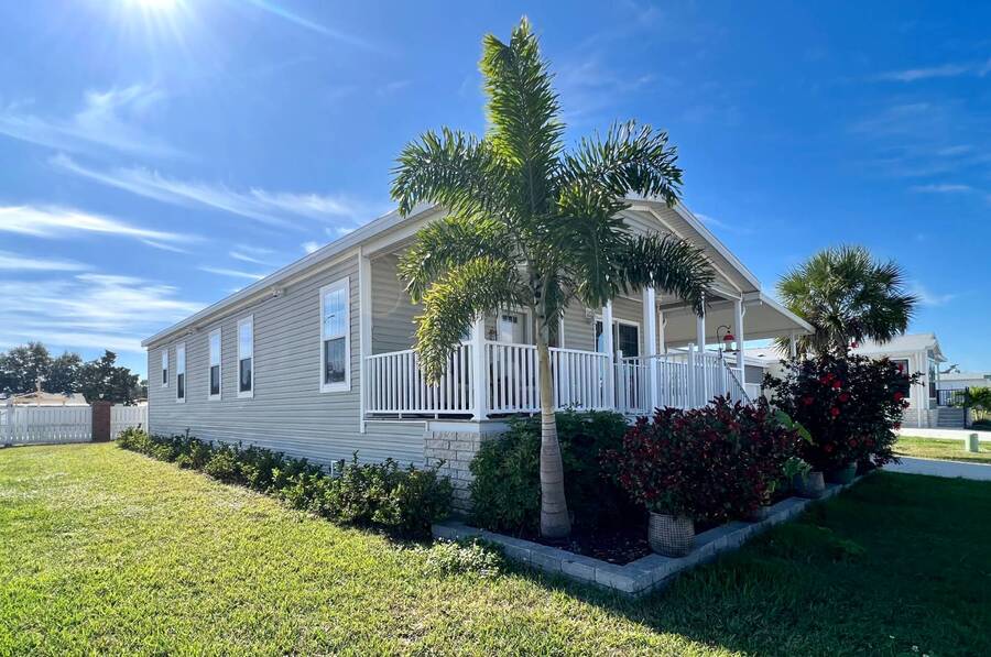 Welcome to 1619 Voyager Drive, Lot 333, Sarasota, FL 34234, located in Winds of St. Armands South, a brand new section featuring only 56 homes within this sought-after 55+ community. This exceptional custom home includes over $28K in upgrades, plus a seller incentive of 3 months FREE lot rent with all reasonable offers. This impressive 3 bedroom, 2 bath home offers 1,478 sq. ft. of open concept living along with a spacious screened lanai and oversized covered front porch. From the moment you arrive, the oversized corner lot and lush tropical landscaping create outstanding curb appeal. Inside, the gourmet kitchen serves as the heart of the home, showcasing custom white wood cabinetry with tall uppers and decorative crown molding, mosaic tile backsplash, and beautifully coordinated countertops. A large eat-in island features a stainless farmhouse sink with a gooseneck faucet, additional storage, and a built-in stainless dishwasher. Pendant lighting and energy-efficient stainless appliances complete the space, including a smooth top range, side-by-side refrigerator, and an over-the-range microwave. Decorative sliding glass doors open directly to the front porch, blending indoor and outdoor living. The spacious primary suite offers a private retreat with an ensuite bath featuring double porcelain vanities with tile backsplash, a fiberglass shower, and walk-in linen closet. Guest bedrooms are generously sized, one featuring a high-end queen Murphy bed concealed within custom cabinetry, allowing the space to easily convert into an office, craft room, hobby space, or guest suite. The shared guest bath includes a porcelain vanity and a tub and shower combination with upgraded fixtures. Additional interior upgrades include decorative crown molding throughout, drywall, double-pane windows, wide plank laminate flooring throughout excluding bedrooms and living room, which are carpeted, upgraded two-panel interior doors with lever hardware, professional interior paint, and detailed trim work. Every room features upgraded remote-controlled ceiling fans, with two upscale 52" fans. The finished interior laundry and side entry area includes a 2022 Whirlpool washer and dryer and a storage closet. Exterior features are equally impressive, beginning with a new roof installed in November 2024, featuring 30-year architectural shingles and a transferable 10-year warranty. The attached screened lanai measures 12 x 14 and includes front and rear access, GFI outlets, a wall-mounted TV bracket, and curtain rods for added privacy and shade. A standout feature is the oversized detached 10 x 12 detached shed/workshop, which is grandfathered in and code-compliant. This structure includes new hurricane-resistant anchors and tie downs, GFI outlets, double-wide doors, a pitched roof, a metal vented slab, abundant natural light, and ample space for a golf cart and workbench. An additional attached 8' x 8' shed provides even more electric powered storage. This home is equipped with a functioning Rainbird 4-stage irrigation system with 18 heads, rain sensor, and full coverage. A whole house Champion 9,000-watt generator with a dedicated outdoor electrical outlet is capable of powering the entire home during outages. A comprehensive home security system includes window and door sensors, six exterior cameras, motion activated flood lights, and dusk-to-dawn porch and carport lighting. The composite two car covered carport and driveway provide ample off street parking for vehicles and a golf cart. Residents enjoy exceptional community amenities including two heated pools and spa, a fitness center, a clubhouse, pickleball and shuffleboard courts and FREE boat and RV storage. The community is pet-friendly and offers a full monthly calendar of activities. Complimentary weekly bus service is provided for shopping and beach outings, along with monthly casino trips.