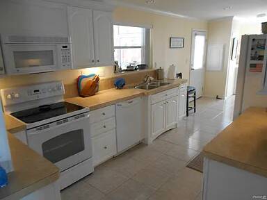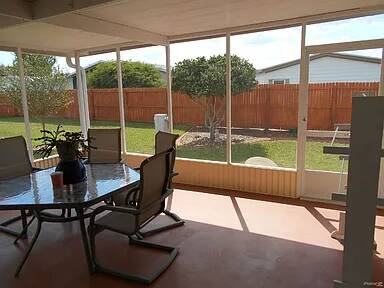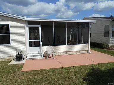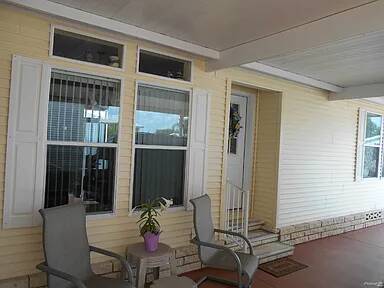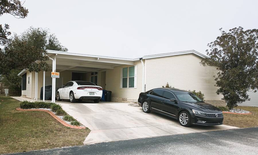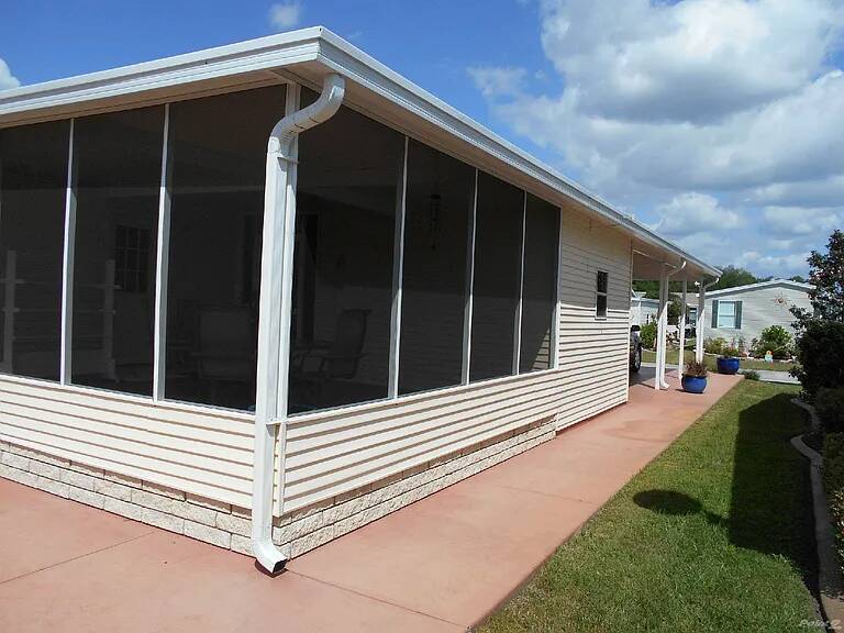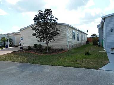 This is a 2006 Palm Harbor home. Bedrooms: 3 | Bathrooms: 2 | Style: Unfurnished, Spacious Home, Home Highlights - Beautifully landscaped lot with decorative curbing and sidewalks, Large, furnished home featuring porcelain tile and wooden flooring. Screened Florida room overlooking a private, fenced backyard, Two-car carport plus golf cart garage and storage shed with workbench. Interior Features - Kitchen: Porcelain tile flooring, Side-by-side refrigerator with dispenser. Glass-top range with self-cleaning oven, microwave, dishwasher, garbage disposal, Under-cabinet lighting, canned lights, Huge walk-in pantry with in-wall spice rack. Extra cabinets and open layout to dining room. Dining Room: Carpeted flooring, chandelier, marble window sills. Living Room: Ceiling fan, vertical blinds, marble window sills. Bedrooms: All bedrooms feature carpeted flooring, marble window sills, ceiling fans, and large walk-in closets, Master suite includes a spacious walk-in closet and en-suite bath. Bathrooms: Master bath with tiled shower, high-rise commode, long vanity, grab bars, and linen closet, Main bath with step-in shower and sliding glass door. Laundry Room: Washer, dryer, utility closet, porcelain tile flooring. Outdoor & Additional Features.