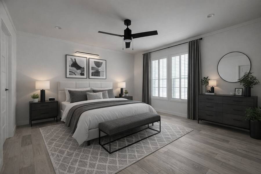 Retreat to the serene Primary Suite, featuring a spacious walk-in closet and a beautifully designed ensuite bathroom with a double-sink vanity, a step-in shower, and a convenient linen closet. Two inviting guest bedrooms sit just across the hall from the guest bathroom, which includes a classic tub/shower combo, ideal for guests or everyday comfort.