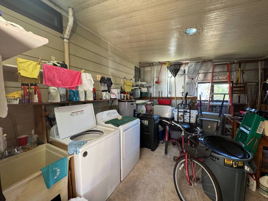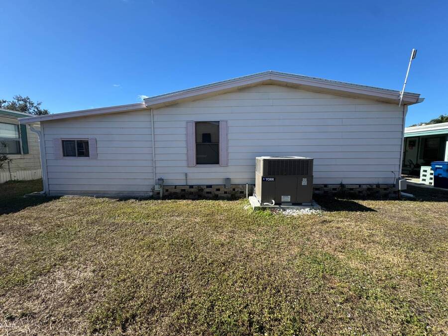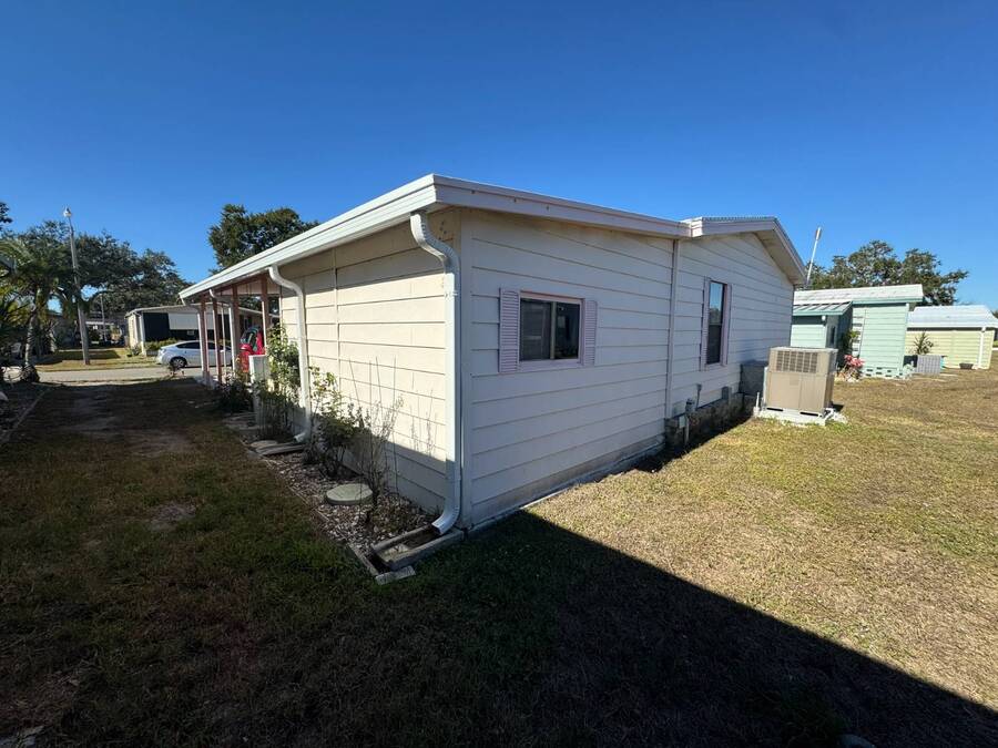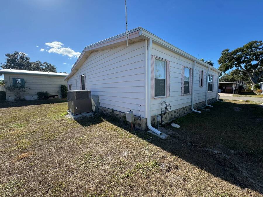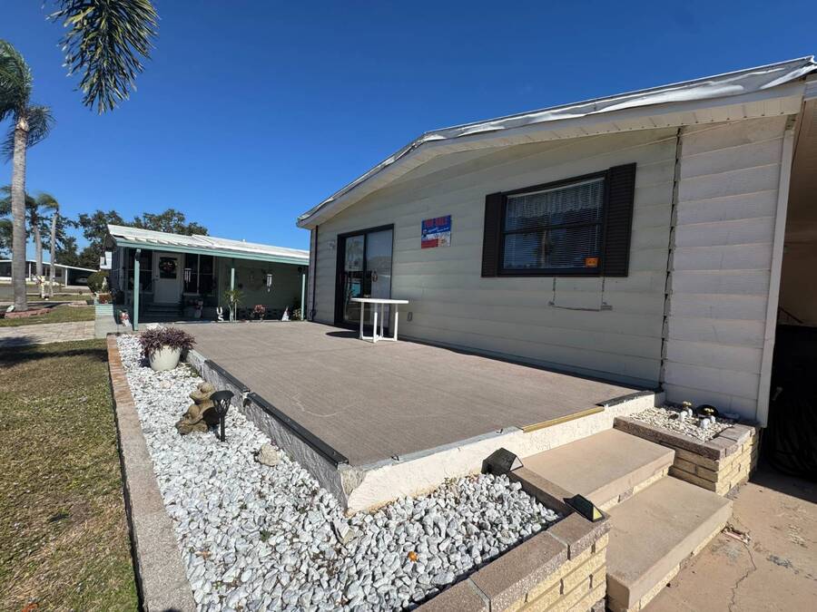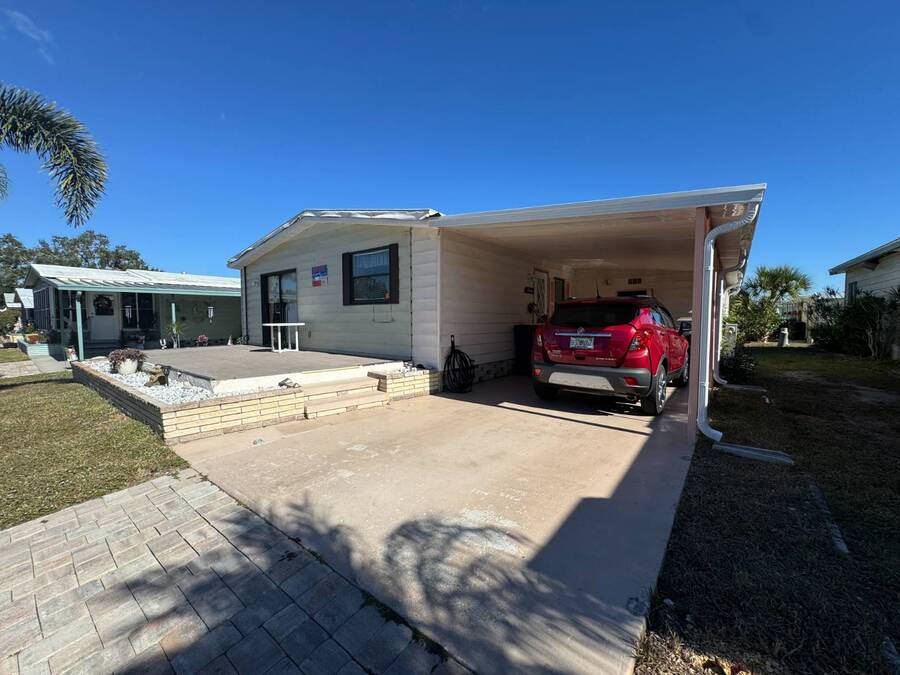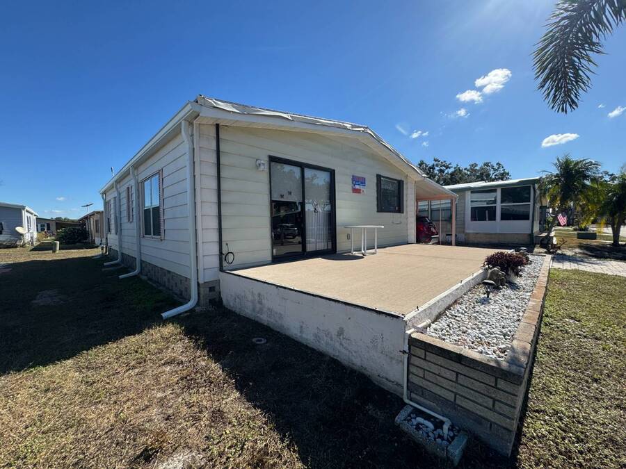 55+/2BED2BATH/1984/864SQFT/LOT.RENT.$1260/LAUNDRY/FRONT.PATIO BIG UPDATES SINCE 2021: FLOORS 2021 + TPO ROOF, AC, PLUMBING (ALL POLYBUTYLENE REMOVED / UPDATED) & HOT WATER HEATER 2022 + WASHER& DRYER 2023+2024. Step through the front sliding glass doors and you're immediately welcomed by a bright, comfortable living room filled with natural light. The living area flows into the kitchen, where a U-shaped layout and L-shaped wraparound bar make everyday living and hosting effortless. Just beyond the kitchen, the designated dining area features a built-in cabinet, adding both character and extra storage. Down the hall, the spacious primary bedroom offers a large walk-in closet and a private ensuite bathroom with a step-in shower and large vanity. The secondary bedroom is generously sized with mirrored sliding closet doors and is conveniently located near the guest bathroom, which includes a tub/shower combo and a large vanity. Throughout the home, you'll find plenty of storage and thoughtfully designed spaces that offer both comfort and room to unwind. Outside, the home continues to impress with a long driveway, carport, and a covered patio area beneath the carport-ideal for enjoying the Florida breeze. A HUGE workshop-style shed provides storage and includes the laundry area, making it both functional and versatile. The front screened porch was removed after storm damage in 2024; however, the foundation remains, and the sliding glass door still serves as a welcoming front entry into the home. Finished with front garden beds and an Irrigation system Included, the exterior offers charm, practicality, and opportunities to personalize the space. Country Lakes Villages 1 offers a peaceful, country-style setting while remaining close to beaches, golf courses, shopping, dining, and local attractions. The community features two maintained neighborhoods (this home being in #1) with scenic lakes, heated pools and hot tubs, expansive clubhouses with full kitchens, libraries, card and game rooms, fitness centers, billiards, and covered patios overlooking the water. Residents enjoy an active lifestyle with pickleball, tennis, shuffleboard, nearby golf courses, and a wide variety of organized clubs and activities, including golf leagues, pickleball leagues, bingo, billiards, cards, crafts, coffee hours, holiday celebrations, live entertainment, karaoke, happy hours, BBQs, social events, group outings, and seasonal activities. Whether you prefer staying active or relaxing by the lake, Country Lakes Villages offers a welcoming community where residents can stay engaged, social, and enjoy the best of Florida living.
